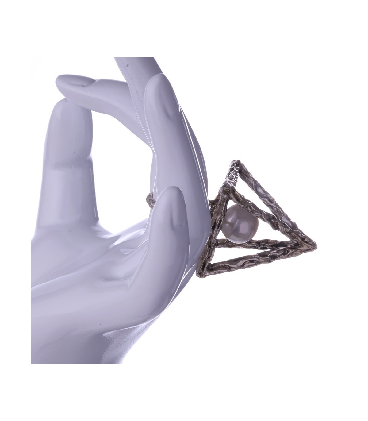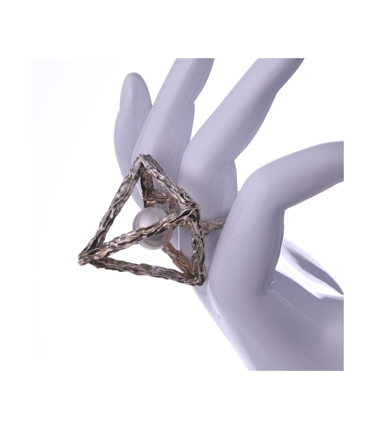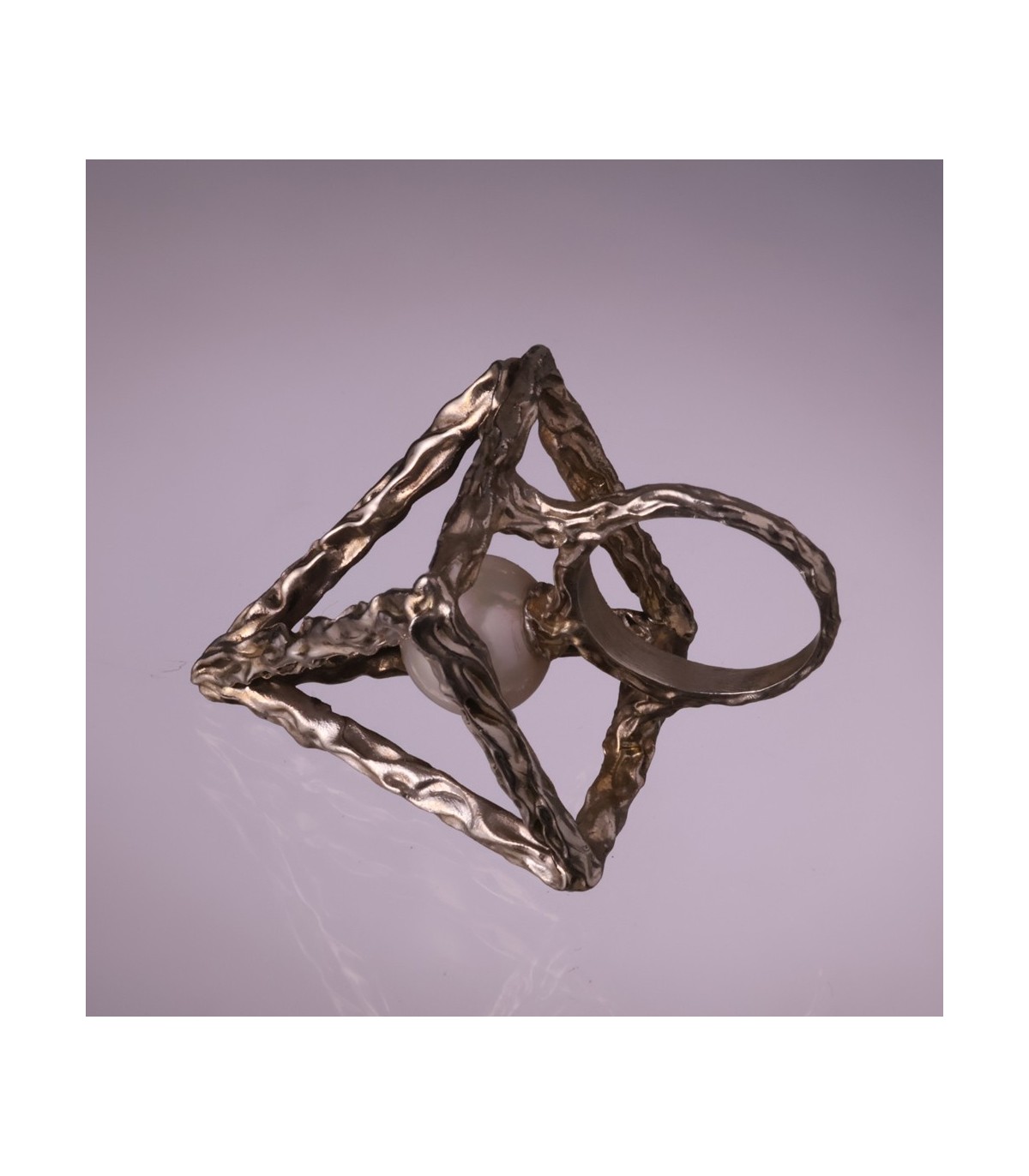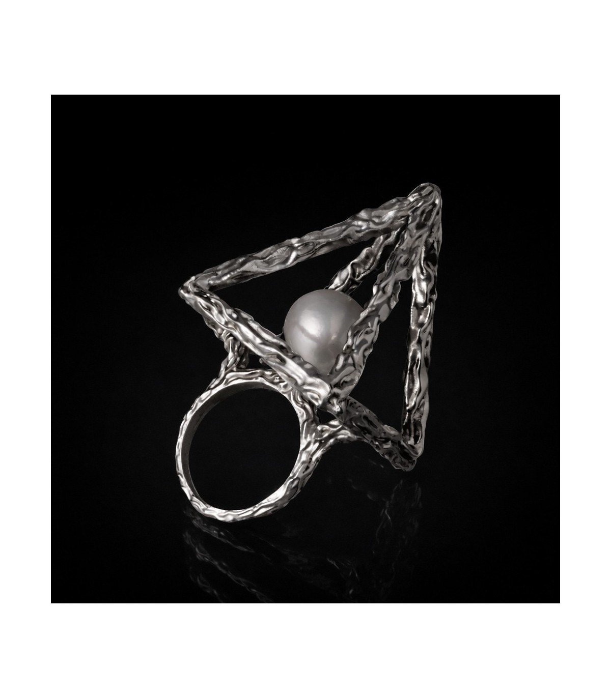 The textured silver surface highlights the handmade nature of the ring, adding depth and individuality to every piece. Thanks to its open construction, the ring feels light and comfortable despite its bold, statement form. Anulus Pyramidis et Perlae can also be worn in different orientations, allowing the wearer to emphasize either the pyramid silhouette or the pearl itself.