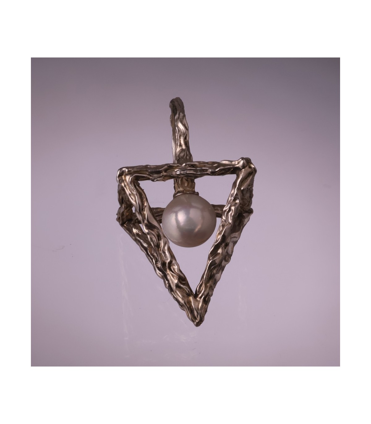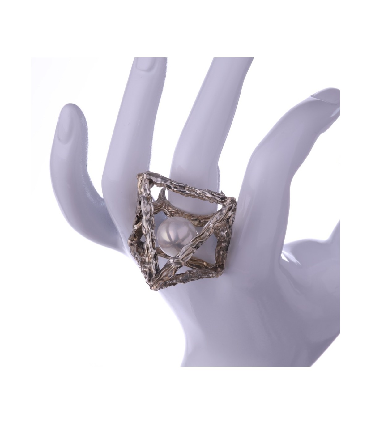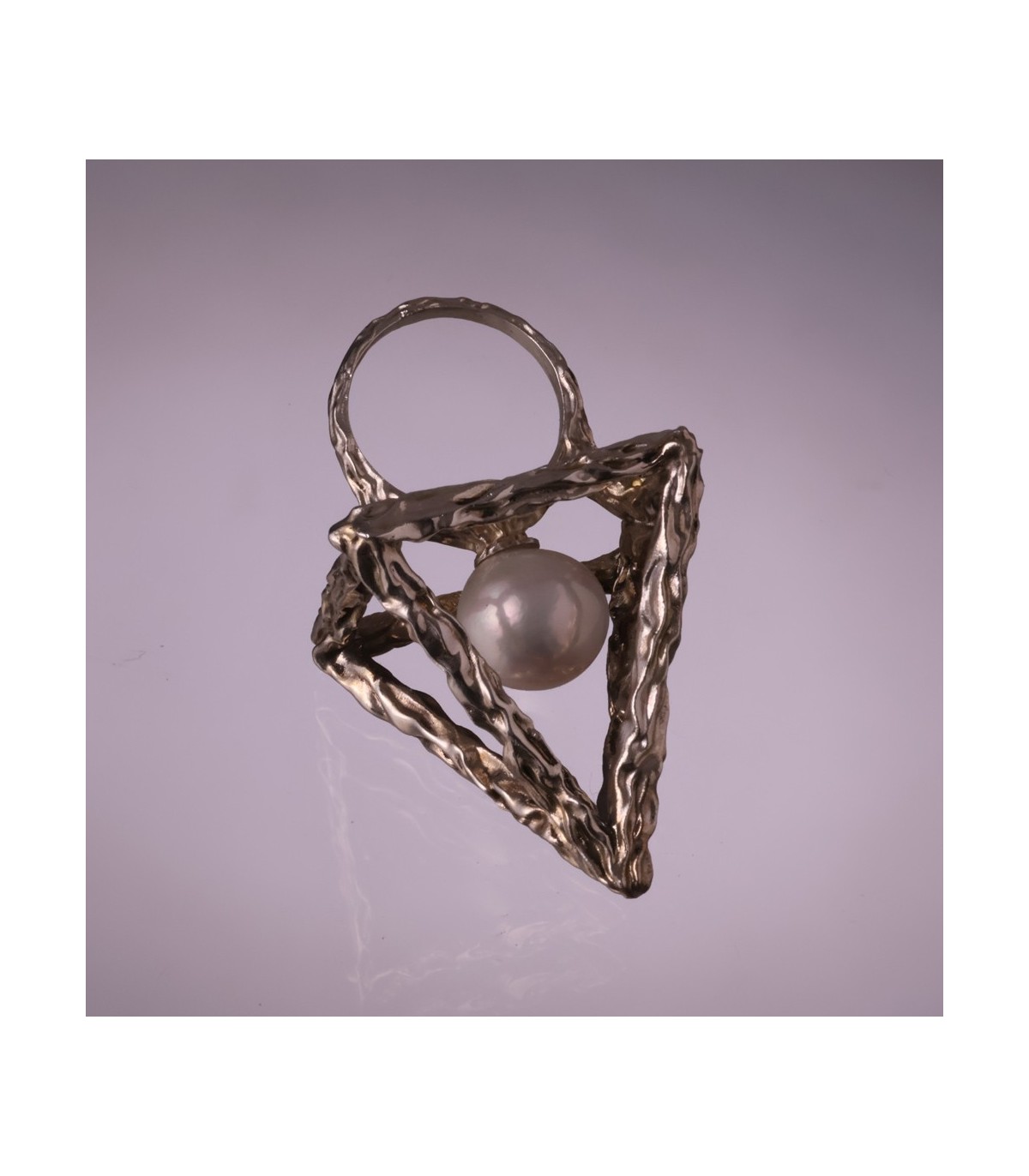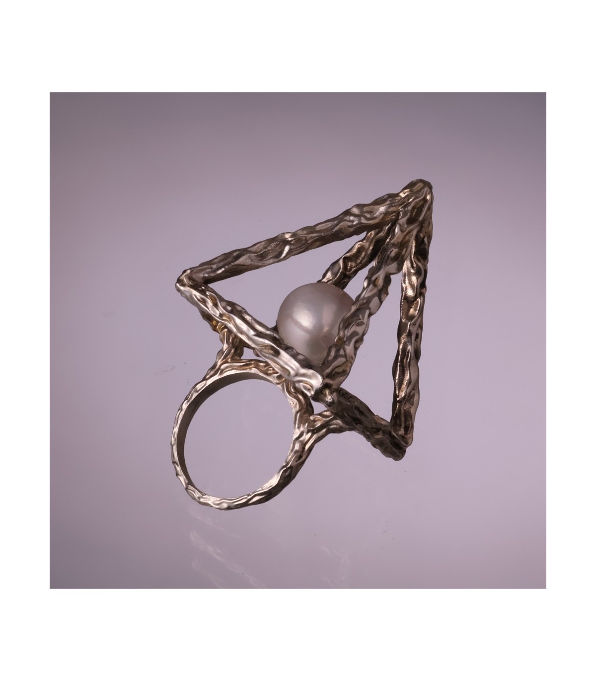 The textured silver surface highlights the handmade nature of the ring, adding depth and individuality to every piece. Thanks to its open construction, the ring feels light and comfortable despite its bold, statement form. Anulus Pyramidis et Perlae can also be worn in different orientations, allowing the wearer to emphasize either the pyramid silhouette or the pearl itself.
