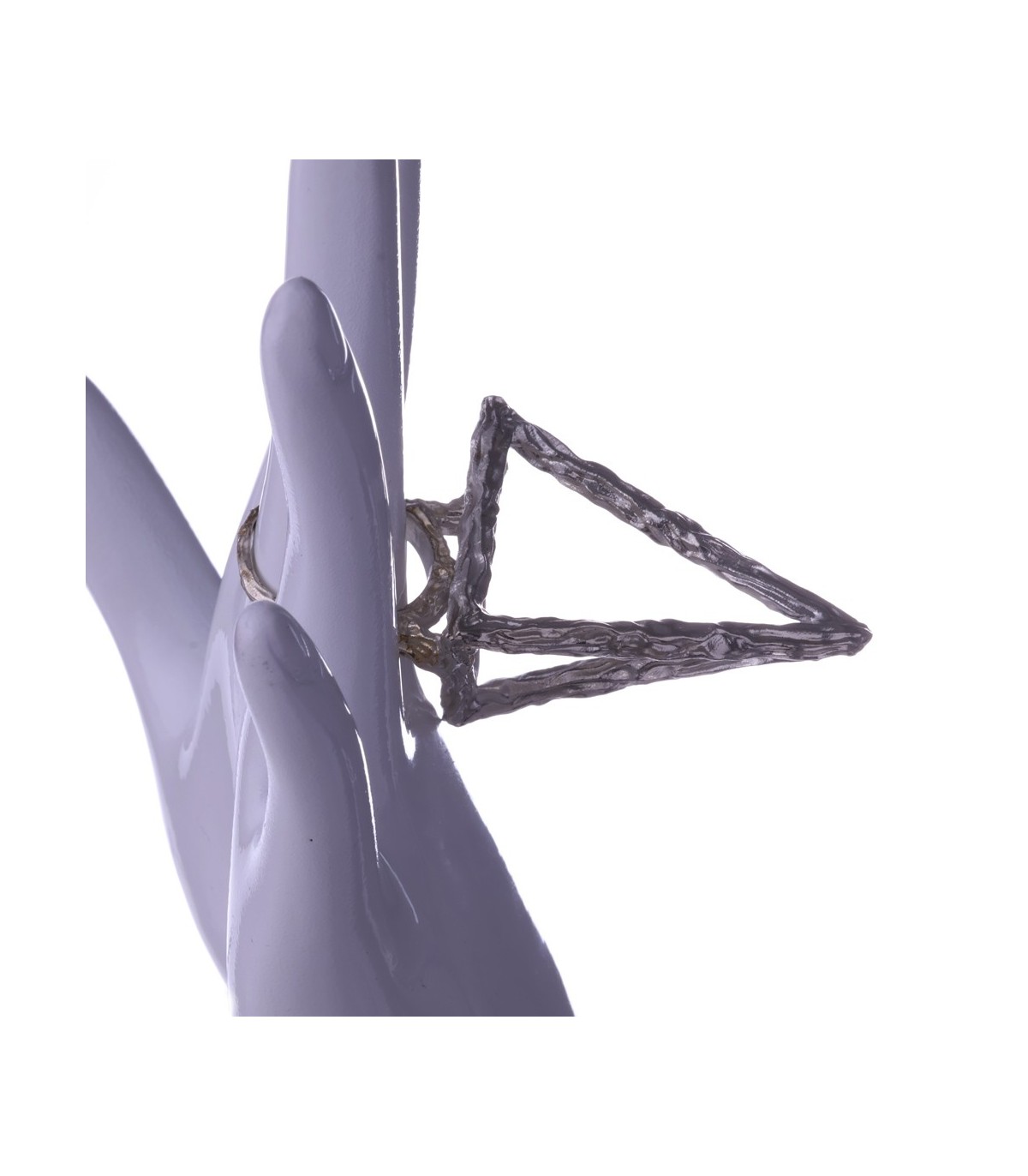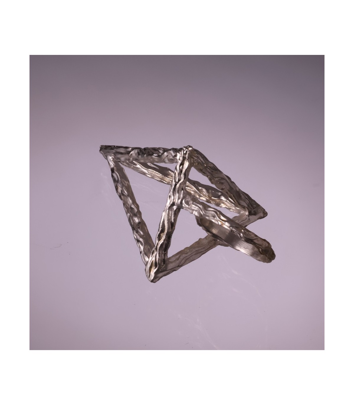 The name comes from Latin: anulus means ring, and tetraedri refers to the tetrahedron. This shape symbolizes balance, stability, and structural harmony, making the ring not only a piece of jewelry but also a wearable symbol of order and form. The open construction allows light to pass through the design, giving it a dynamic appearance from every angle.