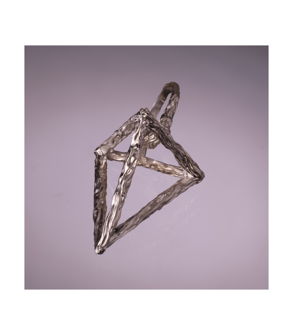 Anulus Tetraedri is a handcrafted silver ring inspired by pure geometric form and minimalist architecture. Its design is based on the tetrahedron – one of the most fundamental three-dimensional shapes – creating a bold, sculptural ring with clean lines and an open, airy structure. The textured surface of the silver emphasizes its handmade character and adds depth to the simple geometry.