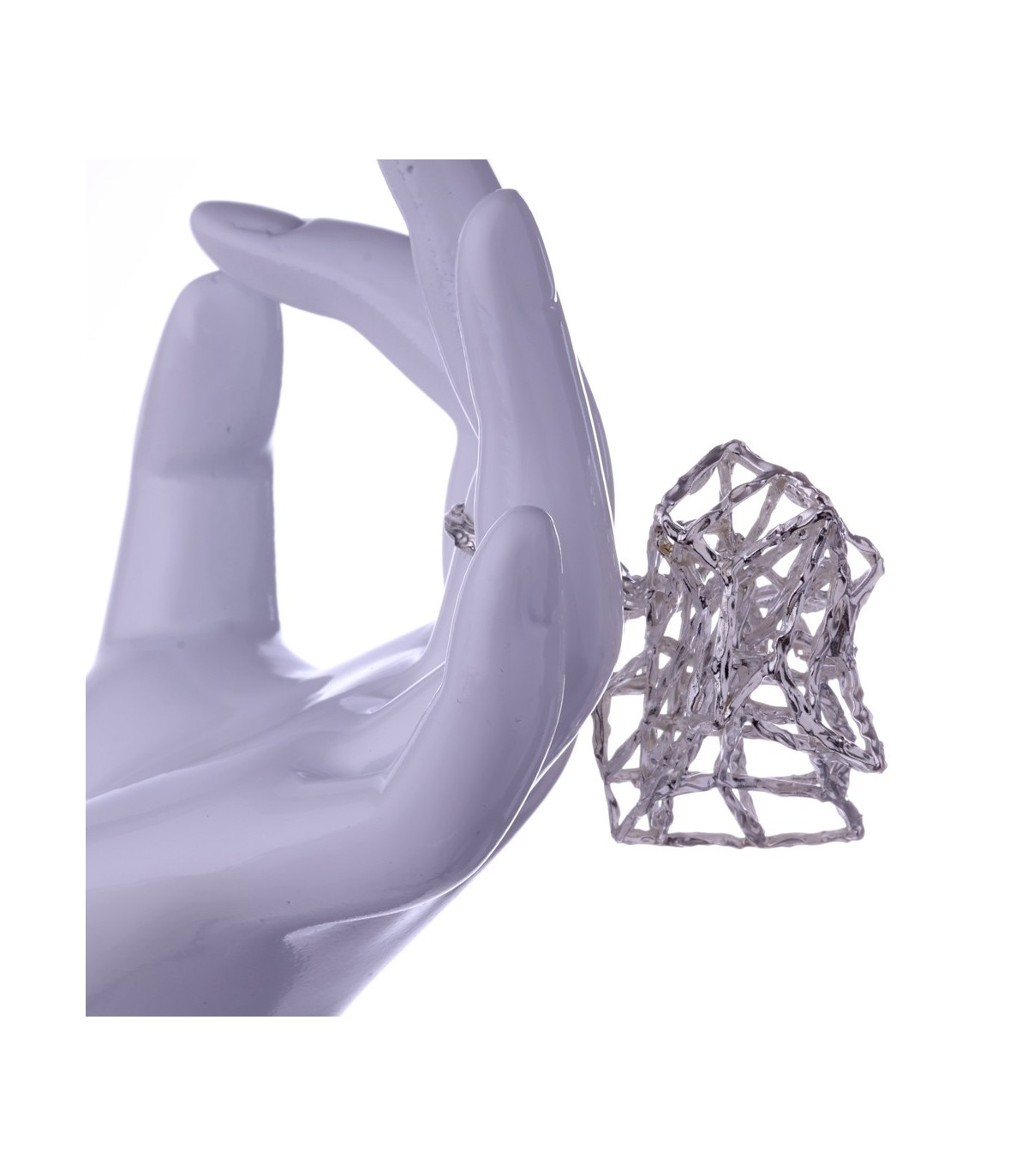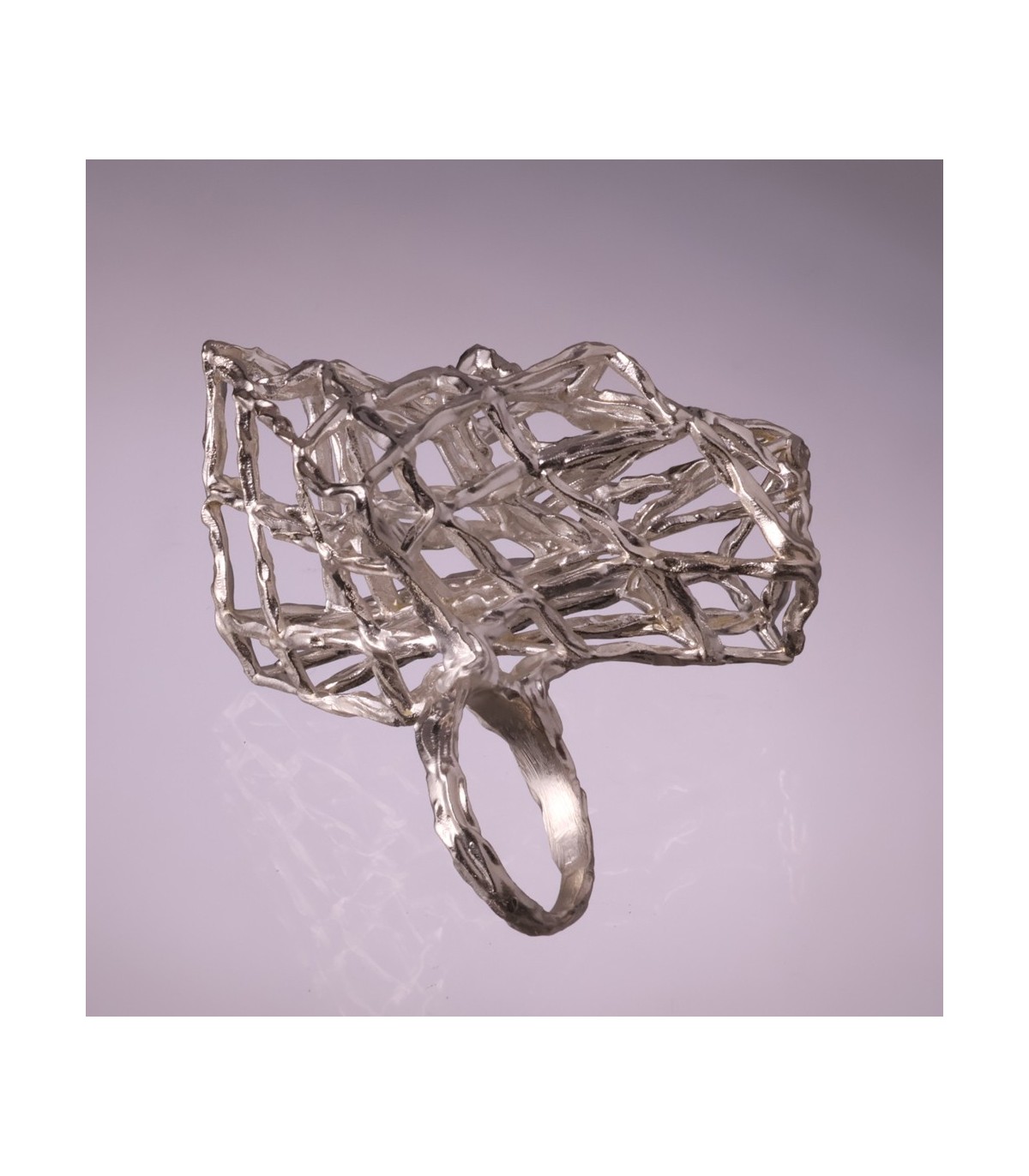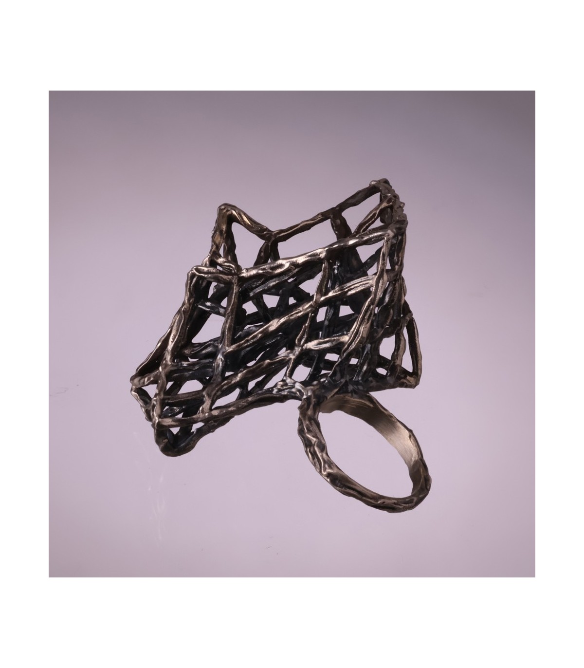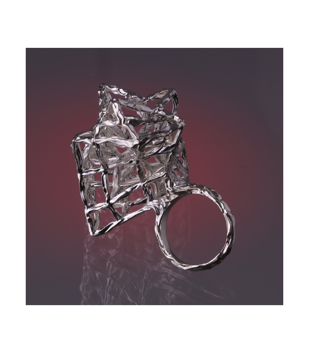 The open cubic construction is created from an interwoven silver lattice forming a three dimensional geometric volume. Light passes freely through the structure emphasizing transparency rhythm and depth. The ring appears both solid and weightless combining strength with visual lightness.