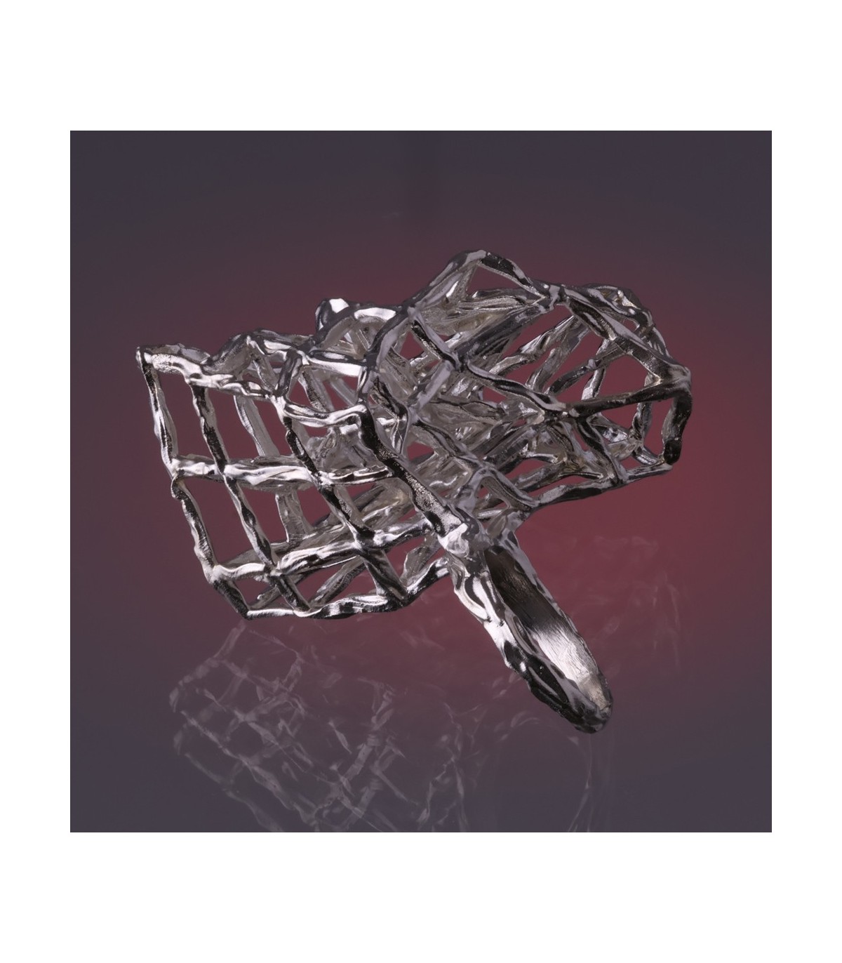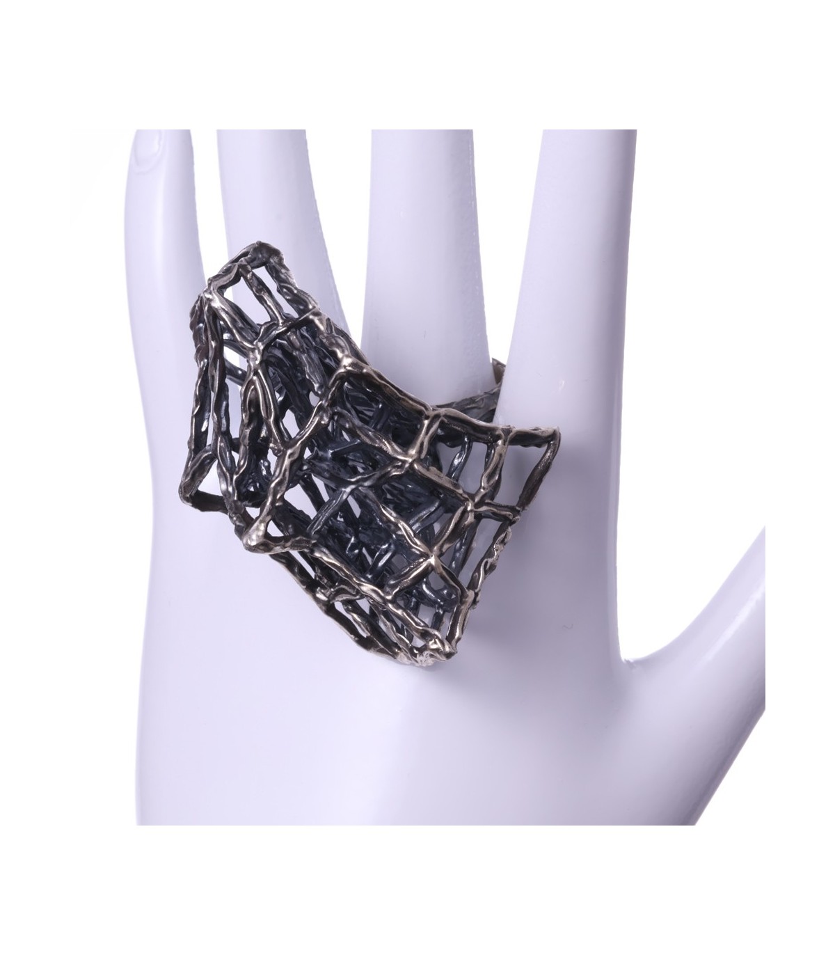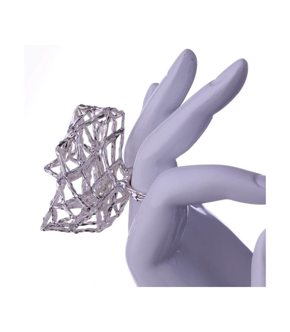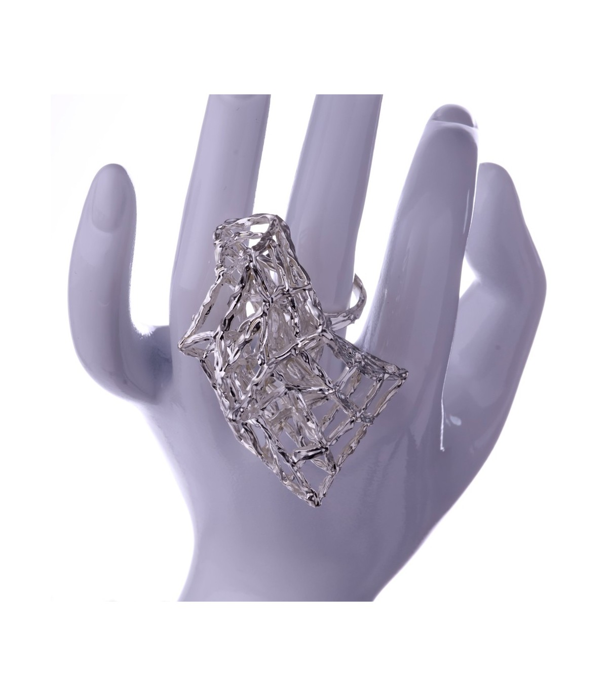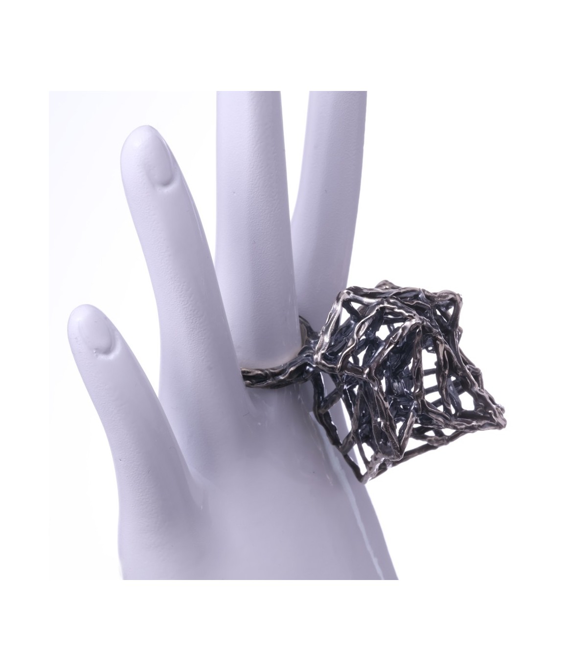 The open cubic construction is created from an interwoven silver lattice forming a three dimensional geometric volume. Light passes freely through the structure emphasizing transparency rhythm and depth. The ring appears both solid and weightless combining strength with visual lightness.