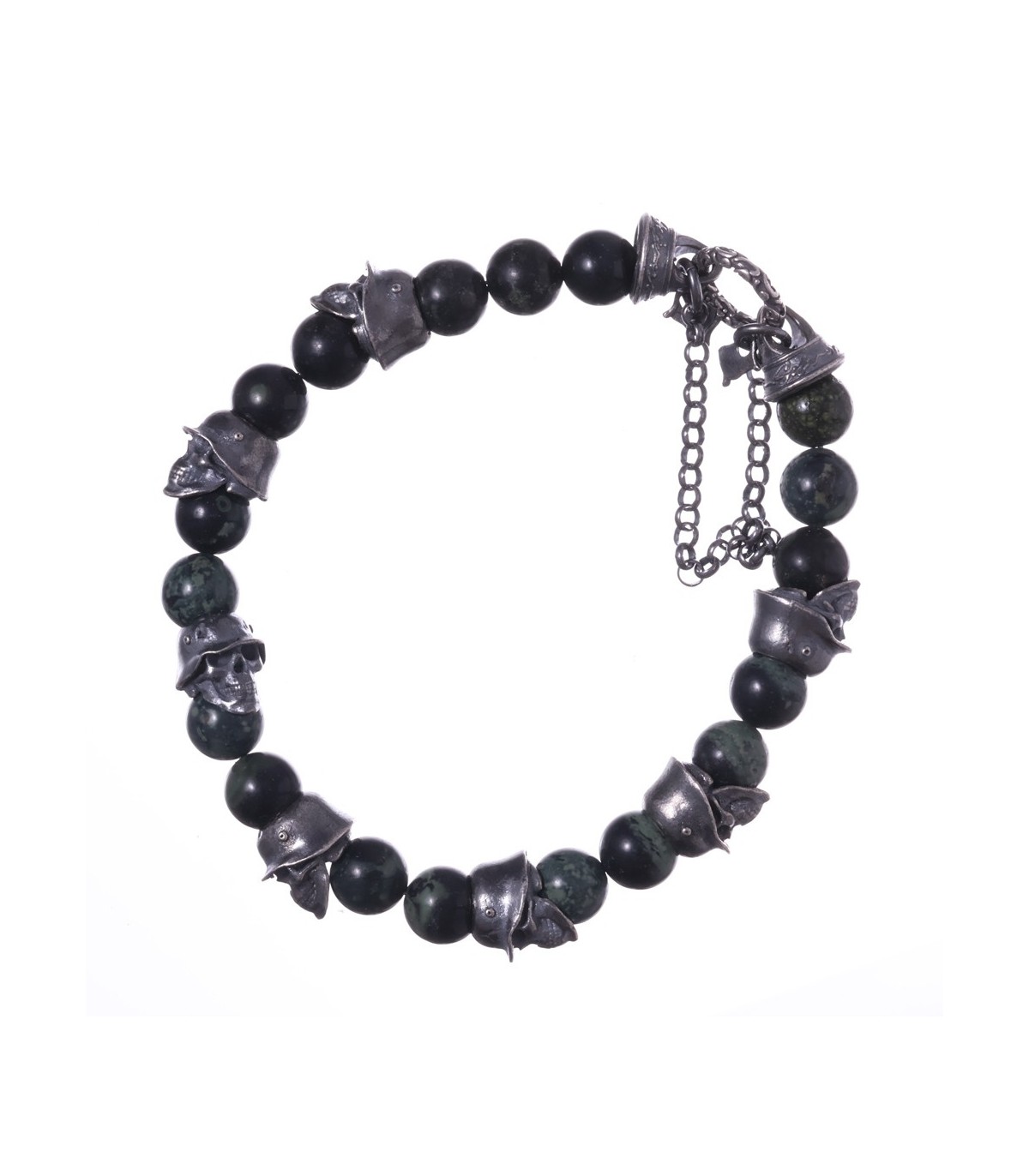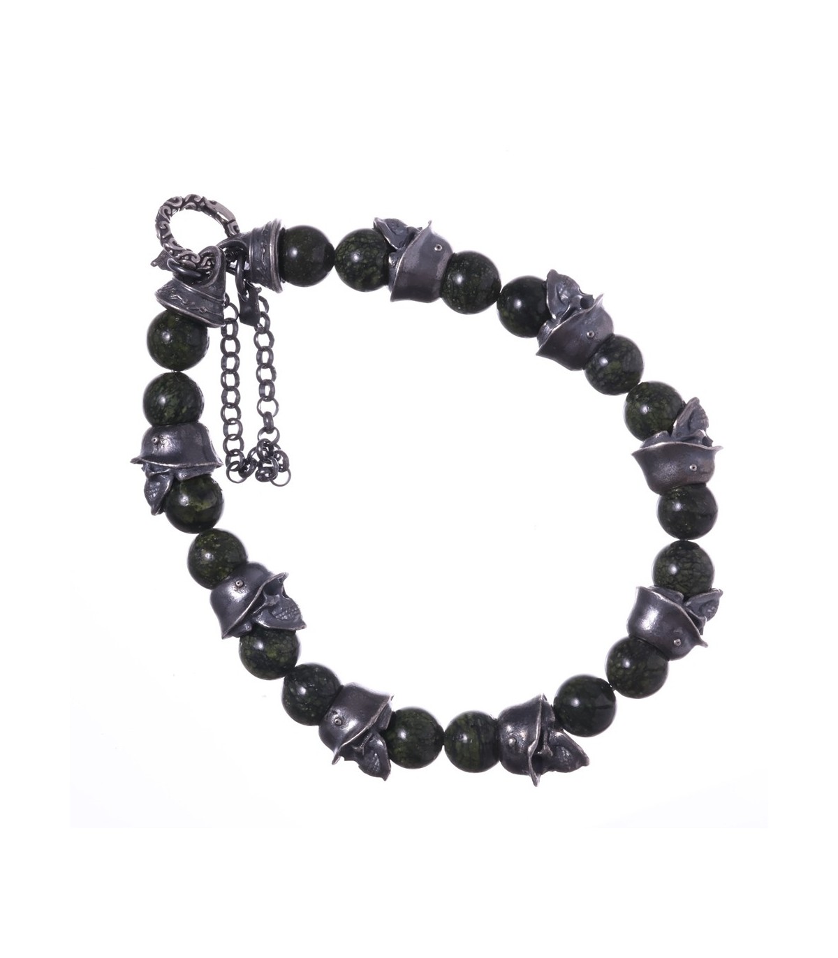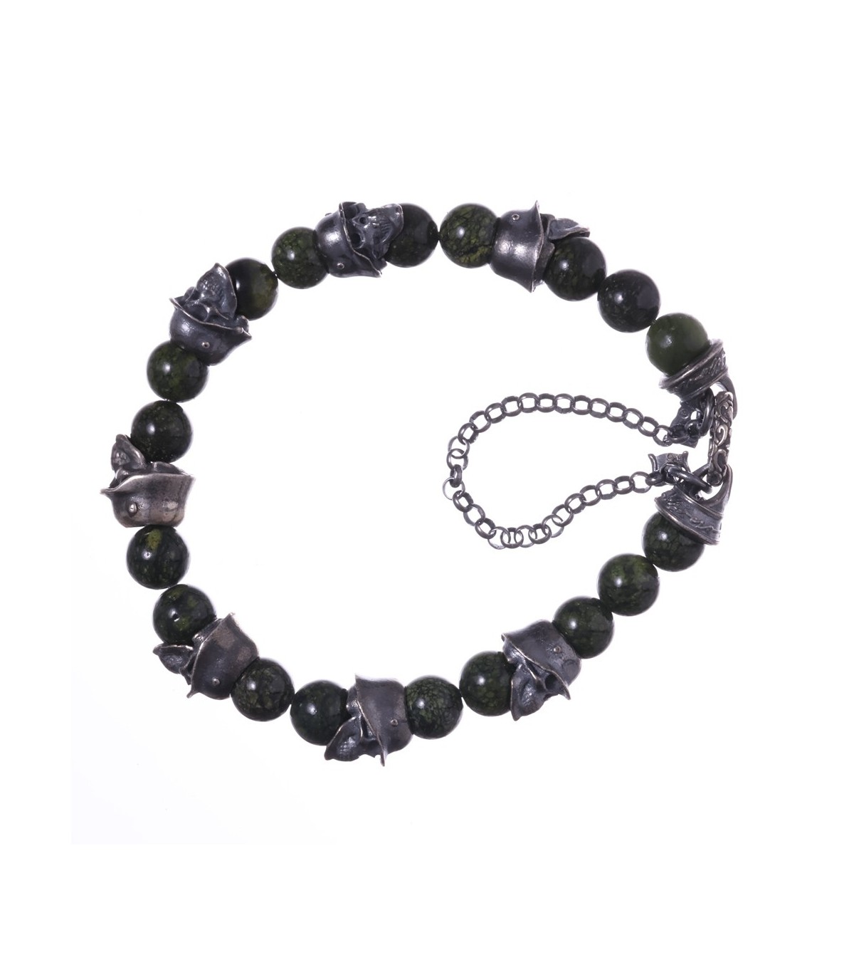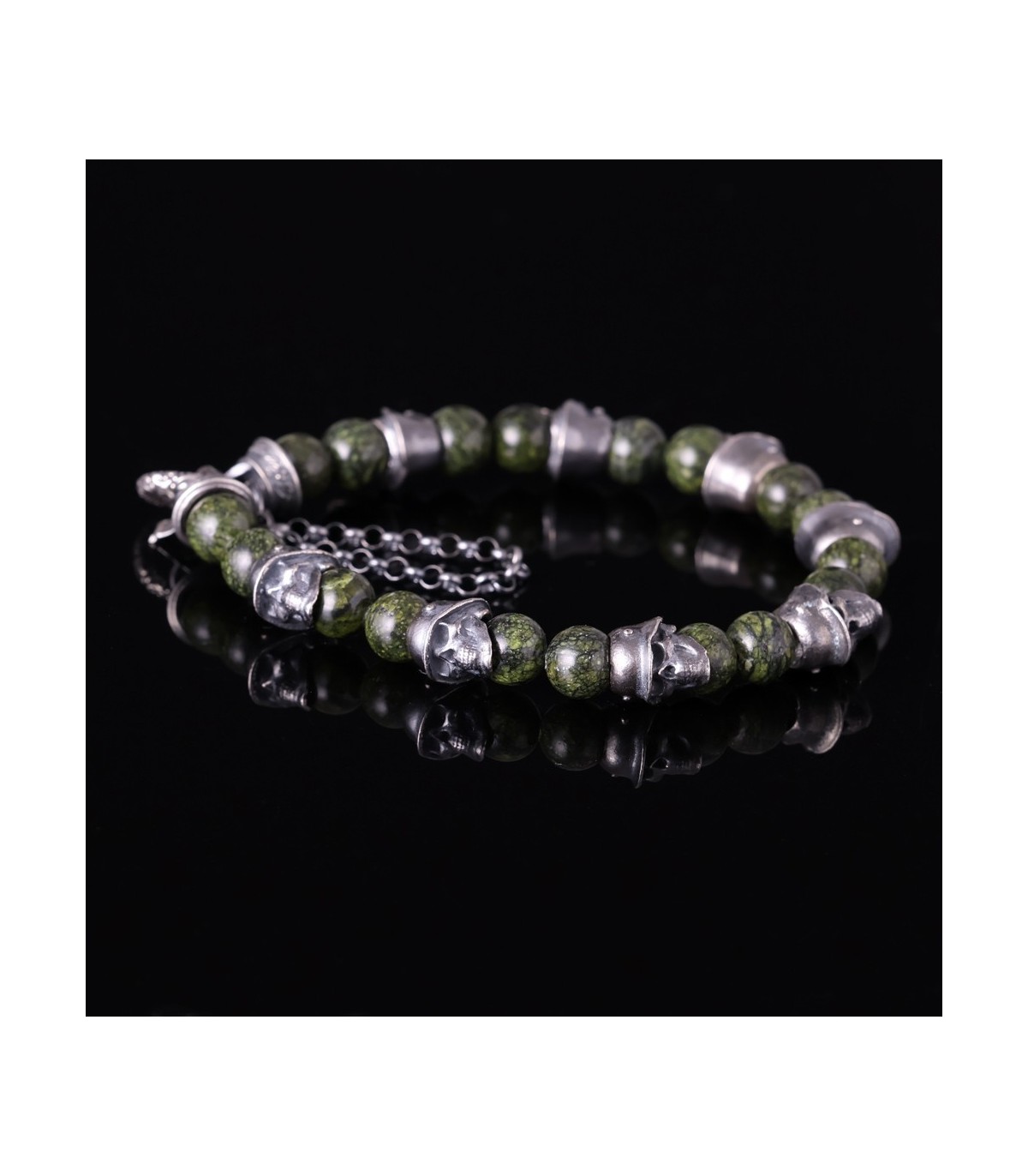 Evocatus is a handcrafted silver bracelet that carries the weight of experience and return. Polished beads of Meihan natural serpentine form a deep green line around the wrist, their organic pattern subtle and alive. Between them appear sculpted sterling silver skulls and silver spacers, darkened and worn in character, giving the bracelet a calm but authoritative presence. It feels balanced, grounded, and quietly confident.
