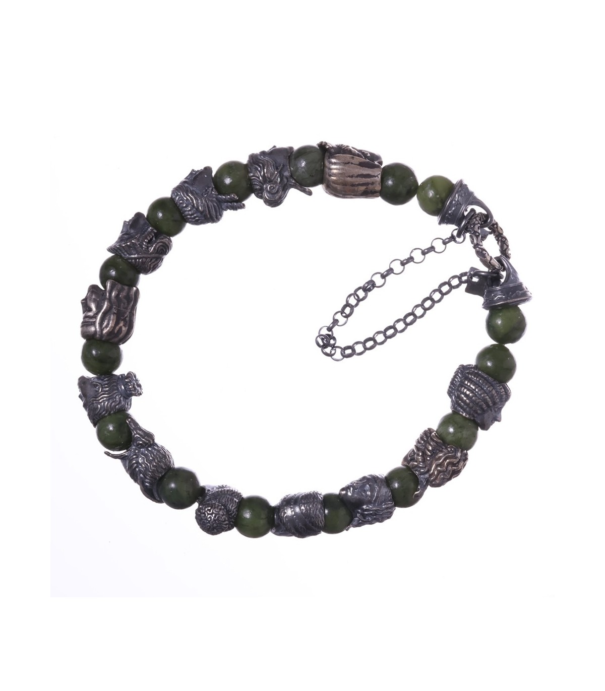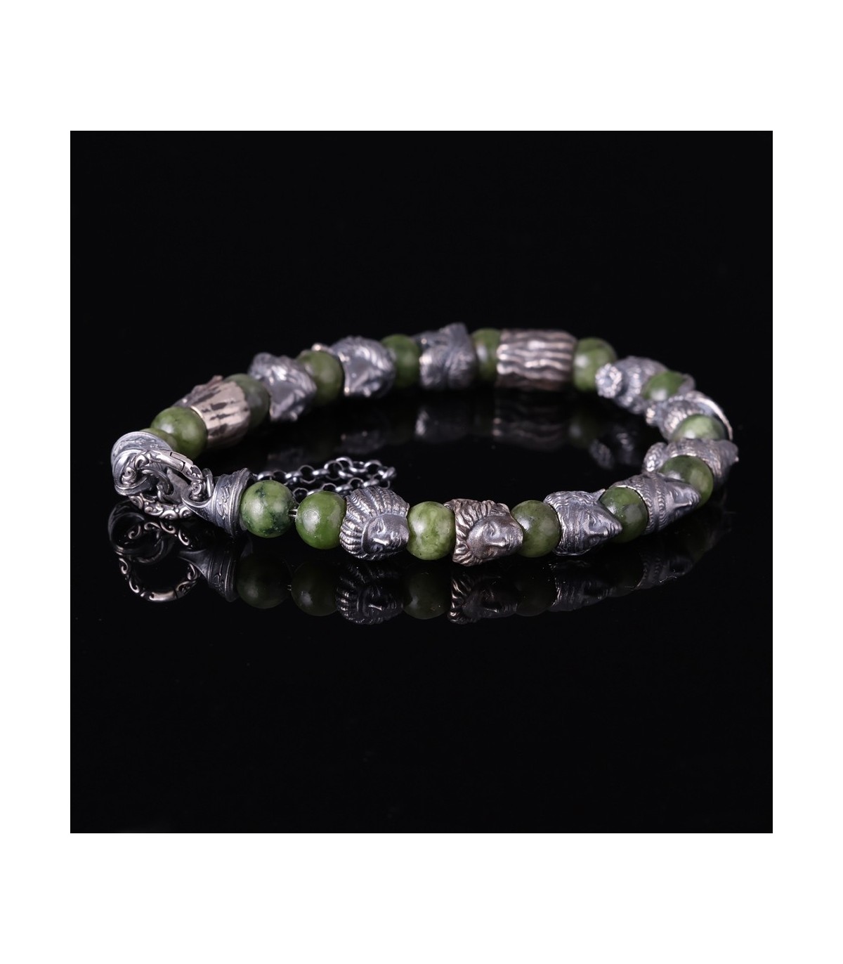 This artistic silver bracelet is composed of sculpted silver heads of ancient female figures, their expressions marked by experience and quiet authority. Each face seems to speak differently — gently, firmly, softly, or with conviction. Between the silver forms are placed beads of green serpentine, a stone deeply connected to nature and transformation.