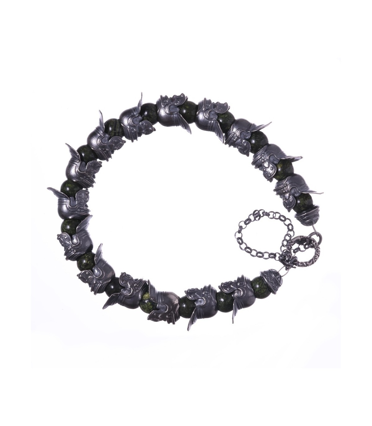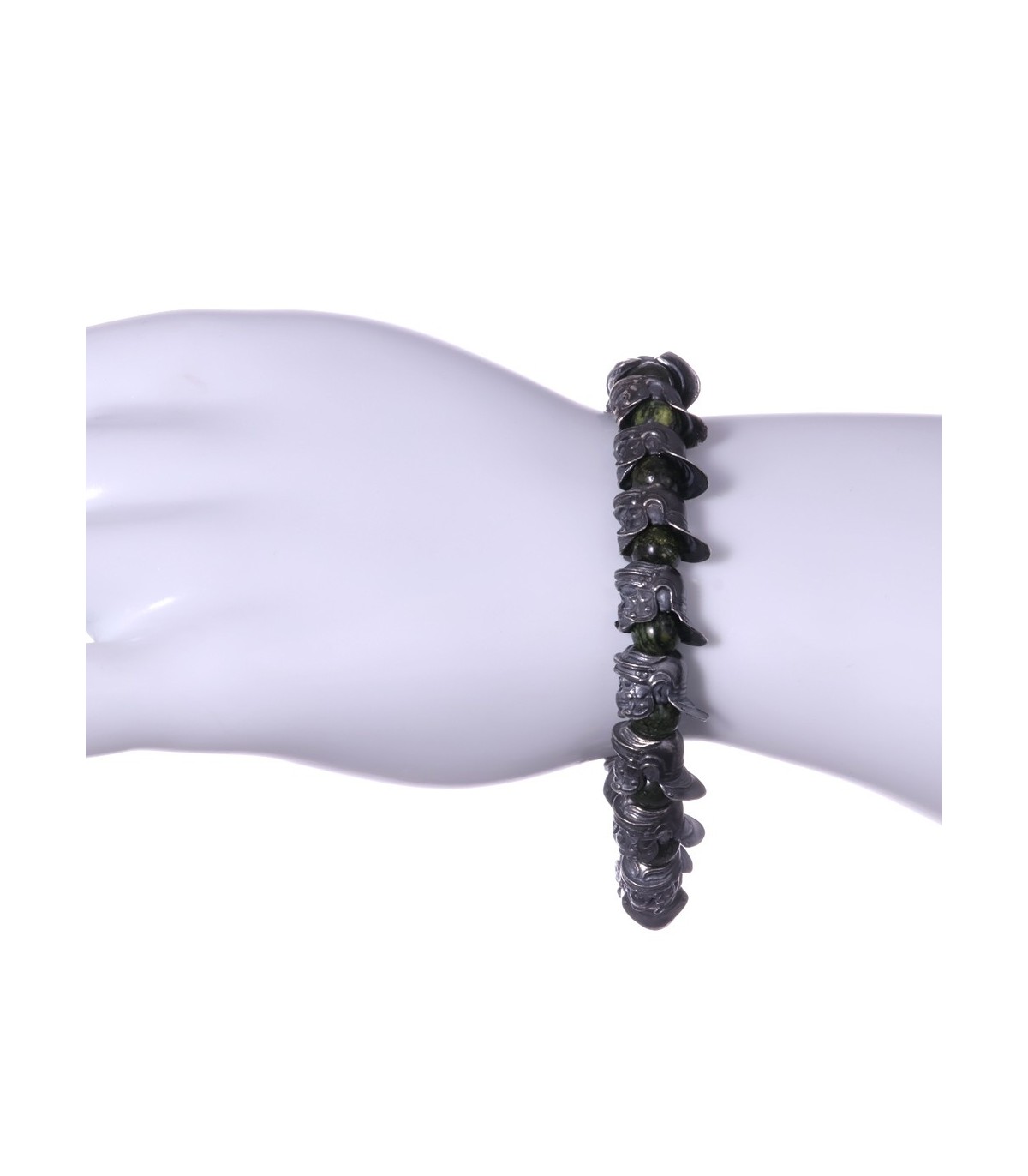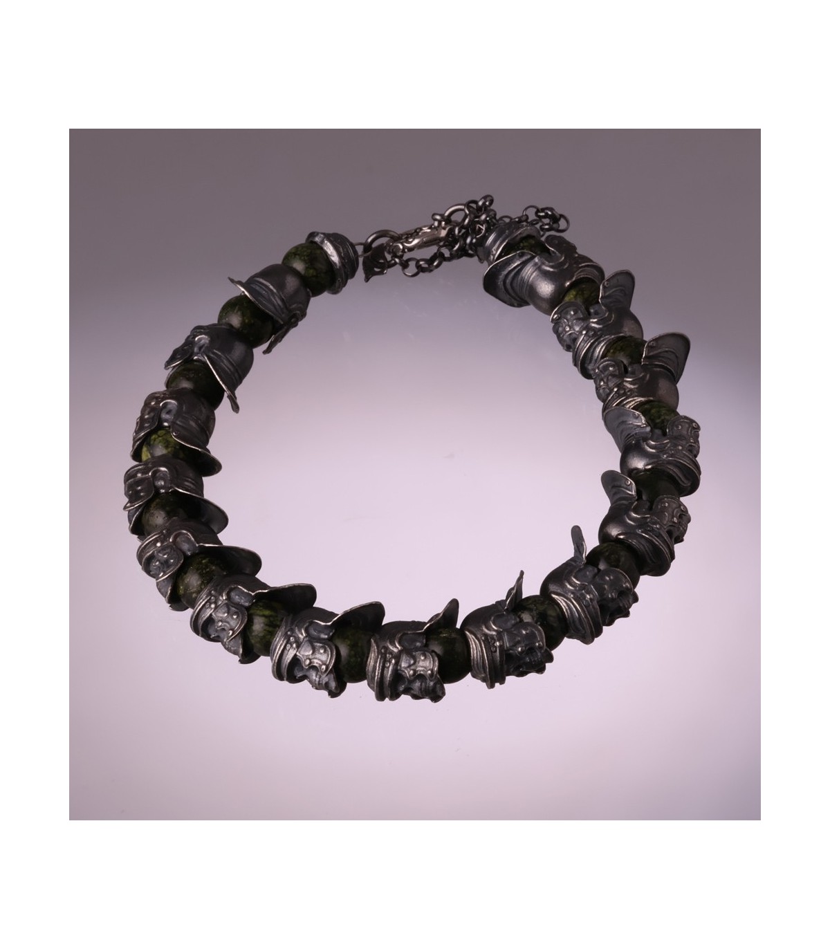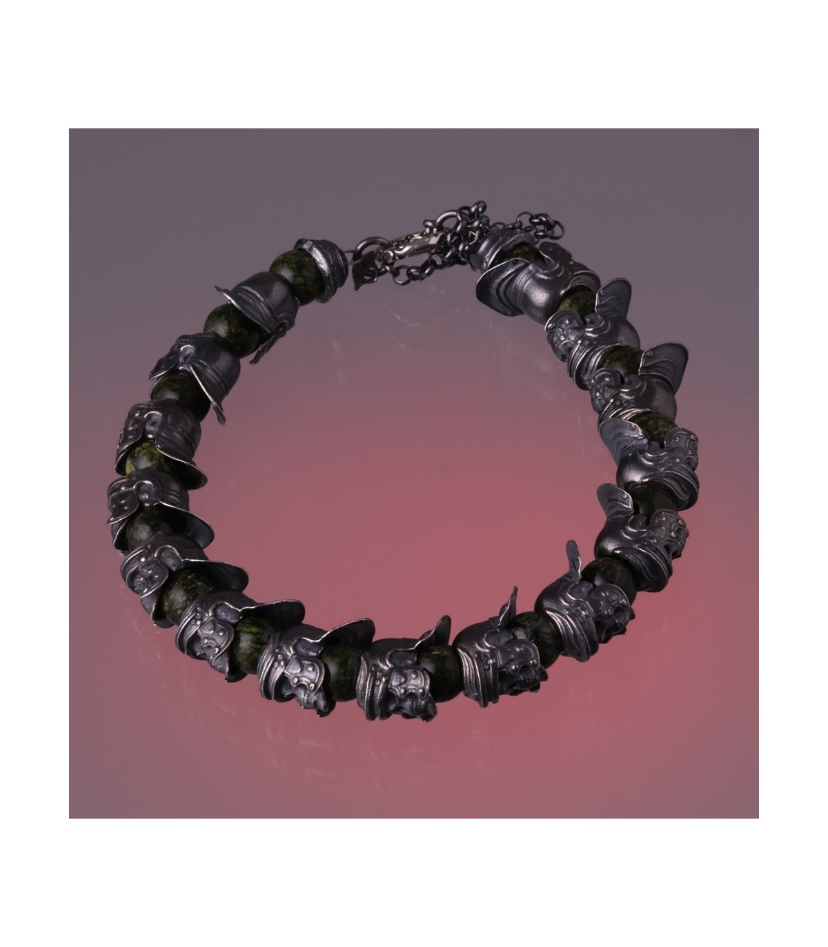 Hastatus is a handcrafted silver bracelet inspired by discipline, formation, and ancient strength. Sculpted sterling silver skulls wearing Roman helmets form a continuous ring, separated by round beads of Meihan natural serpentine. The deep green stone has an earthy, organic character, while the darkened silver brings weight and historical presence. Together they create a bracelet that feels solid, deliberate, and unmistakably martial.