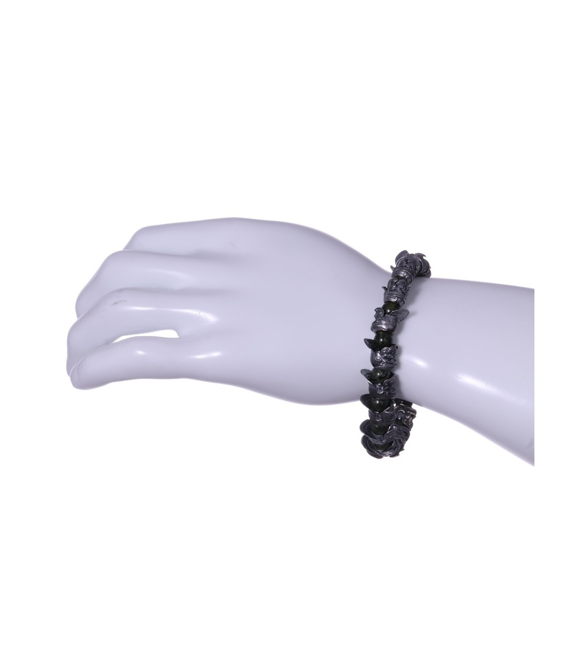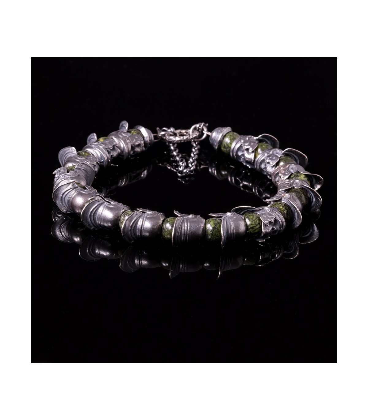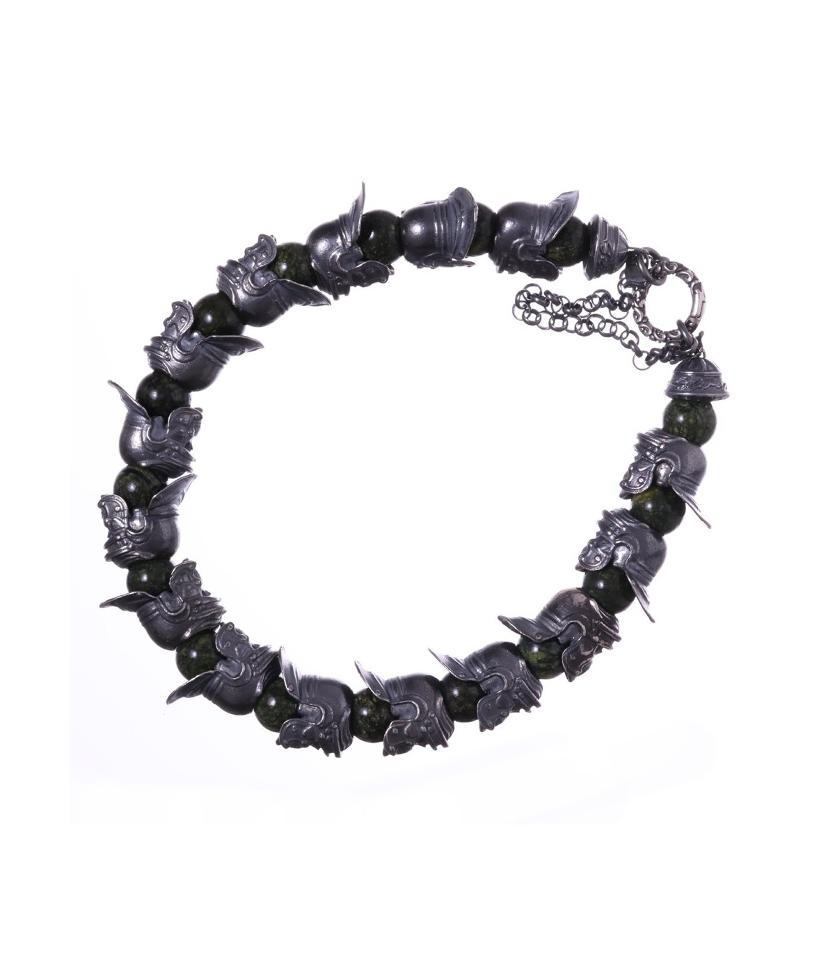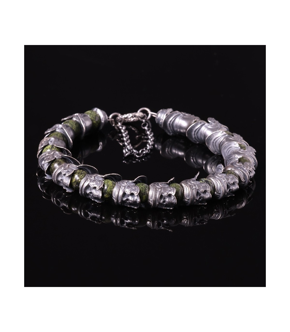 Hastatus is a handcrafted silver bracelet inspired by discipline, formation, and ancient strength. Sculpted sterling silver skulls wearing Roman helmets form a continuous ring, separated by round beads of Meihan natural serpentine. The deep green stone has an earthy, organic character, while the darkened silver brings weight and historical presence. Together they create a bracelet that feels solid, deliberate, and unmistakably martial.