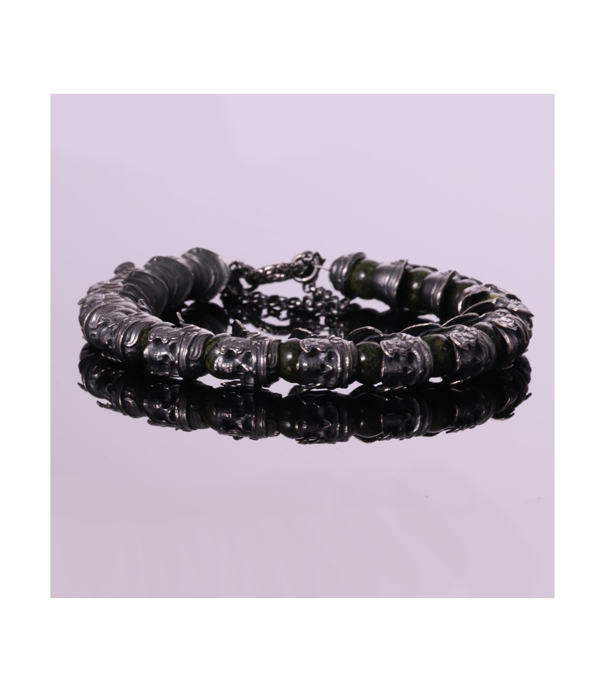 Serpentine has long been associated with protection and grounding. Its muted green tones soften the metal forms without weakening their impact, giving the bracelet balance and depth. Hastatus is a silver serpentine bracelet for those who value symbolism, structure, and inner strength. It is not decorative armor, but a quiet reminder of resolve and position.