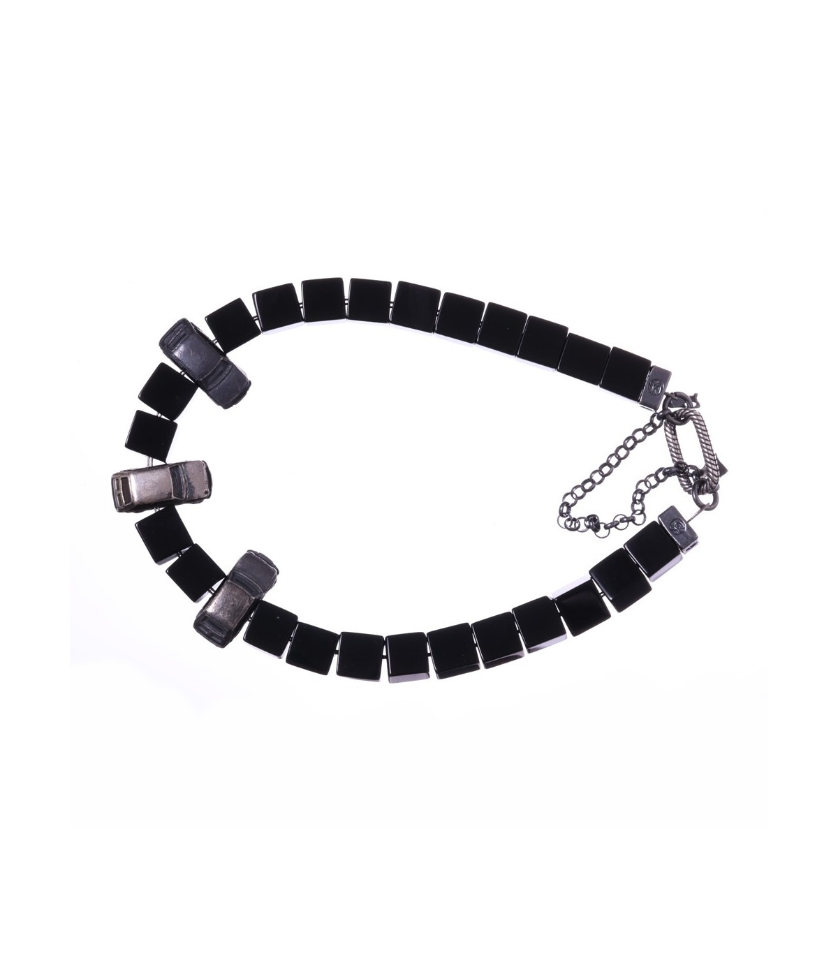 Lectica is a handcrafted silver bracelet defined by structure, contrast, and restrained elegance. Glossy black onyx cubes form a precise, continuous line around the wrist, their sharp geometry reflecting light with quiet intensity. Between them sit small sterling silver models of the Fiat 126, sculpted with care and darkened to emphasize form and detail. The composition feels architectural and deliberate, balancing industrial rhythm with artisanal character.