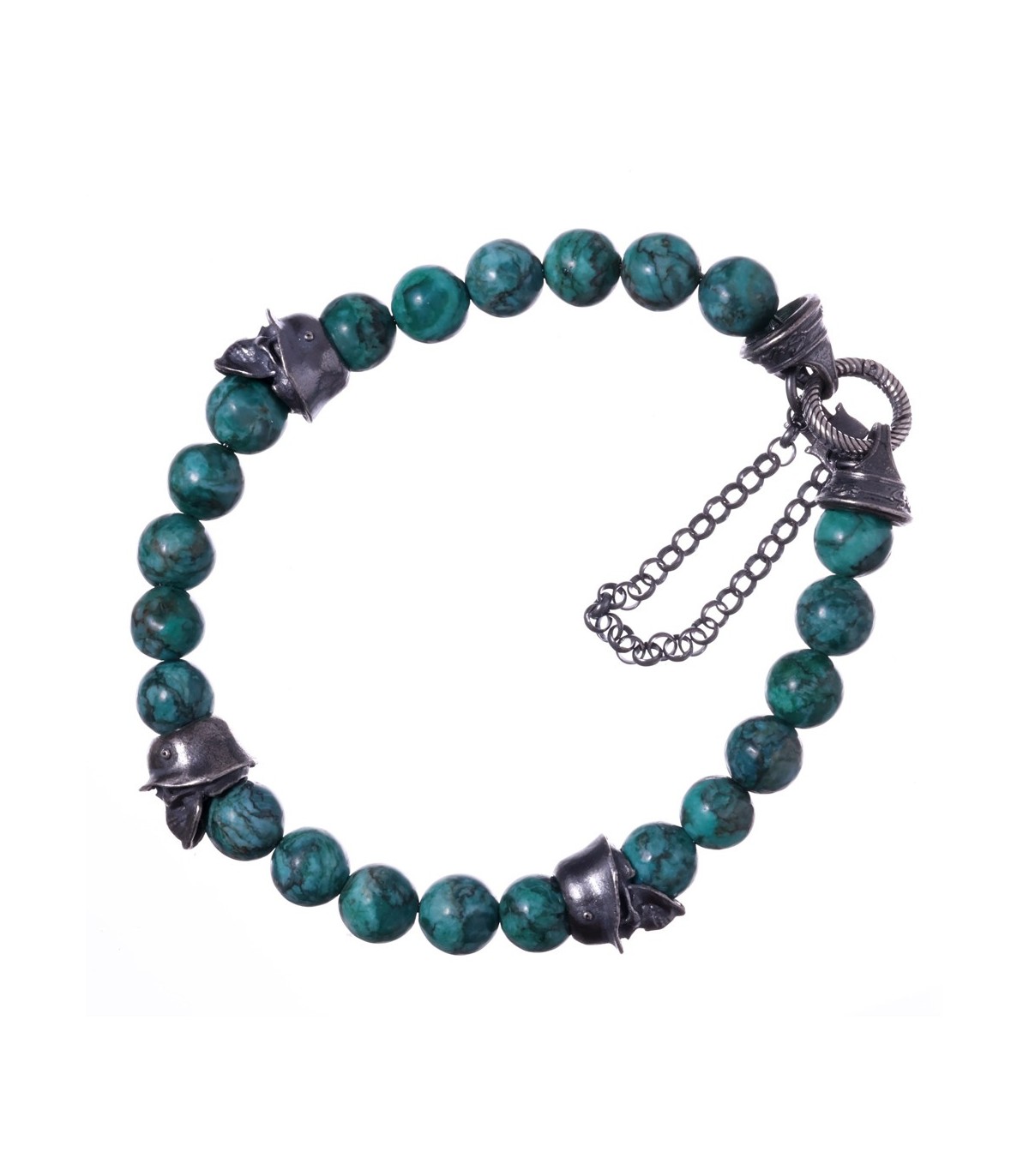 Tesserarius is a handcrafted silver bracelet inspired by discipline, vigilance, and ancient warriors. Natural turquoise beads with deep veining are combined with sculpted sterling silver skulls wearing helmets, giving the bracelet a strong martial character. The vivid blue green of the turquoise feels alive and mineral, while the darkened silver adds weight and historical depth to the piece.