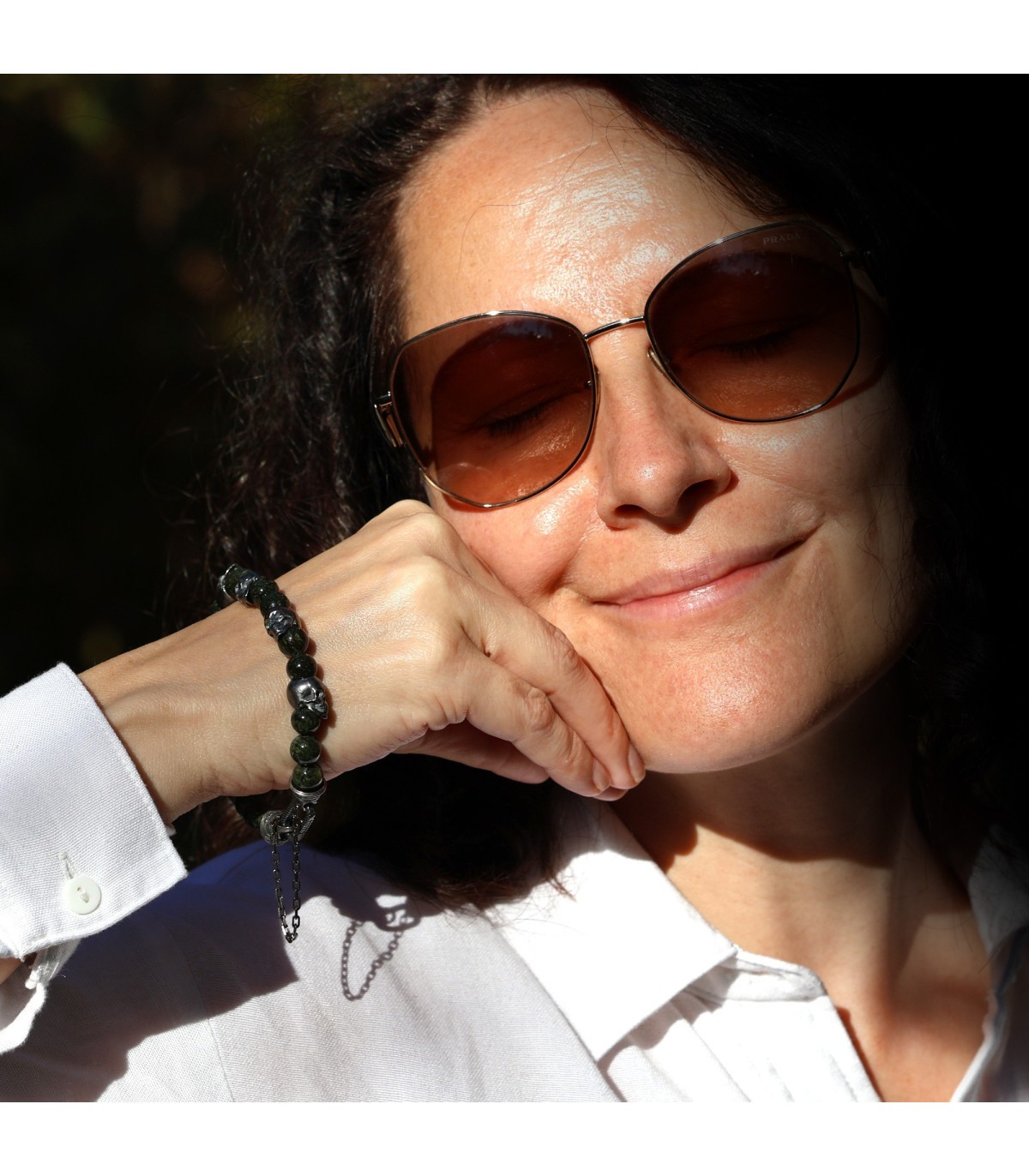 Introducing PERFUGA – a luxurious bracelet crafted for those who value courage, independence, and style with character. This exclusive combination of silver skulls and the deep green hue of Serpentine stones is not only visually striking but also carries a powerful message. Serpentine has long been regarded as a protective stone, known for balancing energies, promoting harmony, and alleviating stress, while enhancing determination and confidence.