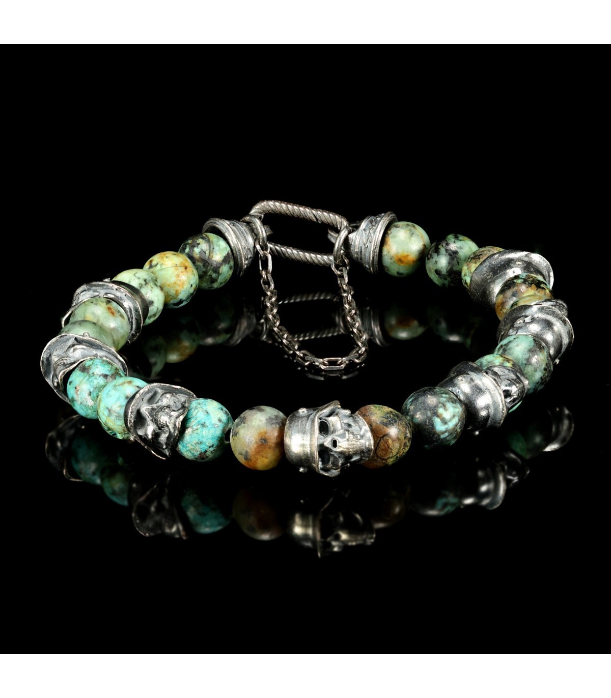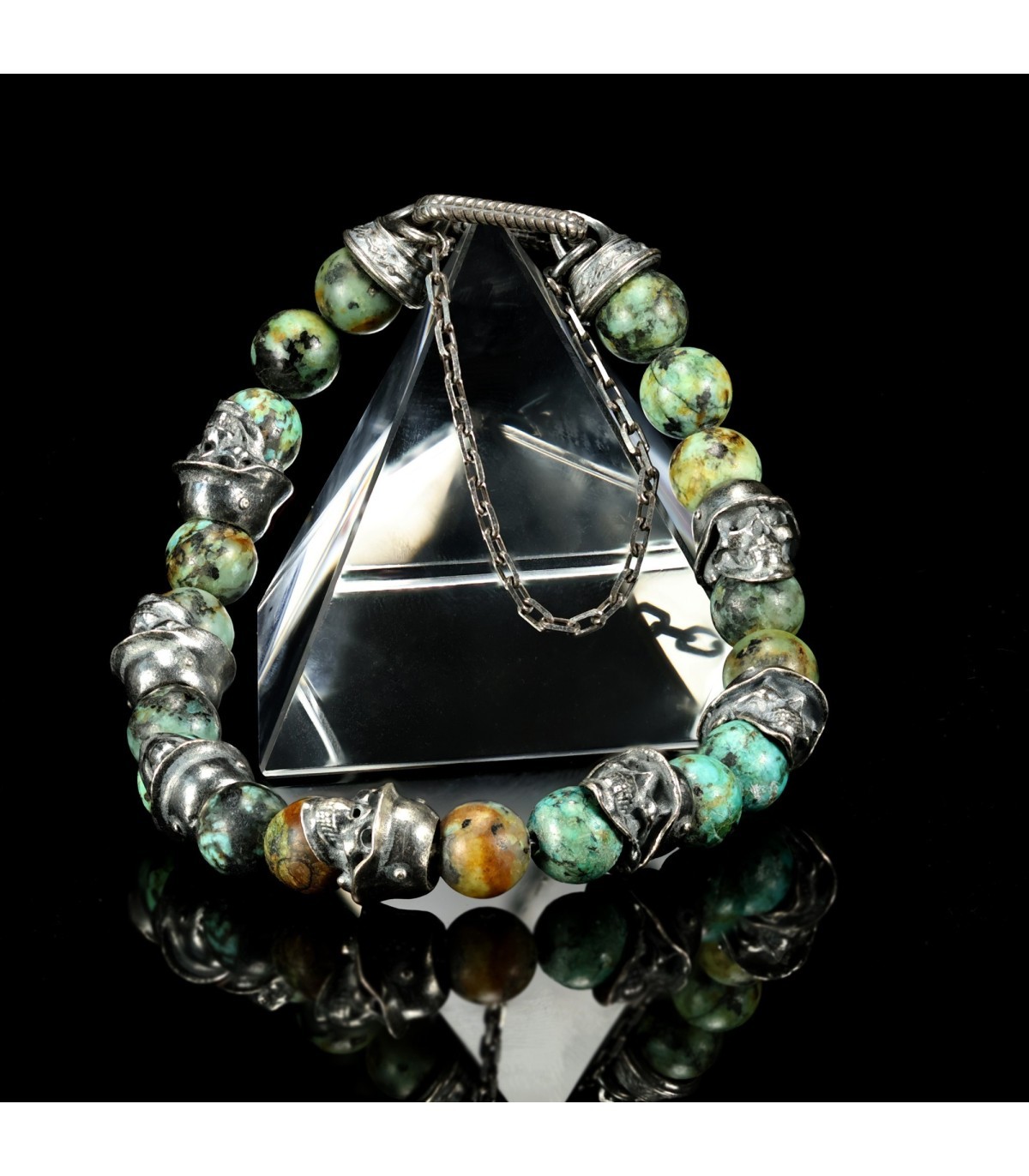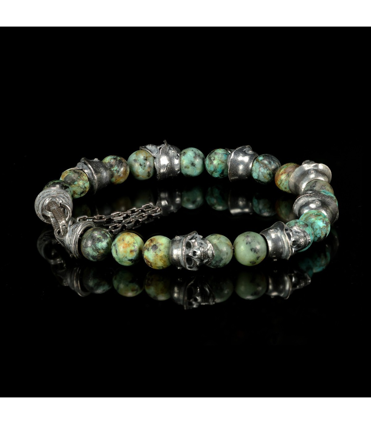 Distinctive skulls adorned in Germanic helmets give this bracelet an extraordinary character, setting it apart from others. Green turquoise, adorning "PHALANX," is a stone of protection, stability, and spiritual empowerment. Regarded as a talisman of strength, it helps maintain balance and shields against negative influences.