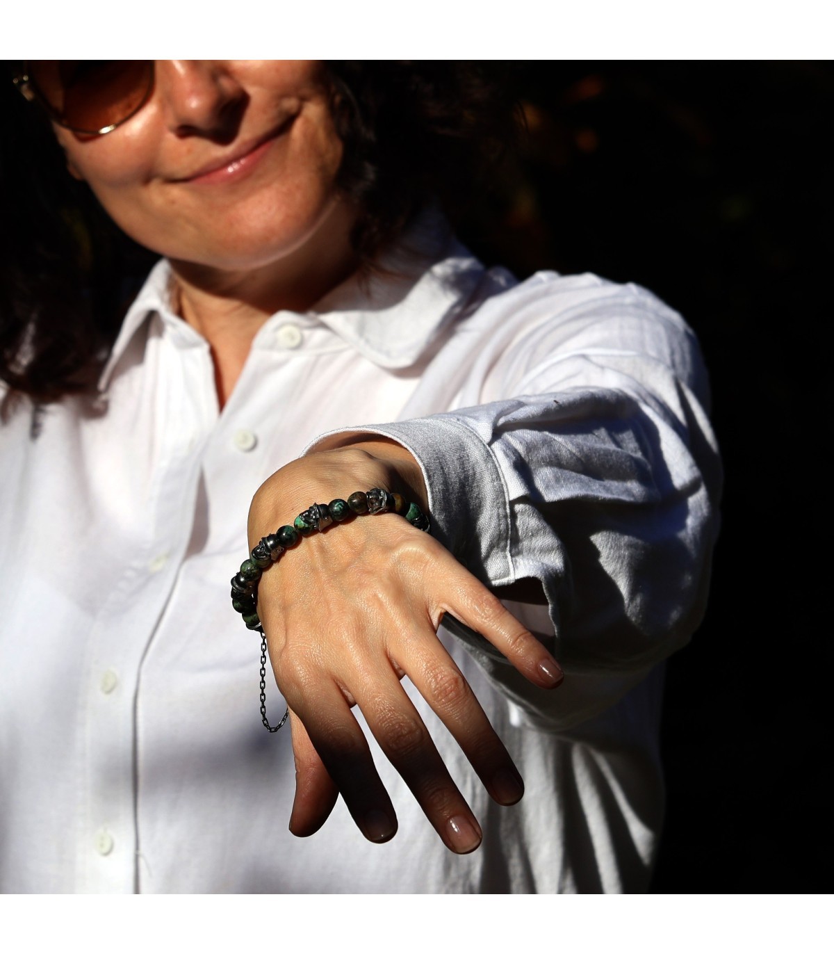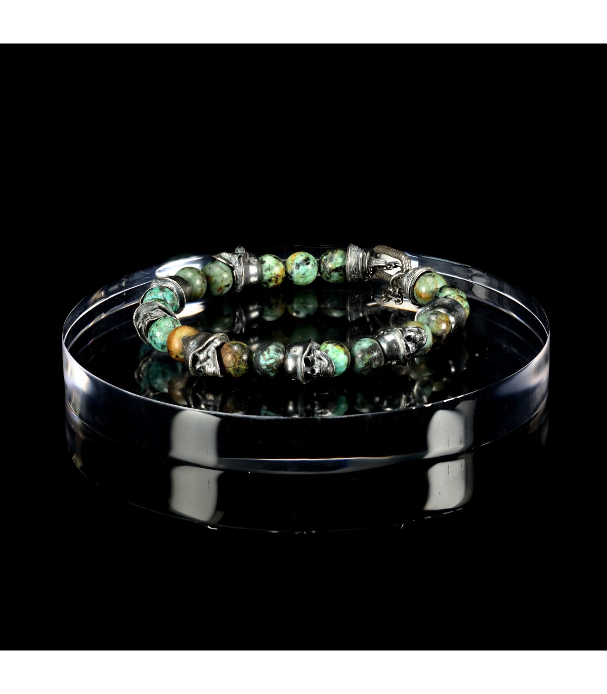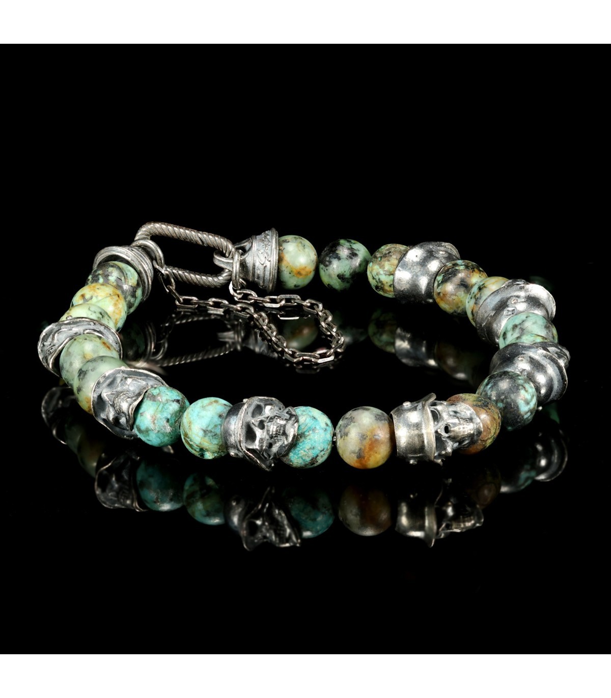 Distinctive skulls adorned in Germanic helmets give this bracelet an extraordinary character, setting it apart from others. Green turquoise, adorning "PHALANX," is a stone of protection, stability, and spiritual empowerment. Regarded as a talisman of strength, it helps maintain balance and shields against negative influences.