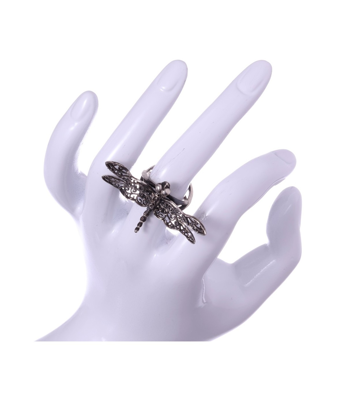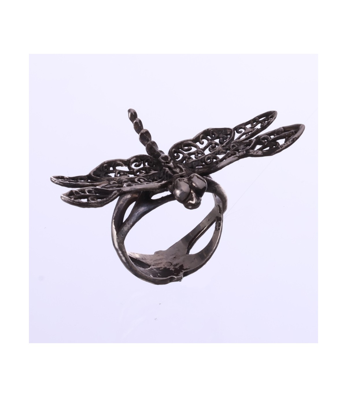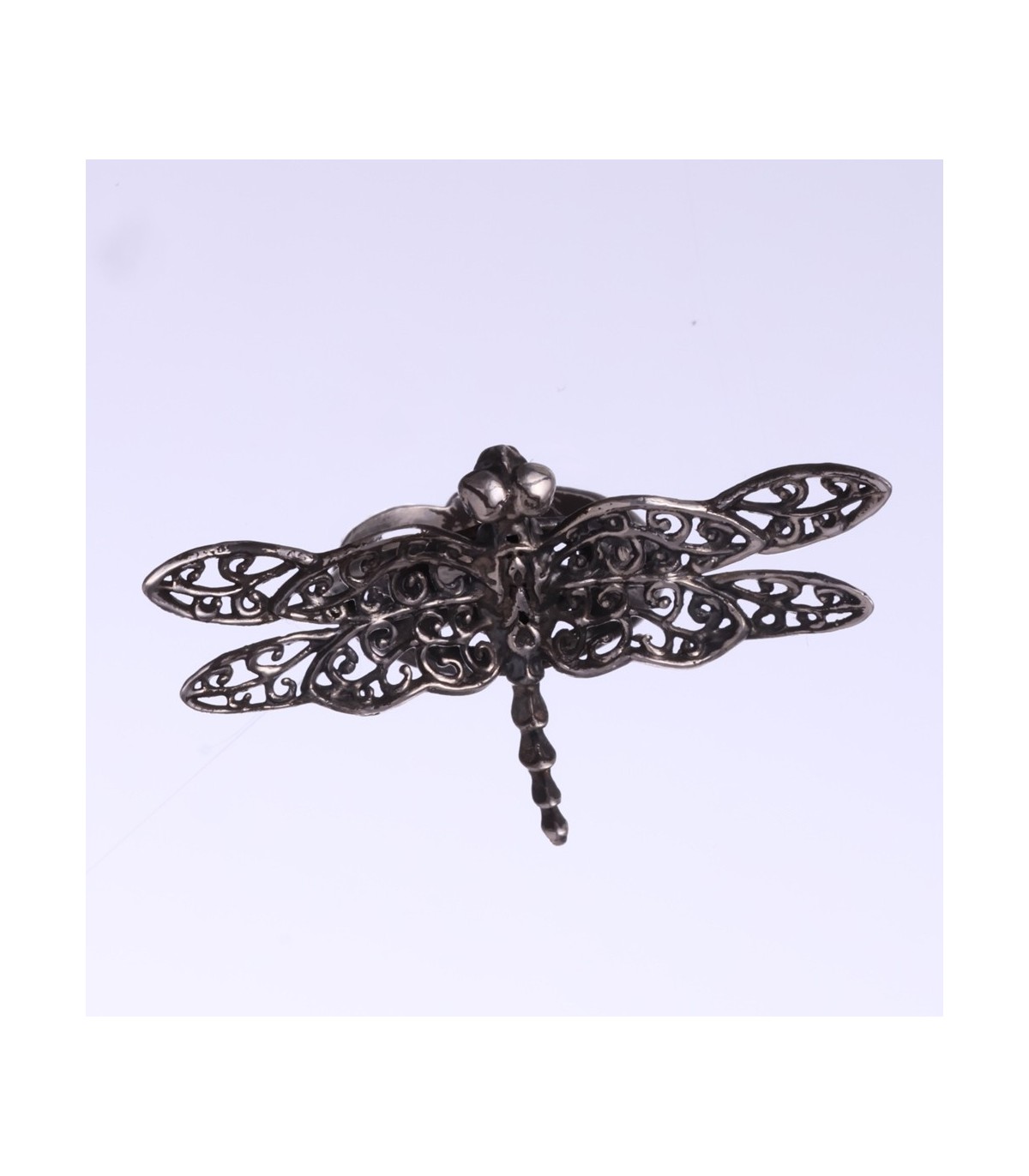 Calopterygula is a handcrafted silver ring shaped as an openwork dragonfly, expressive and refined in equal measure. The wings are pierced with flowing ornamental patterns, giving the ring a lace-like structure that feels light on the hand while remaining visually strong. The dragonfly sits proudly across the finger, its form clearly defined, with the openwork allowing light and shadow to animate the silver surface.