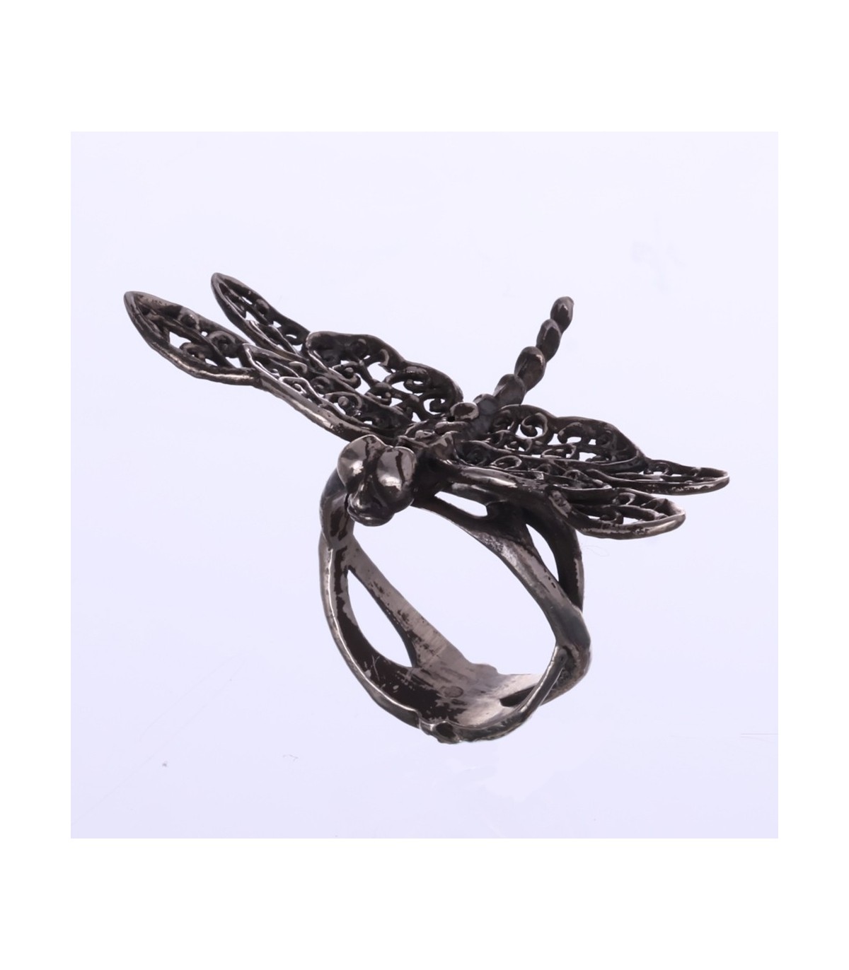 The ring can be made in bright polished silver, where its delicate structure appears luminous and airy, or in an oxidized finish, which deepens contrast and emphasizes the sculptural lines of the wings and body. Each finish transforms the character of the piece, from elegant and ethereal to darker and more dramatic.