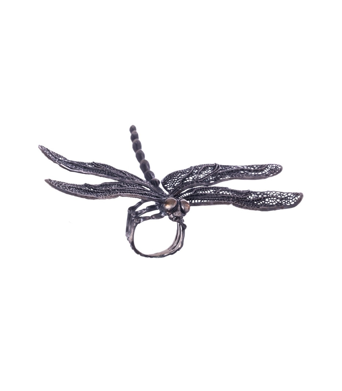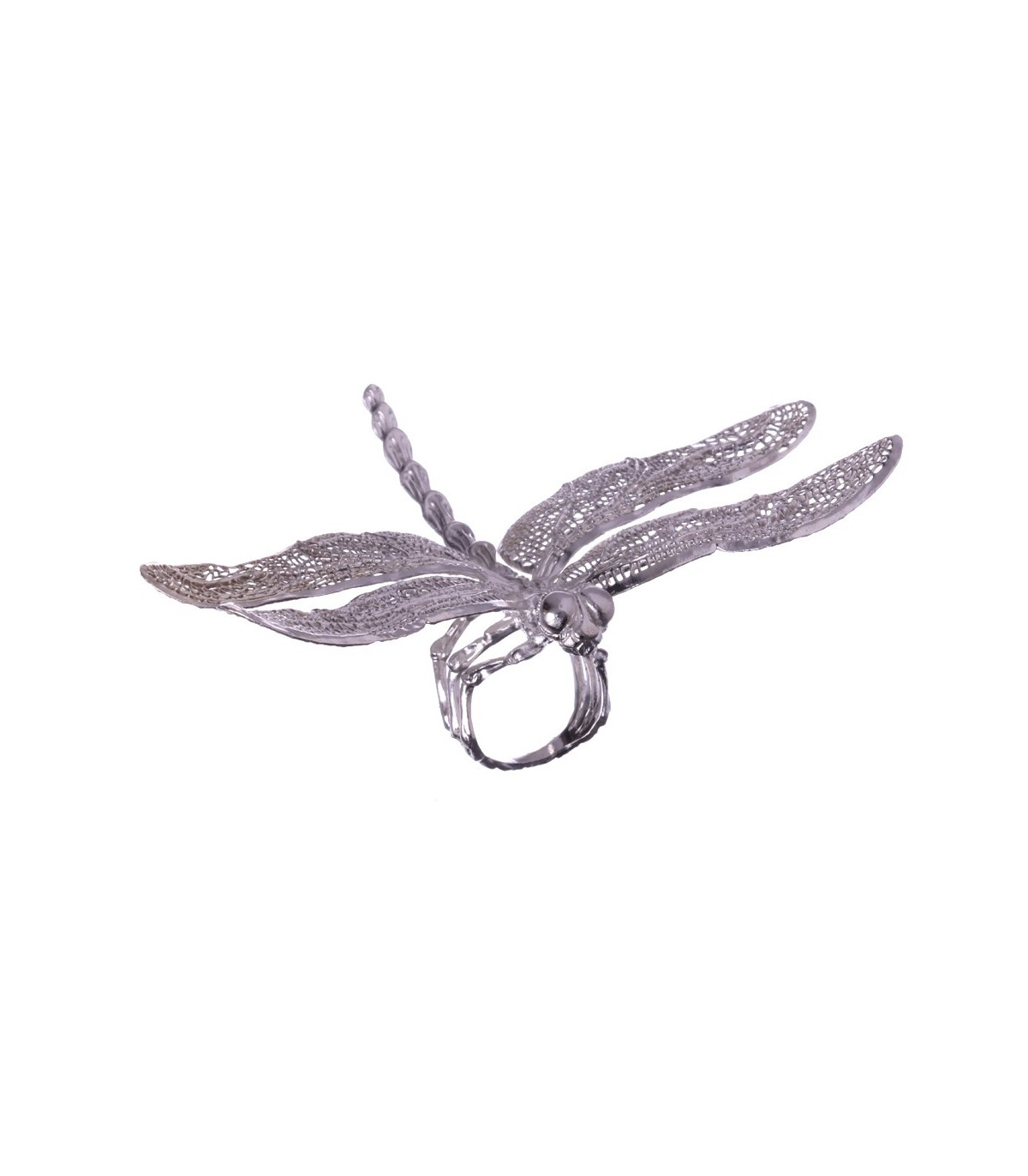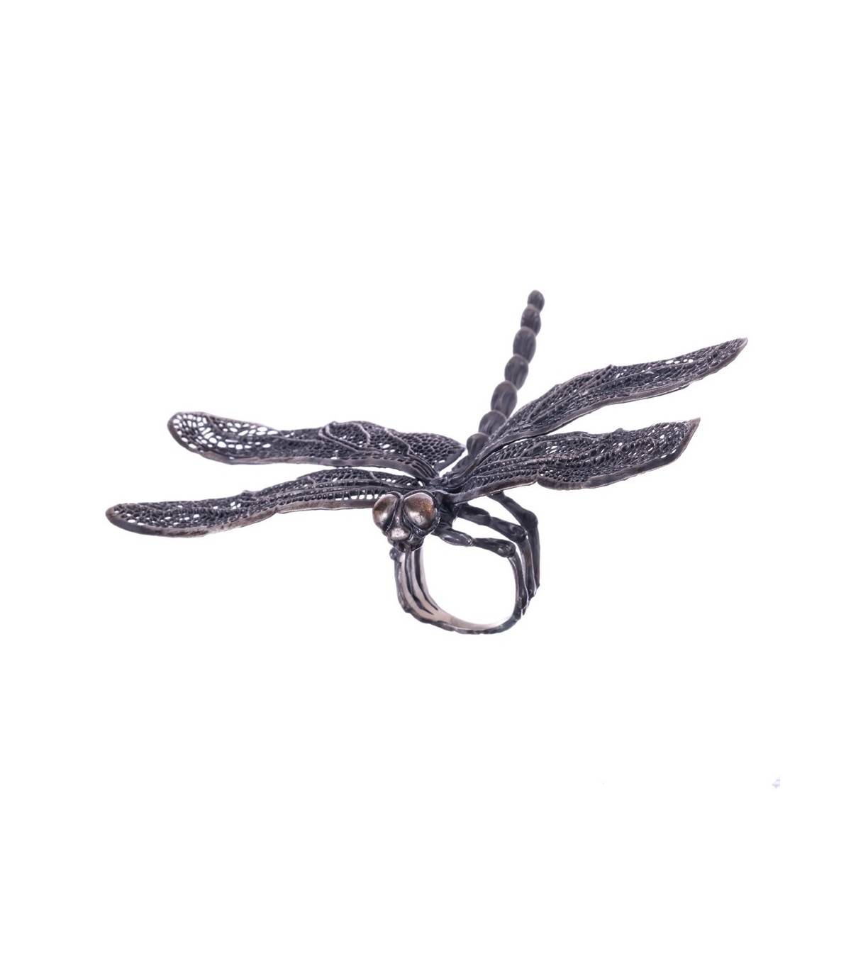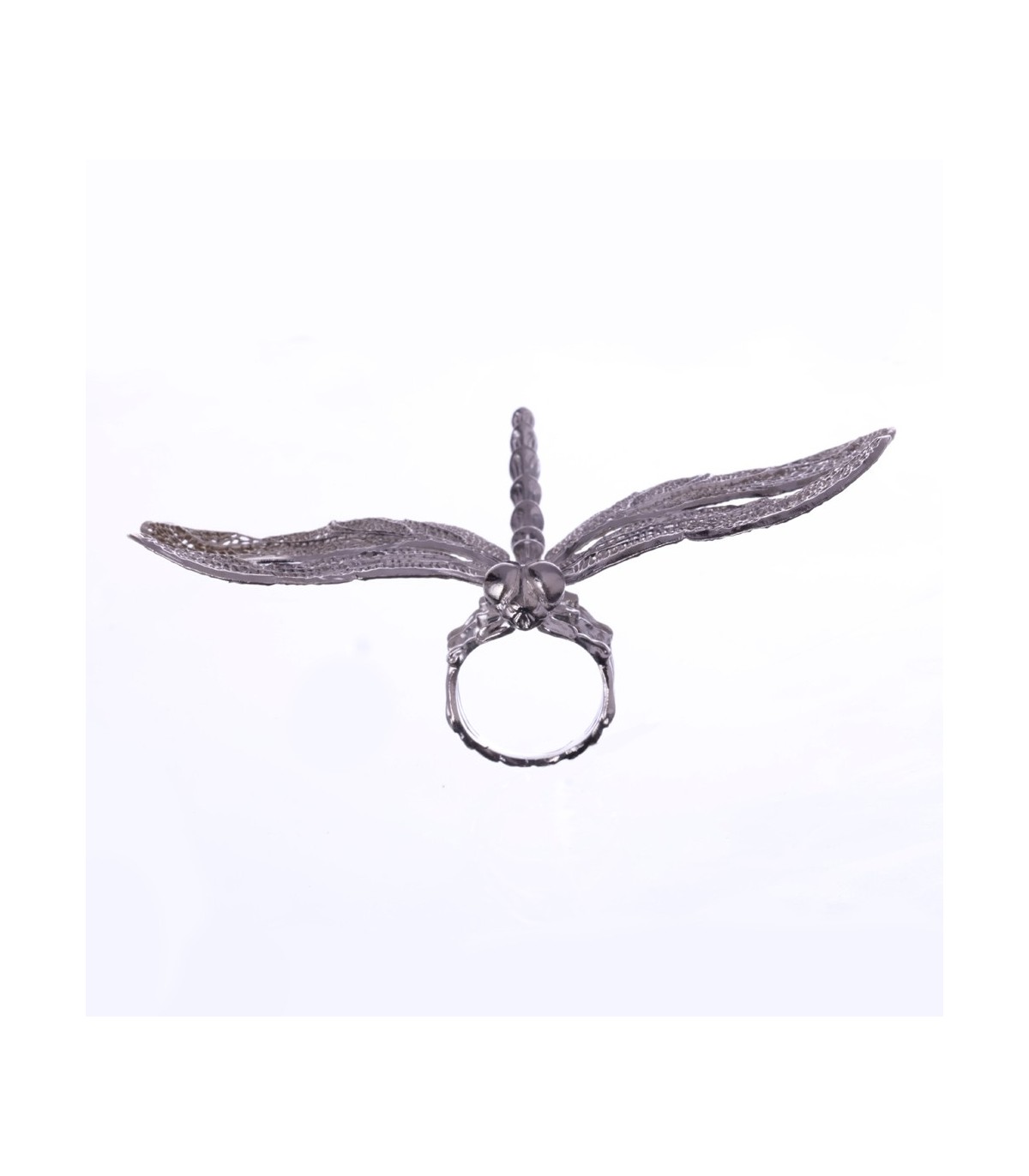 Medesikaste is a large handcrafted silver ring shaped as an openwork dragonfly, defined by delicacy, balance, and quiet intensity. The wings are fully openworked, lace-like and precise, spreading wide across the hand and allowing light to flow freely through the silver structure. Every vein is carefully sculpted, giving the ring an airy presence that feels light despite its bold scale. The dragonfly’s eyes are formed entirely from silver, calm and reflective, giving the piece a composed, almost meditative expression.