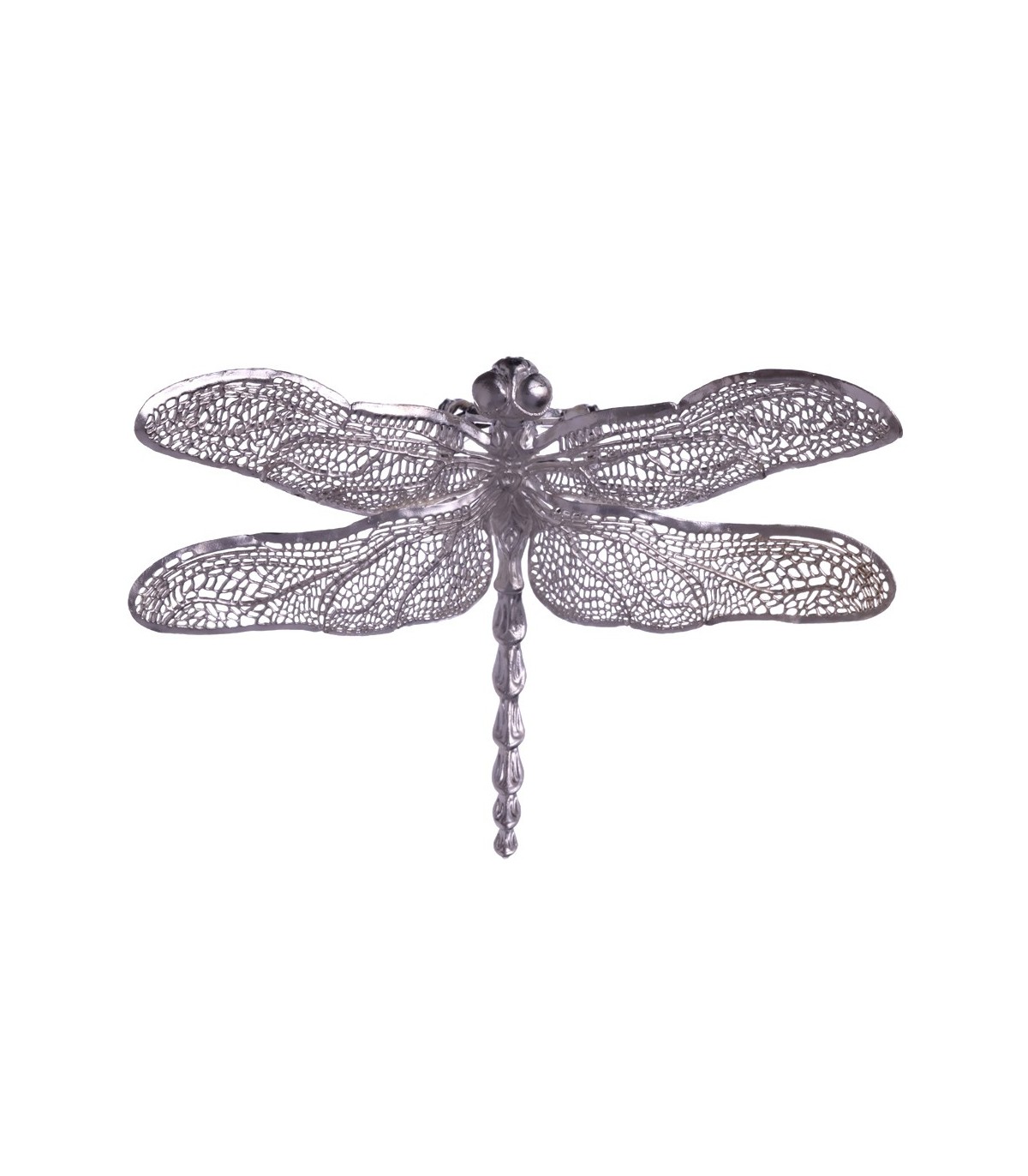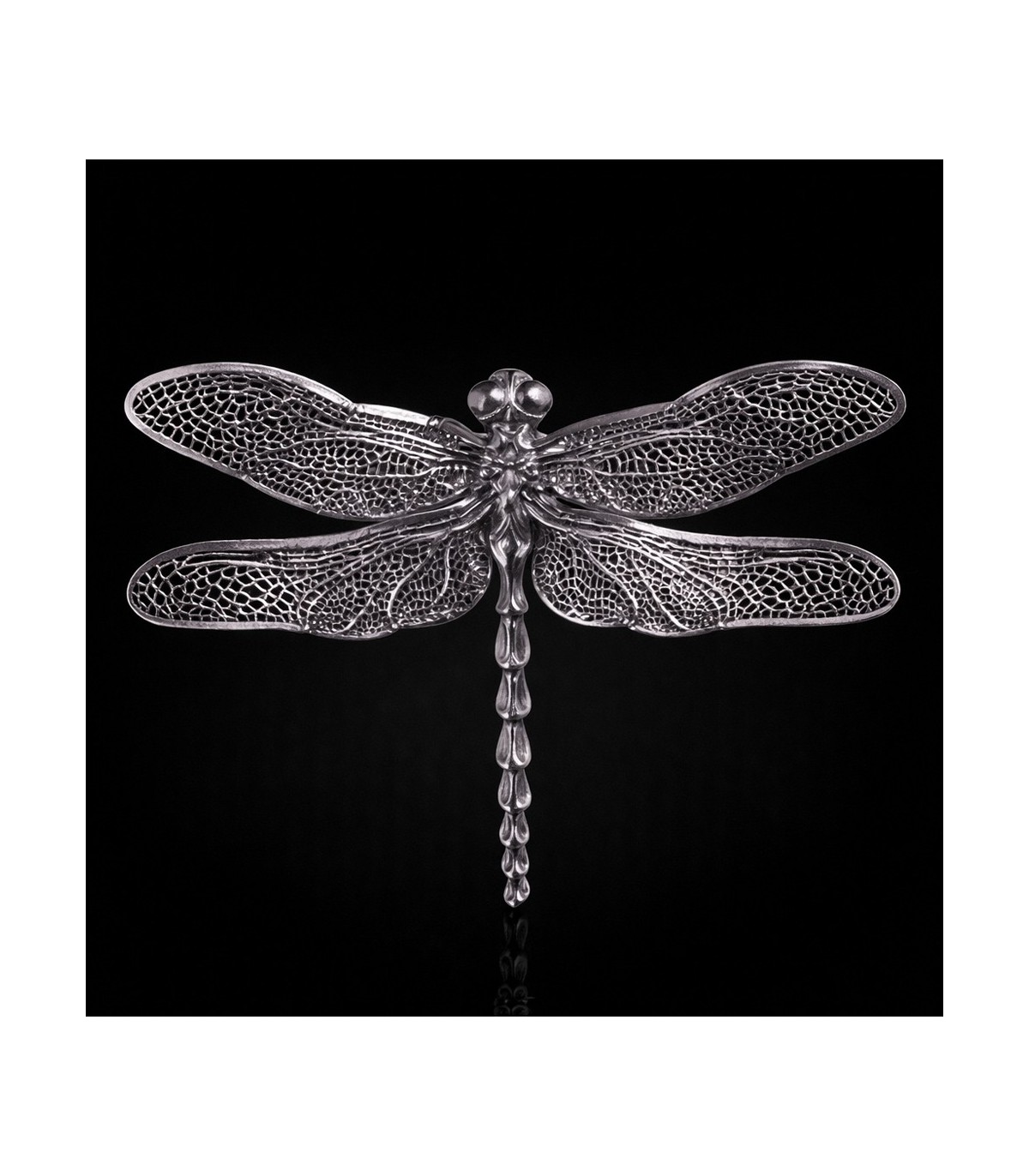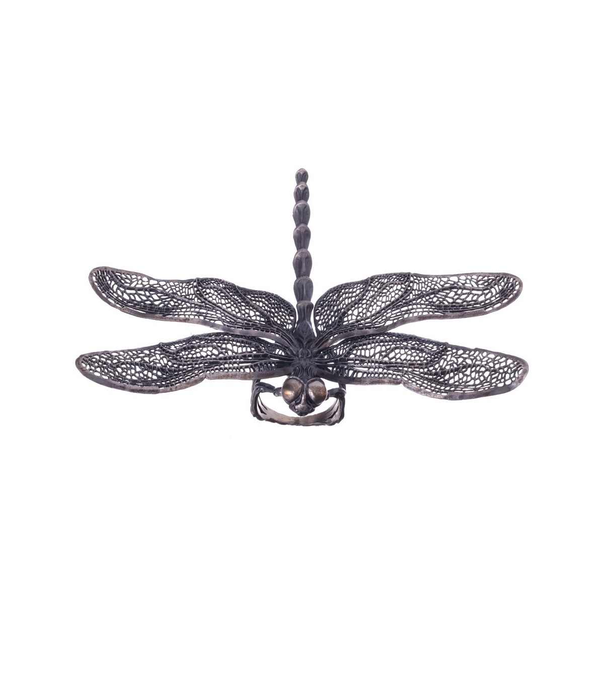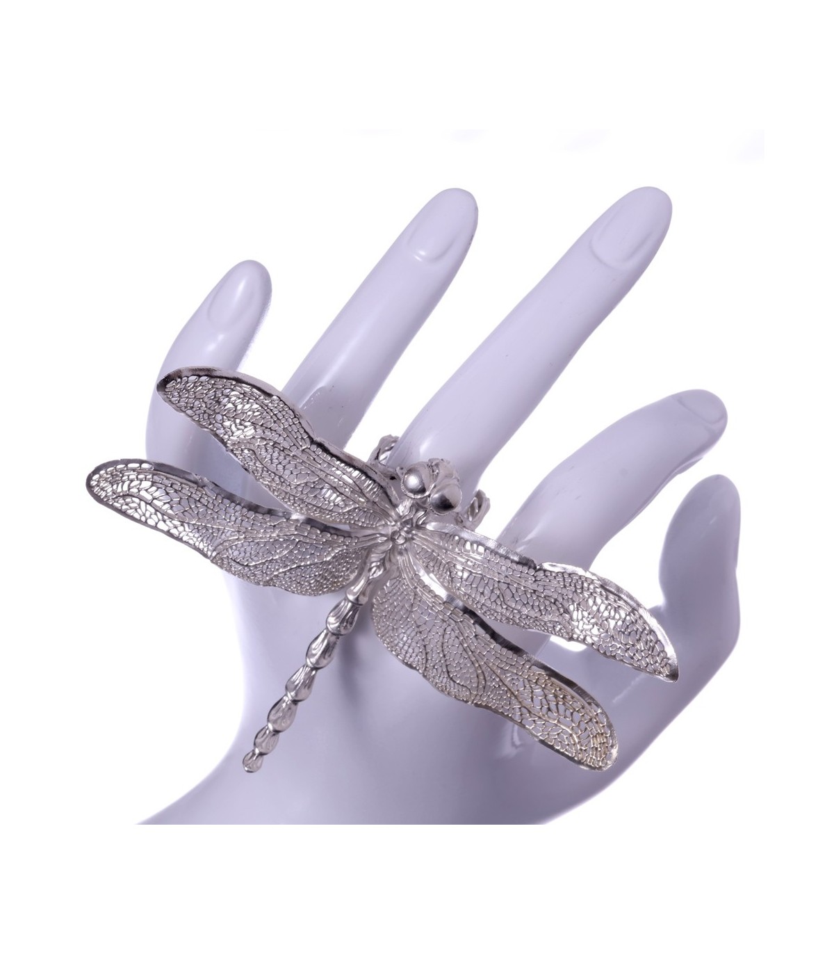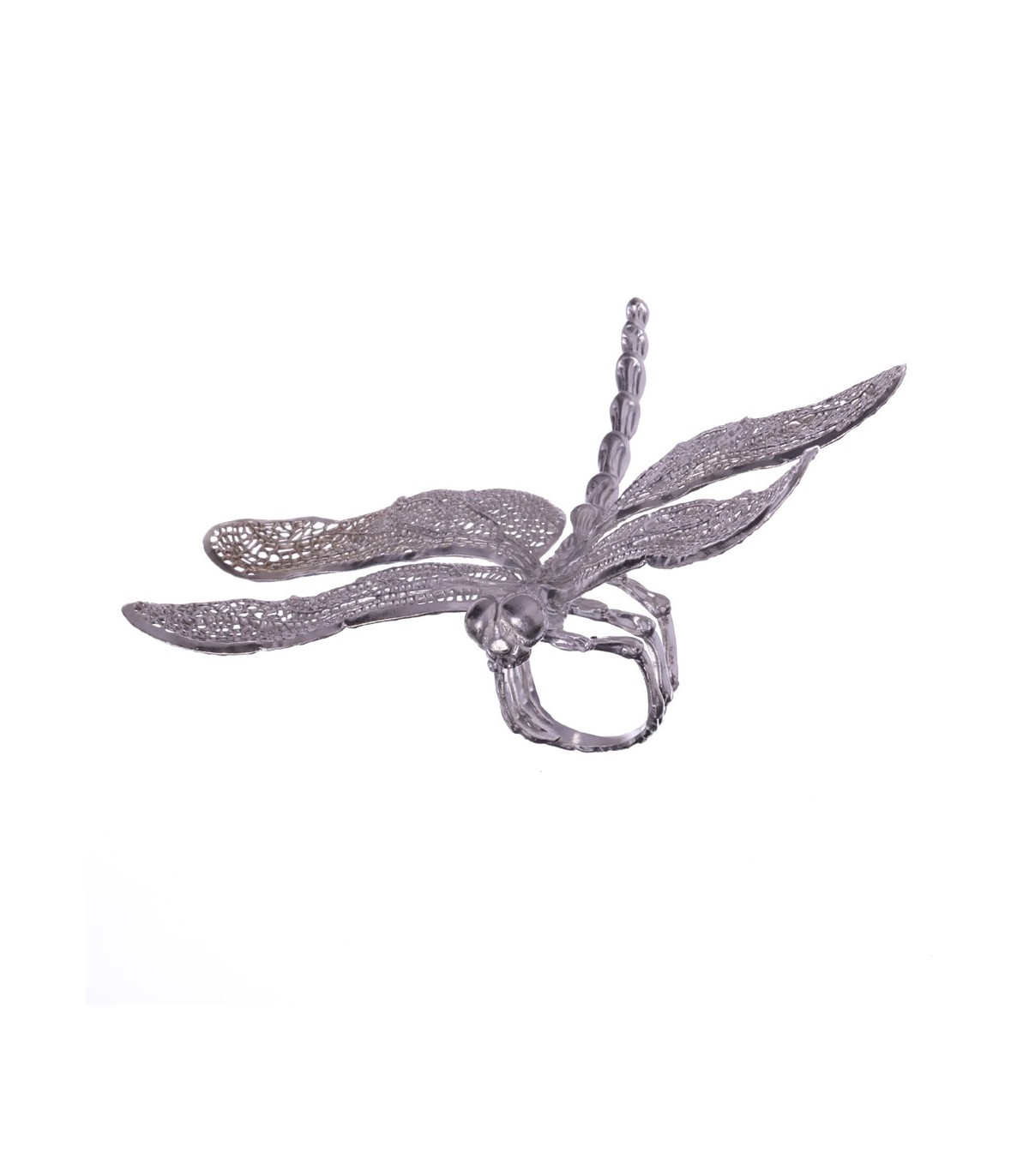 Medesikaste is a large handcrafted silver ring shaped as an openwork dragonfly, defined by delicacy, balance, and quiet intensity. The wings are fully openworked, lace-like and precise, spreading wide across the hand and allowing light to flow freely through the silver structure. Every vein is carefully sculpted, giving the ring an airy presence that feels light despite its bold scale. The dragonfly’s eyes are formed entirely from silver, calm and reflective, giving the piece a composed, almost meditative expression.