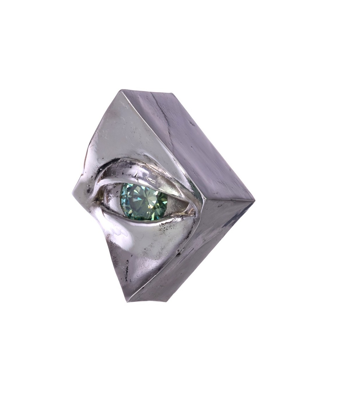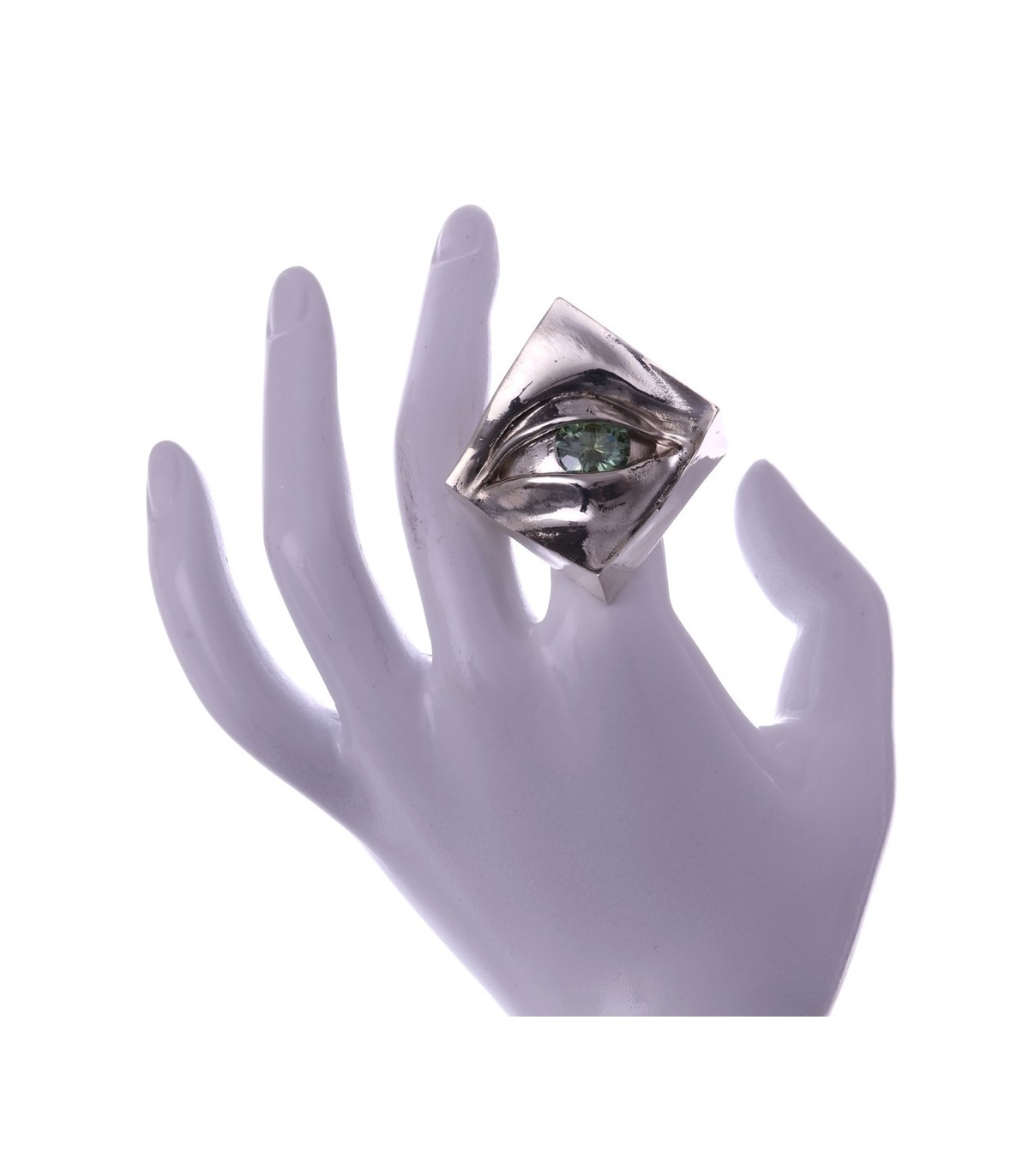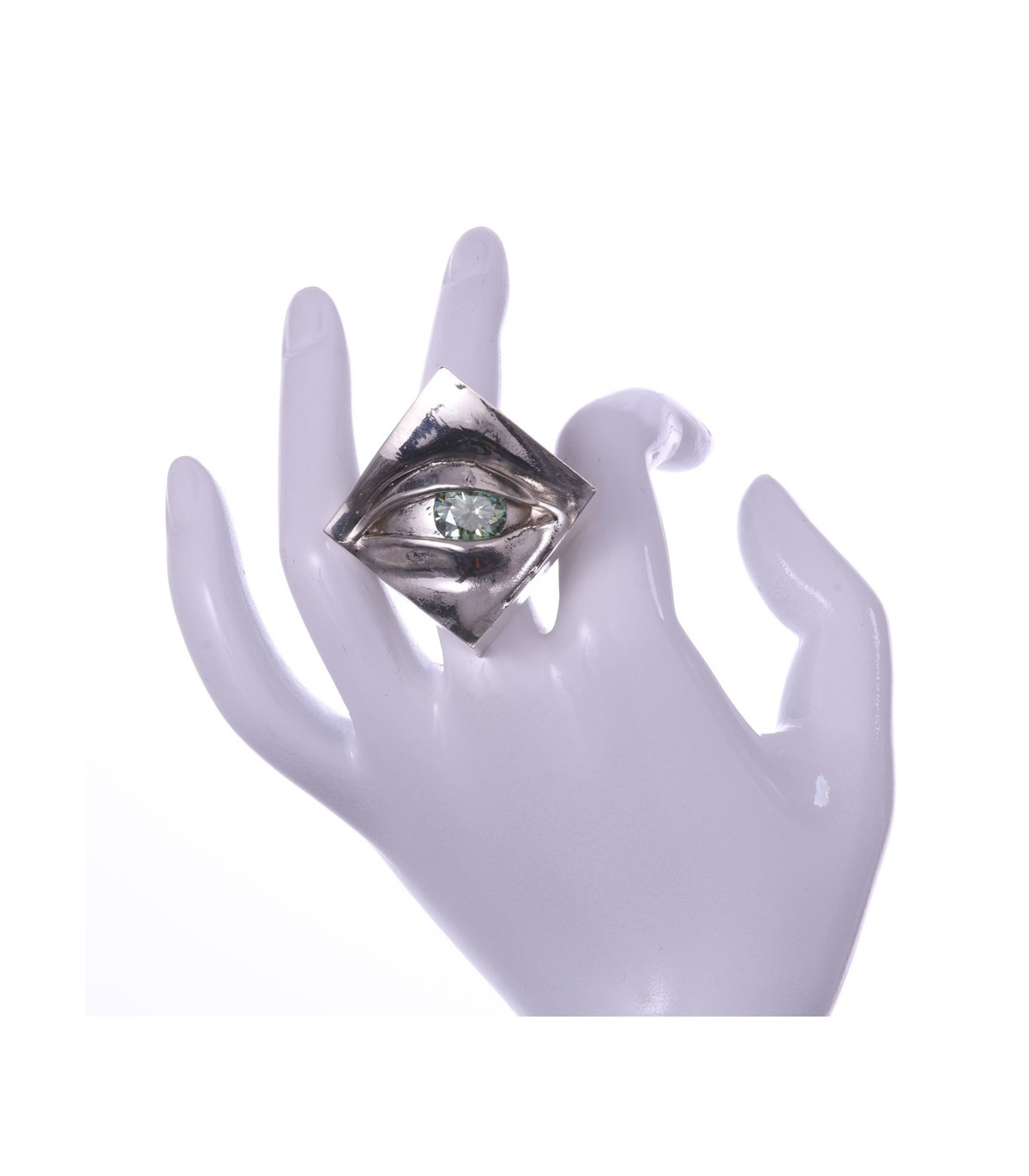 Crafted in silver, the ring takes the form of a strong square, within which a beautifully detailed human eye emerges. At its center shines the gaze itself: a striking five-carat moissanite forming the pupil, alive with light, depth, and quiet intensity.