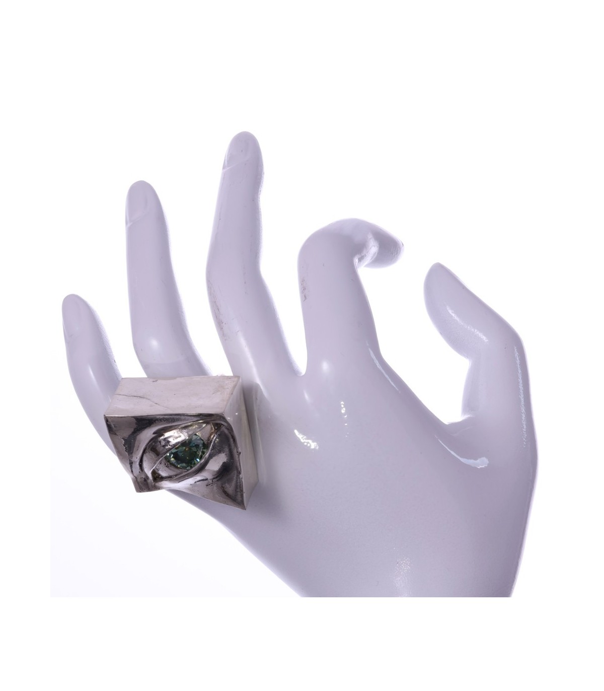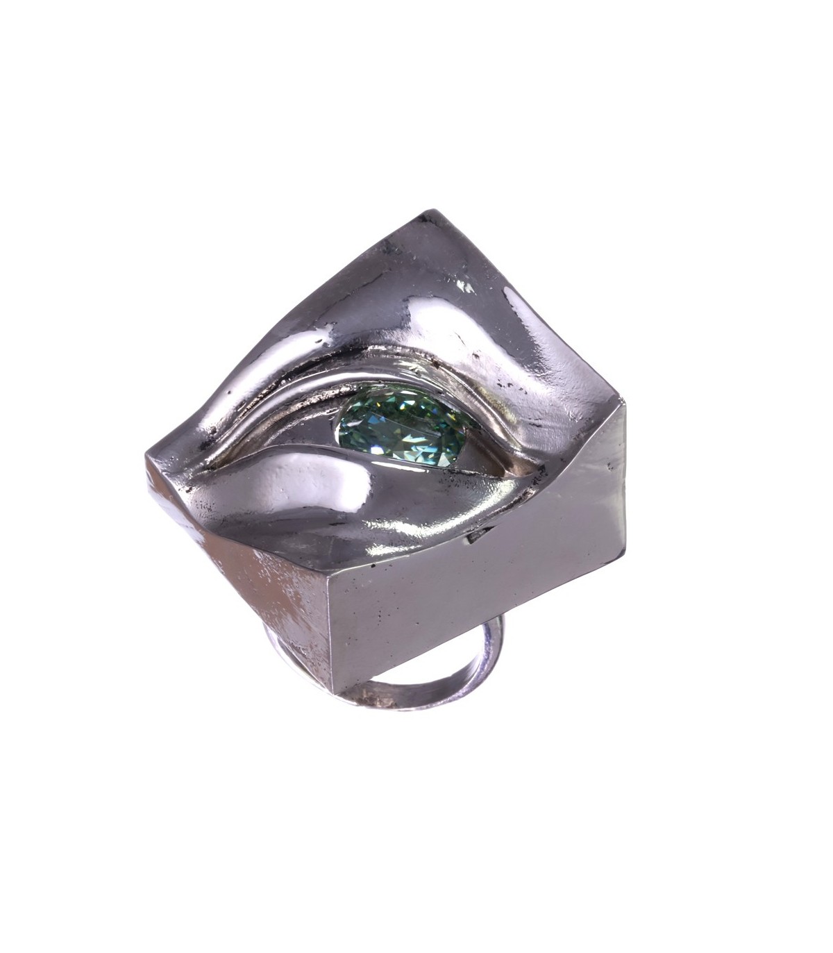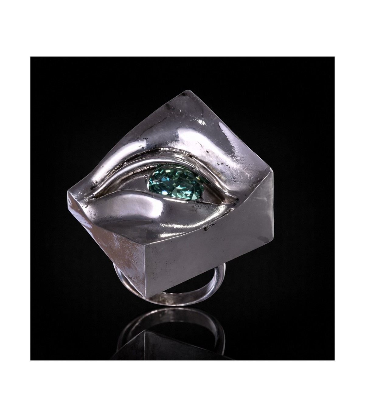 Crafted in silver, the ring takes the form of a strong square, within which a beautifully detailed human eye emerges. At its center shines the gaze itself: a striking five-carat moissanite forming the pupil, alive with light, depth, and quiet intensity.