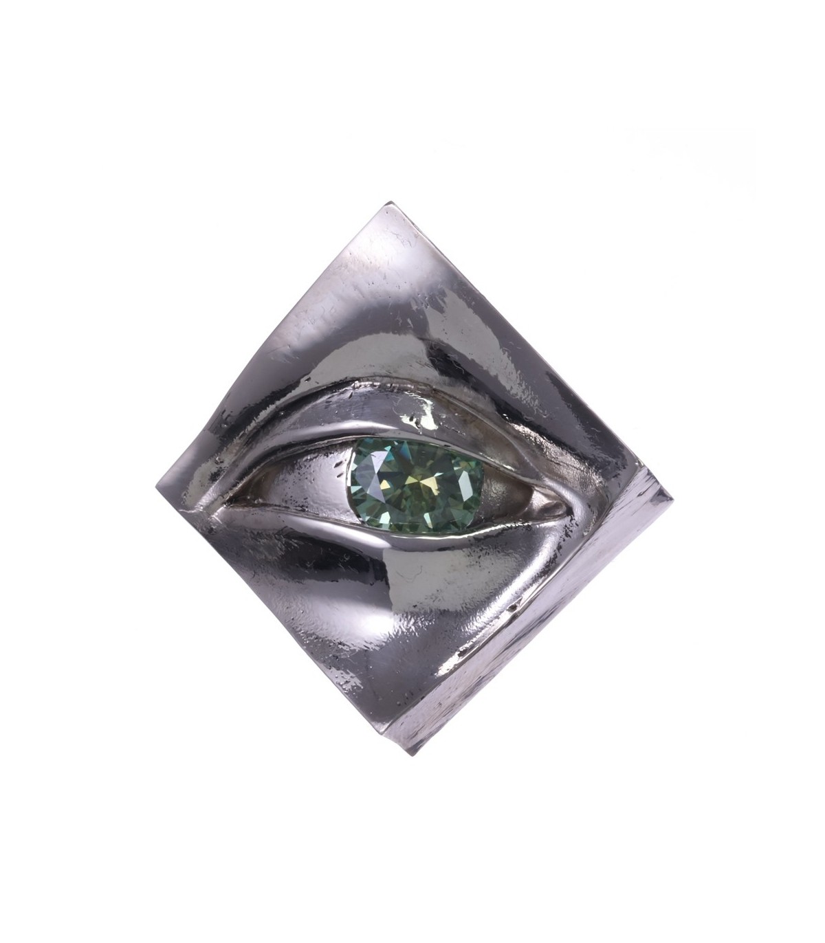 The sharp geometry of the square contrasts with the softness of the eye, creating a powerful visual tension. The moissanite pupil captures and reflects light with exceptional brilliance, drawing others in without demanding attention. It is luminous, ethical, and unmistakably present.