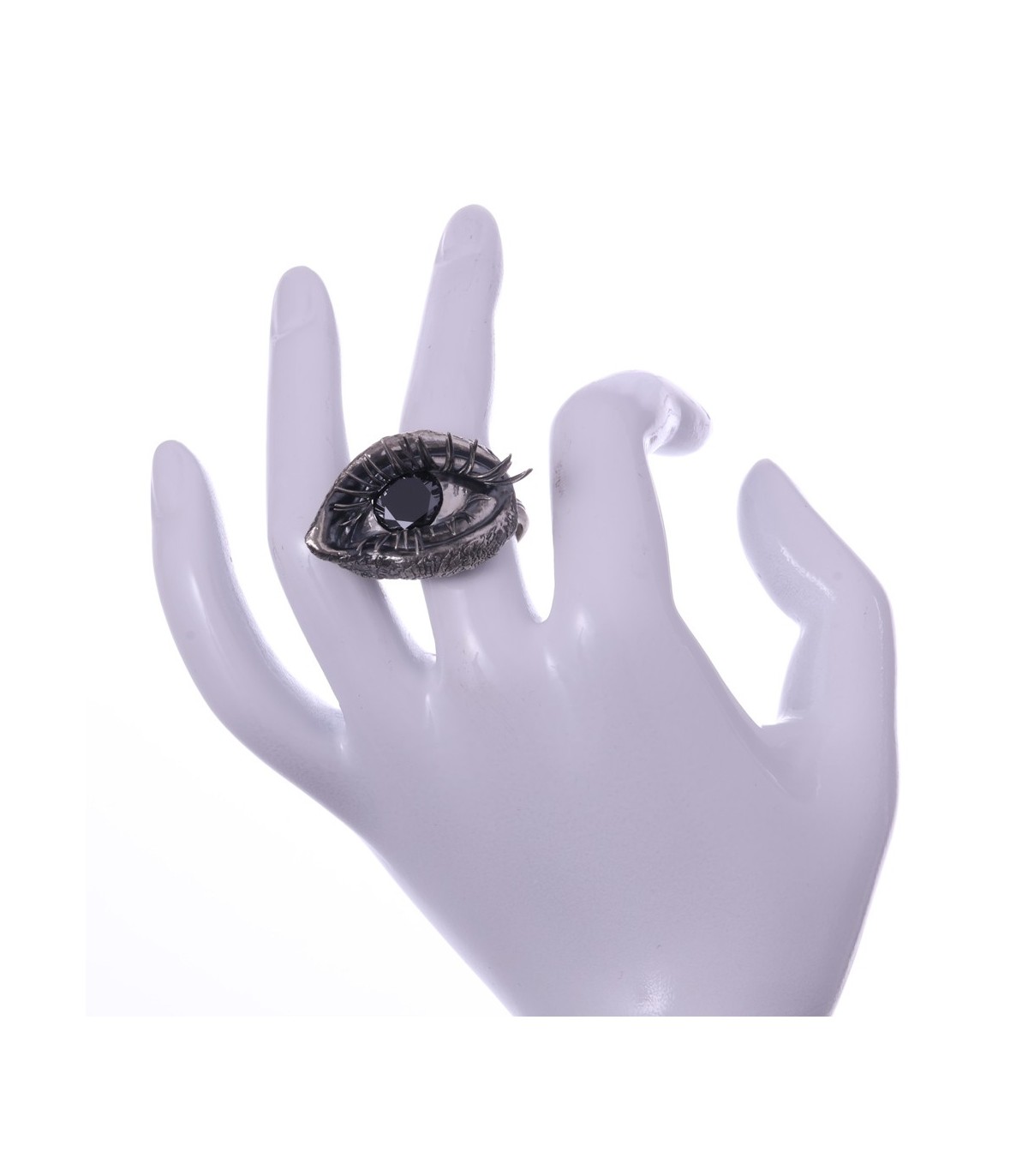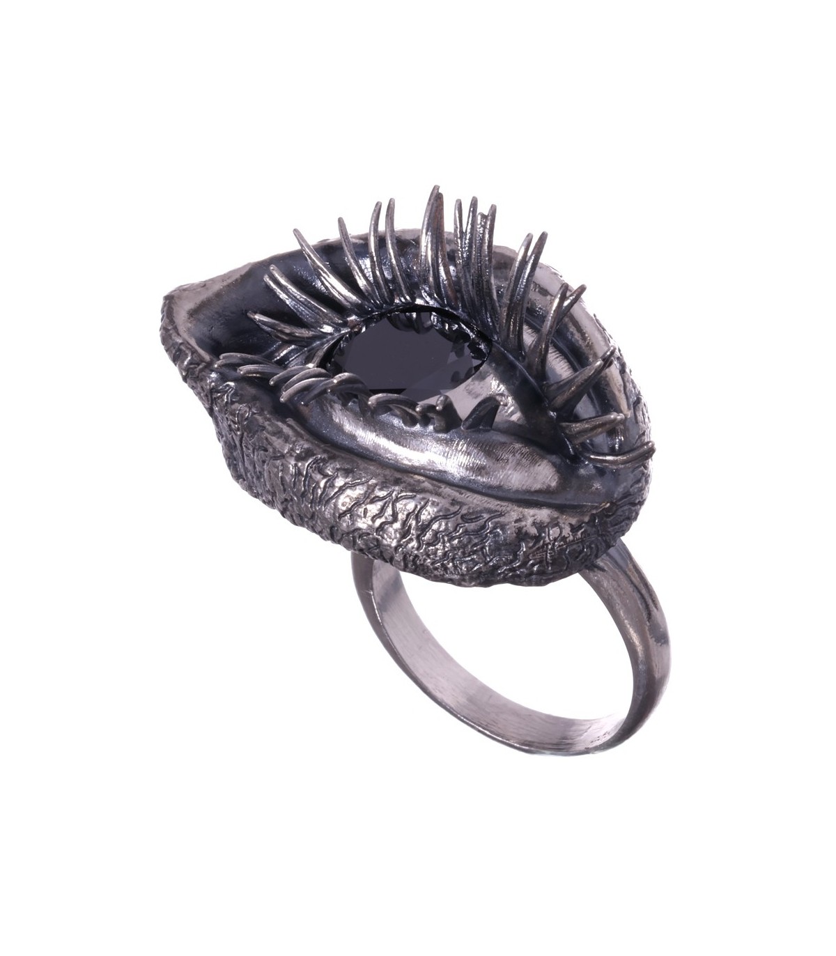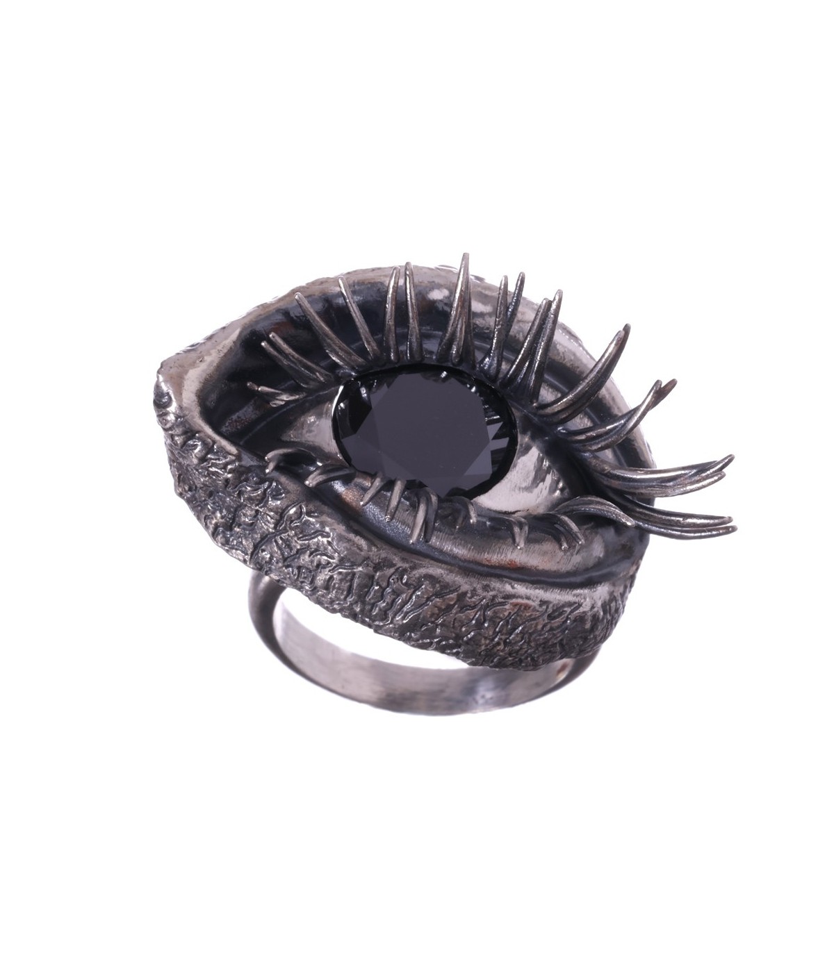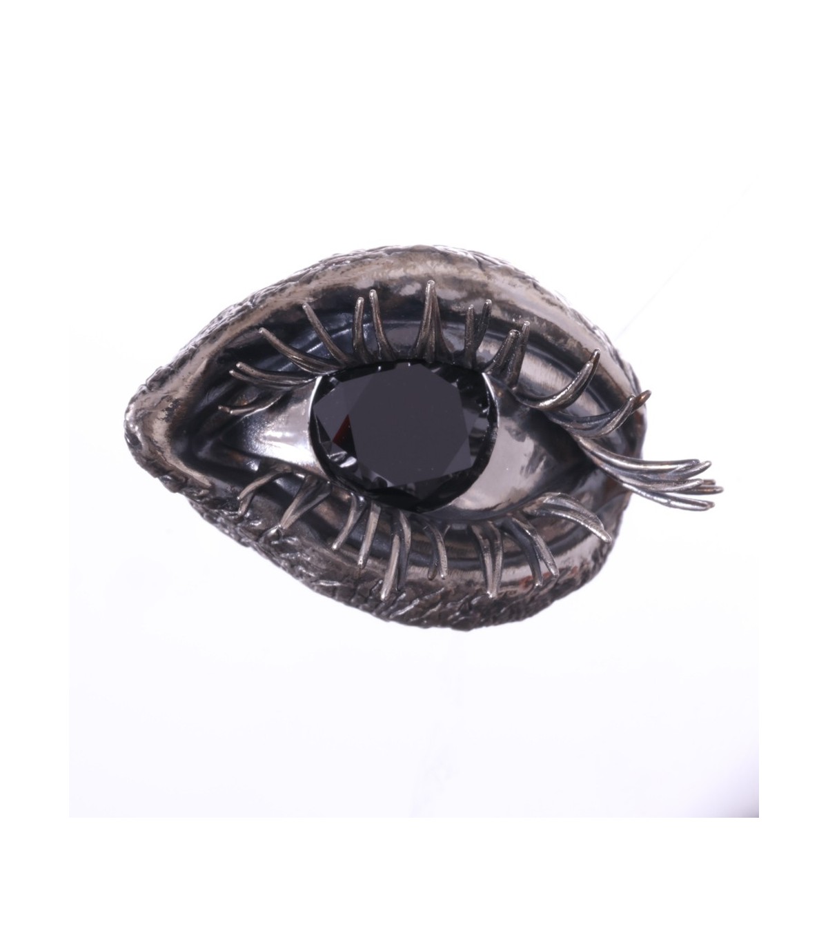 The ring takes on an anatomical eye shape, soft, organic, almost bodily. The eyelids flow naturally, framed by powerful, sensual lashes that give the gaze weight and undeniable allure.