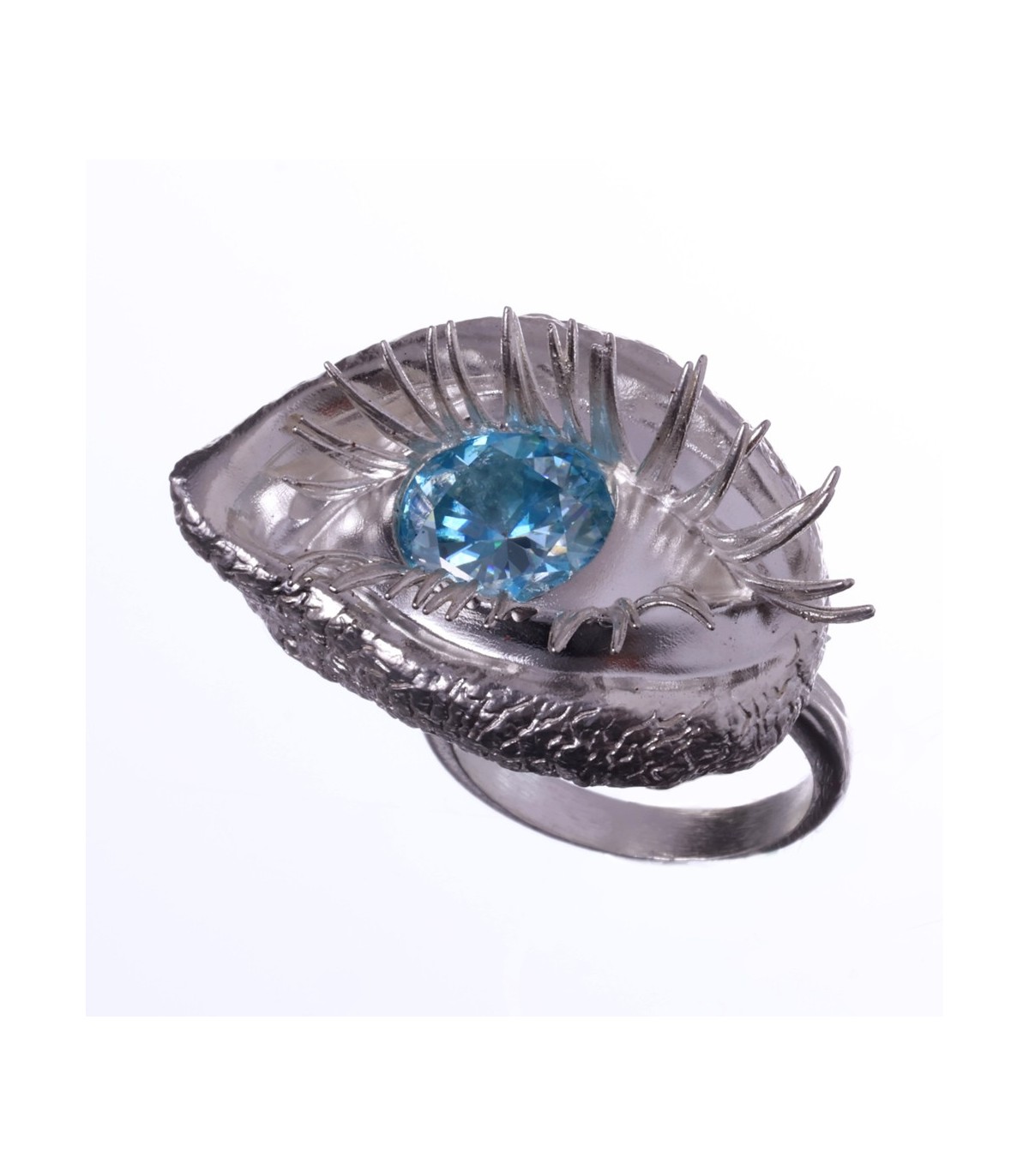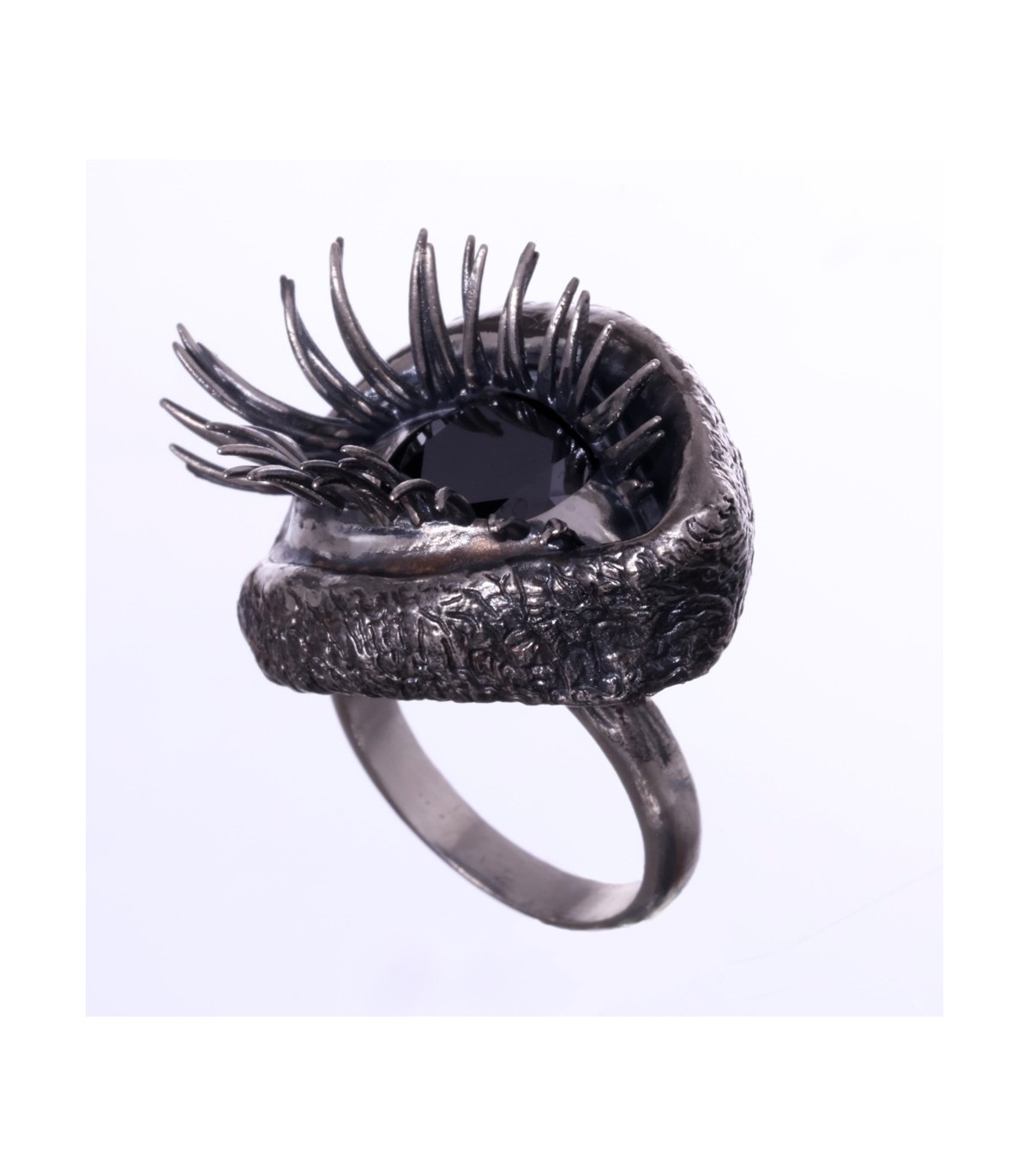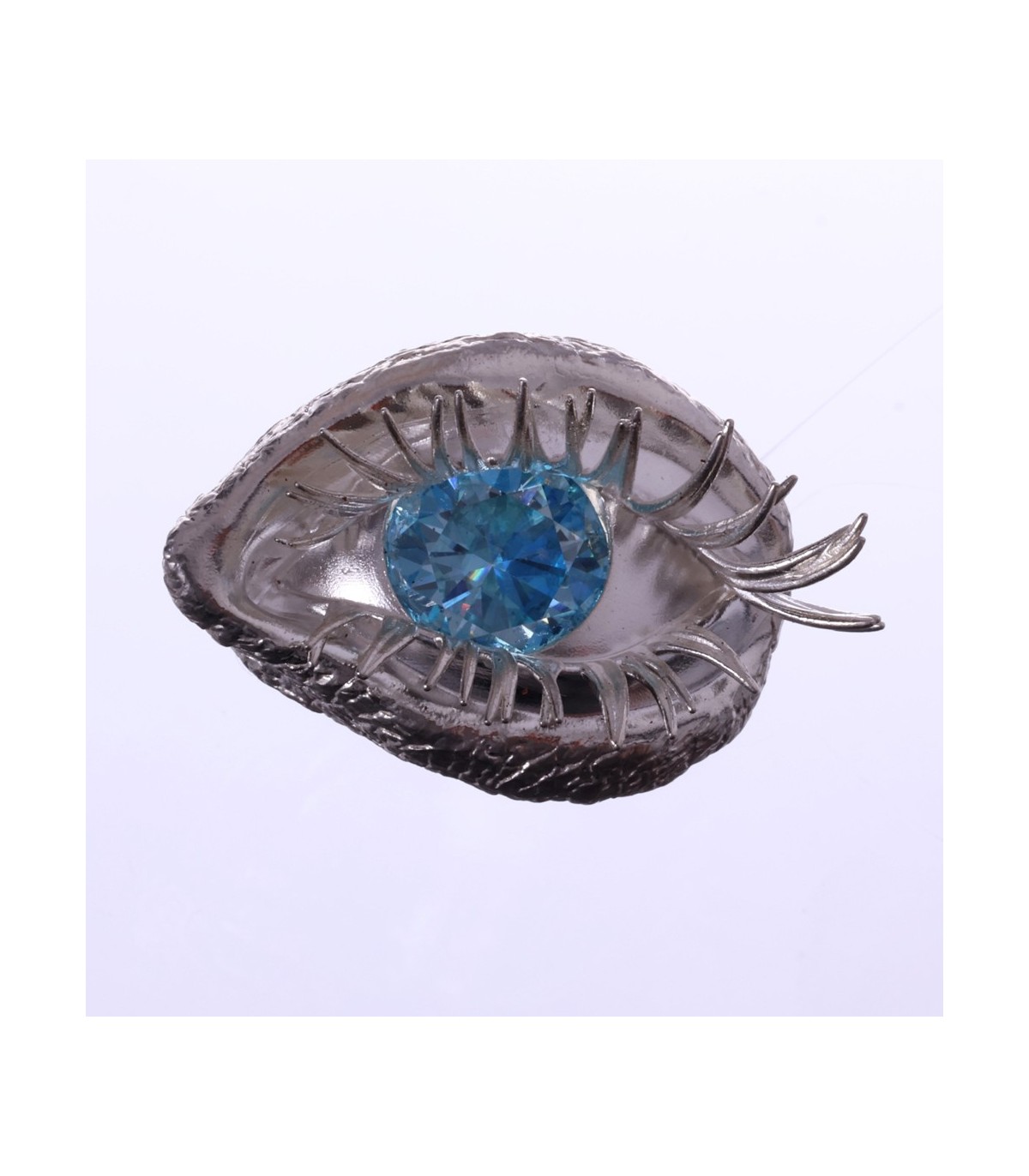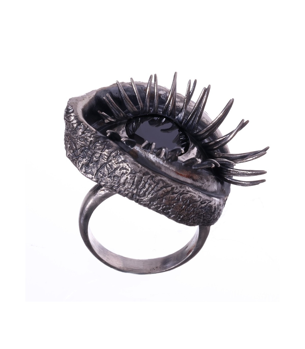 The ring takes on an anatomical eye shape, soft, organic, almost bodily. The eyelids flow naturally, framed by powerful, sensual lashes that give the gaze weight and undeniable allure.
