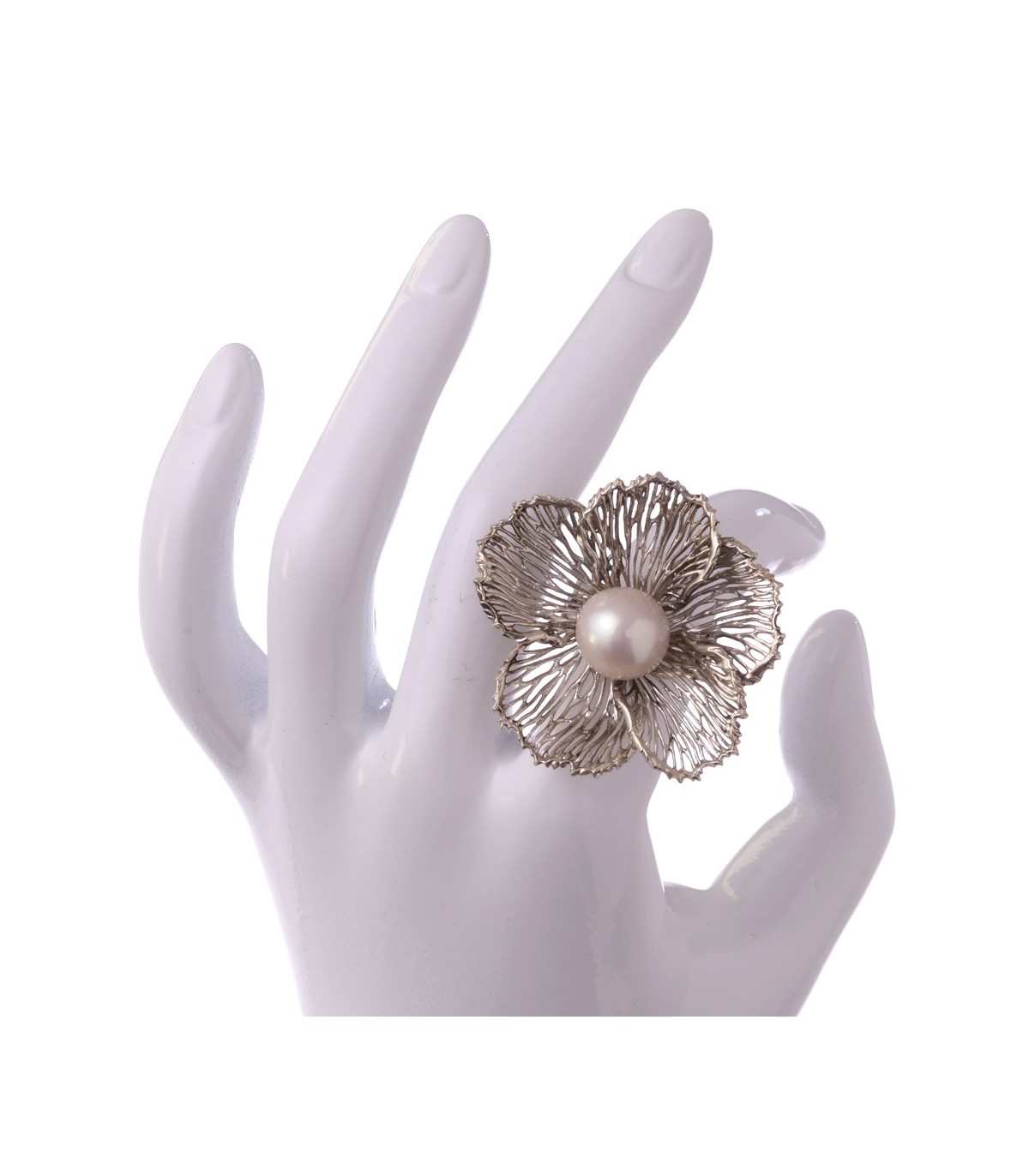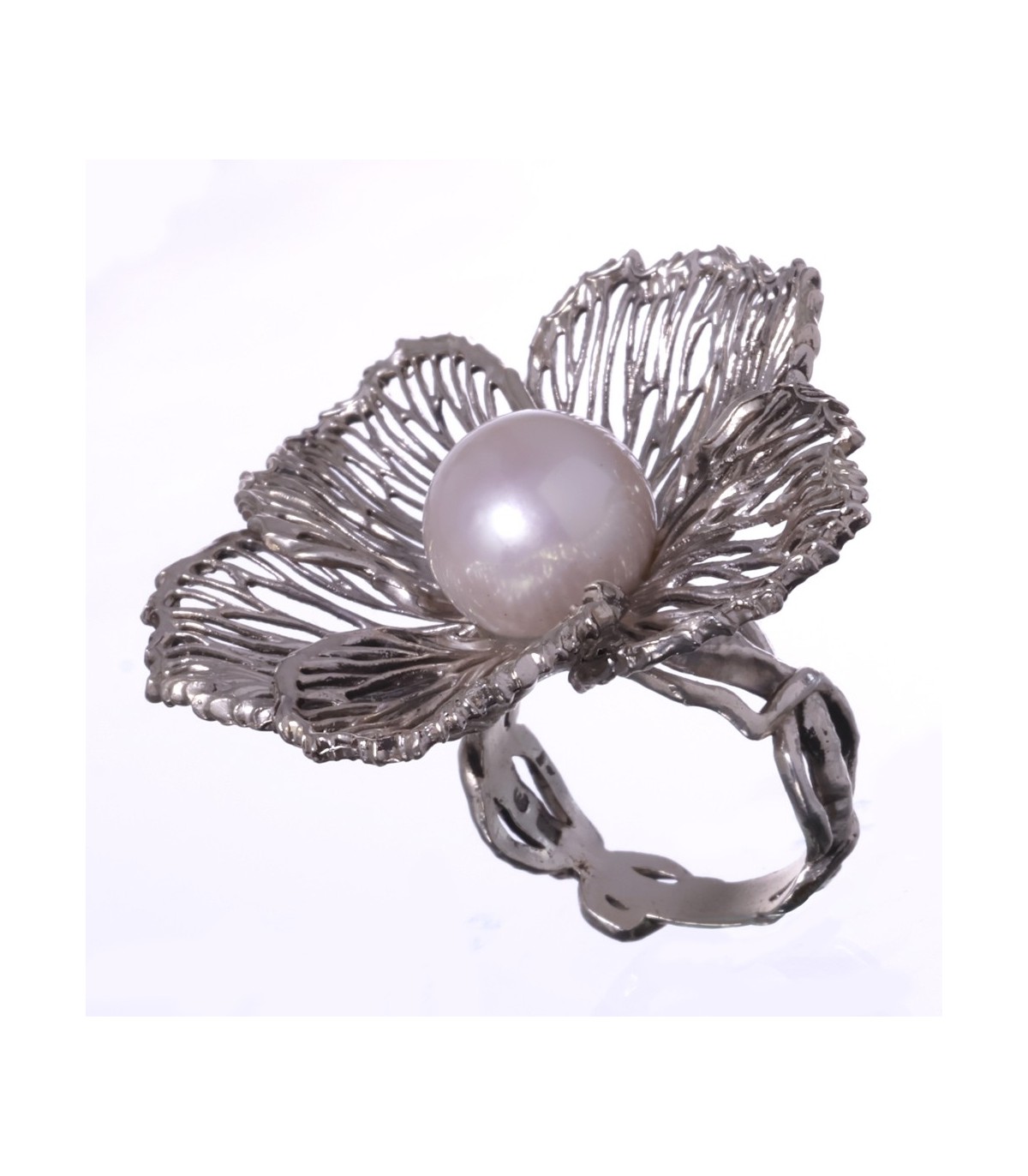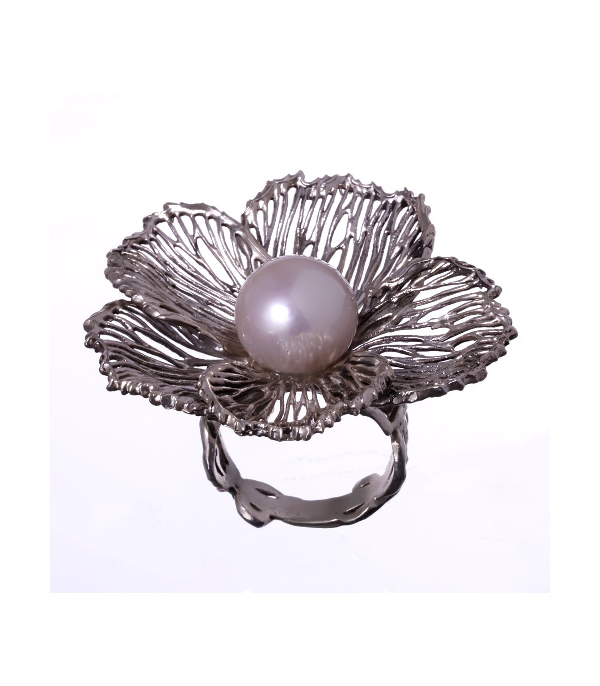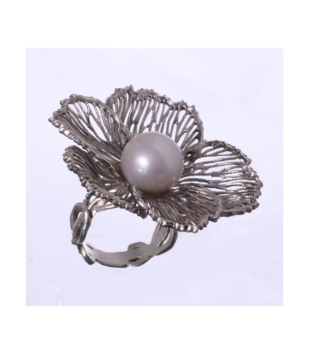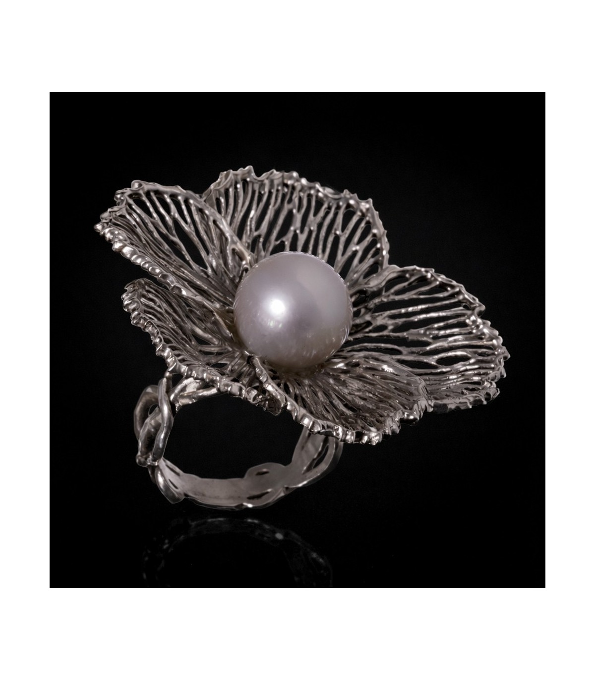 Delicate yet distinctive, the Meconopsis Baileyi ring is handcrafted in 925 sterling silver and adorned with a 12 mm AAA-grade white pearl. Inspired by the rare Himalayan blue poppy, this ring features openwork, lace-like petals that give the design a sense of air and movement.