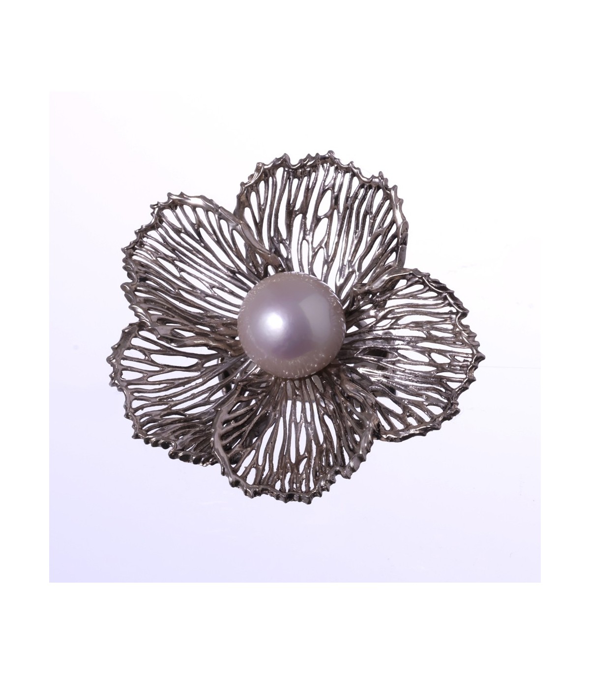 The silver petals form an intricate frame around the pearl, allowing light to pass through and animate the entire piece. The pearl glows softly at the center, offering calm, balance, and natural elegance.