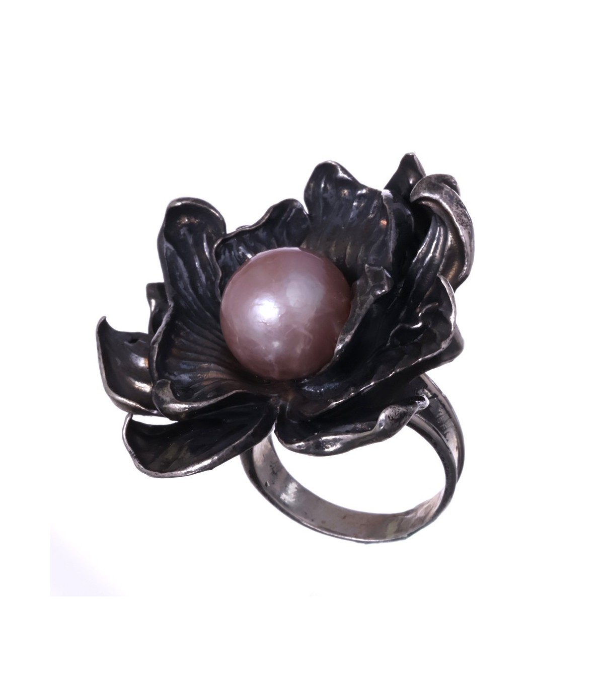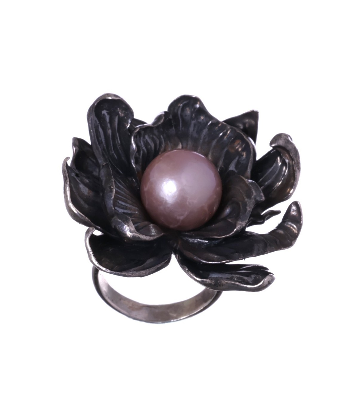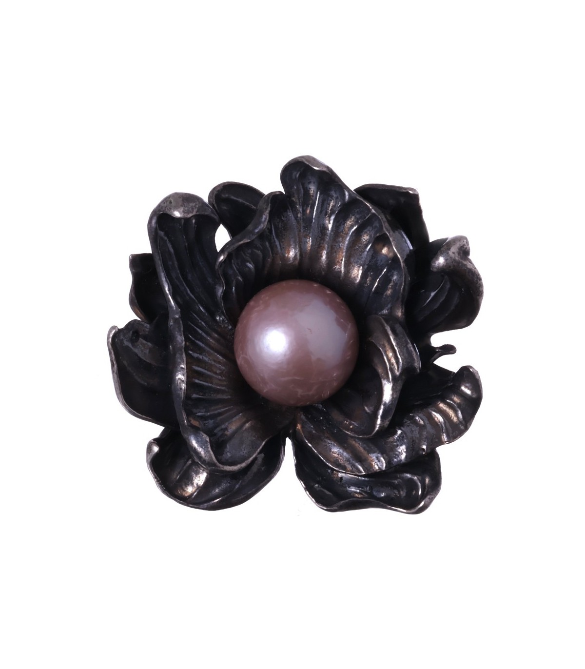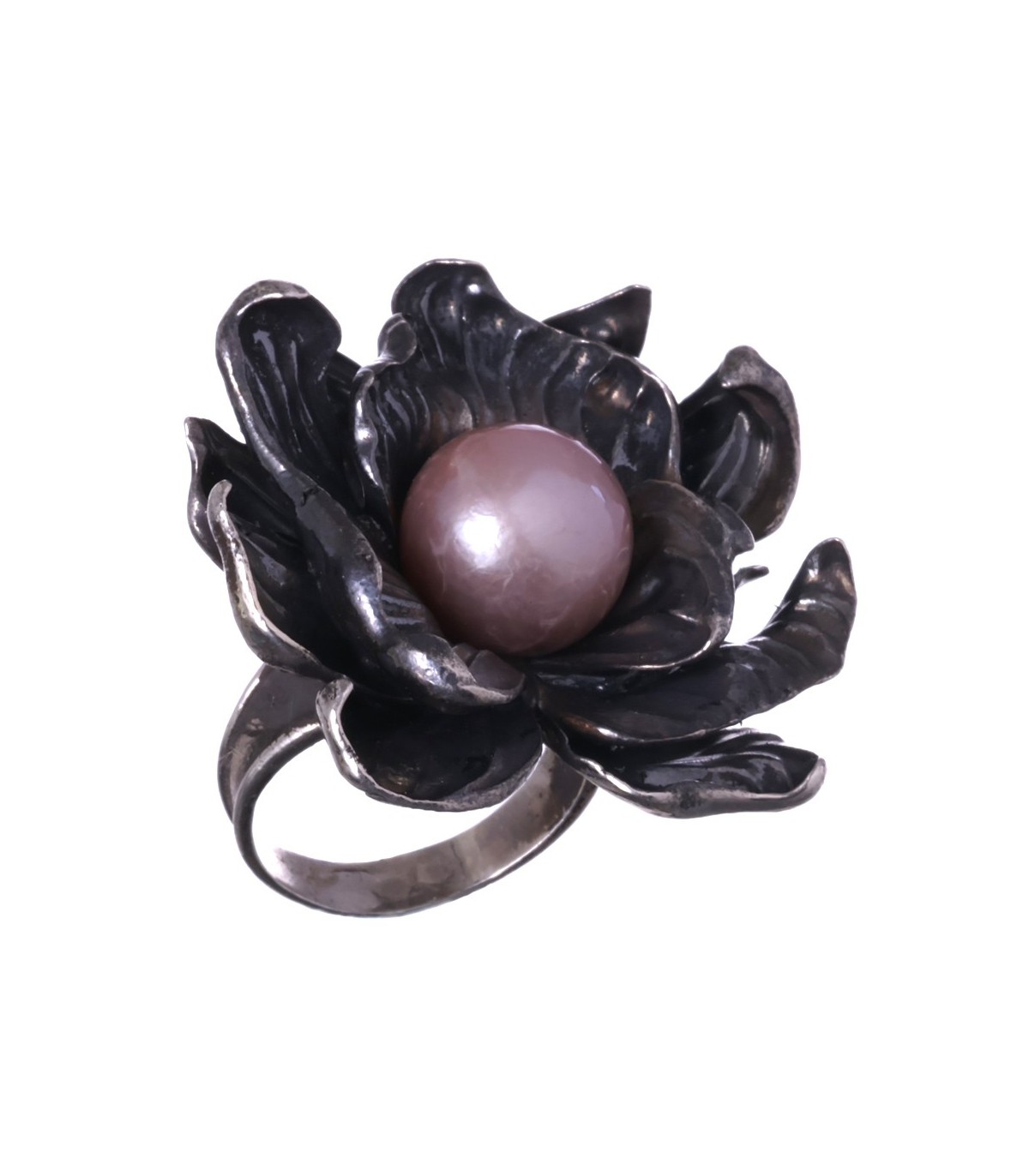 The sculpted silver petals cradle the pearl in a natural, flowing form, allowing its warm blush tones to radiate softly. The contrast between the organic silver texture and the pearl’s smooth surface creates a soothing, intimate composition.