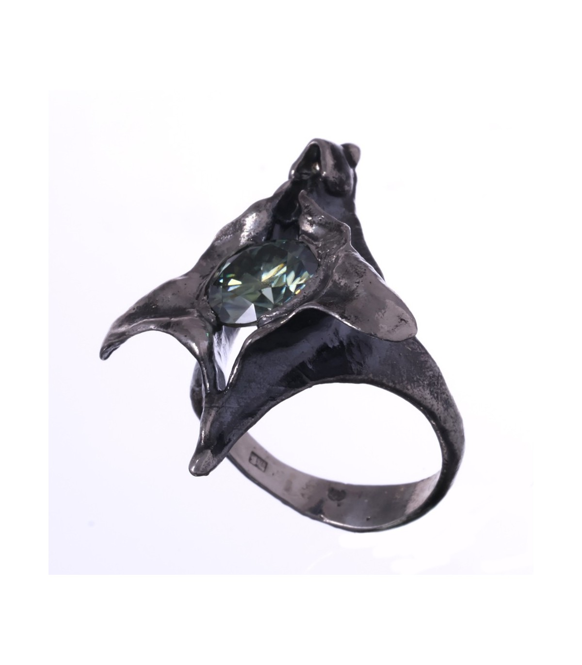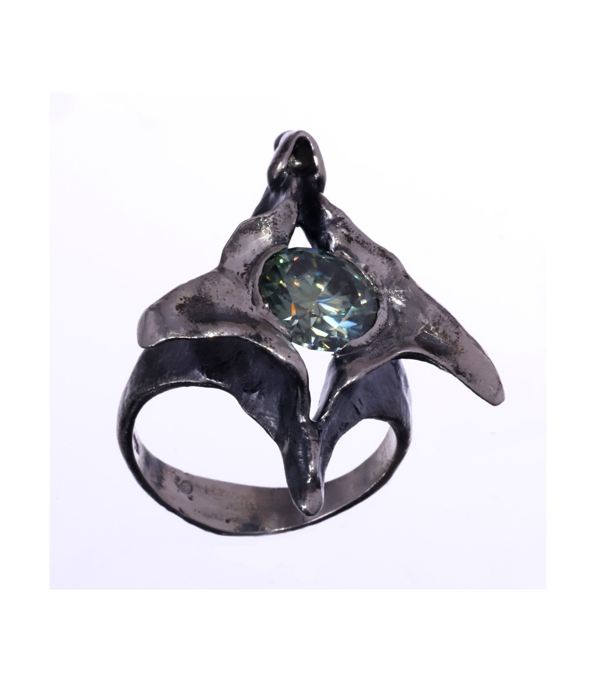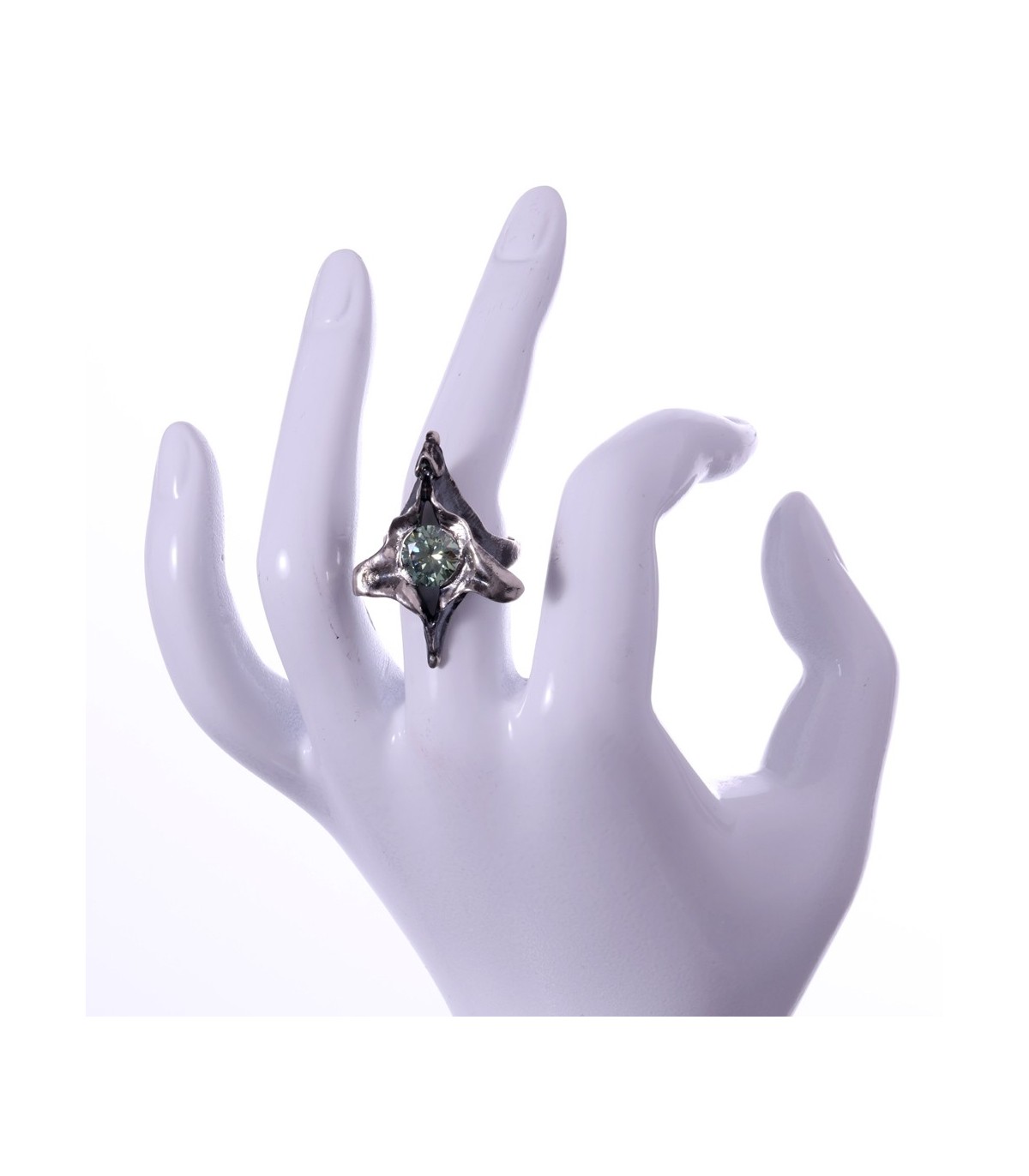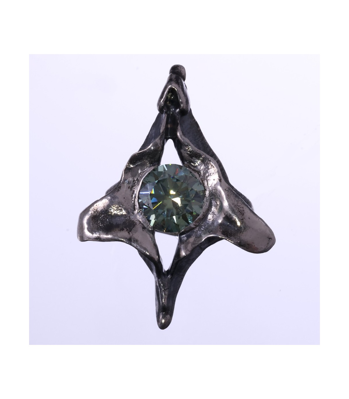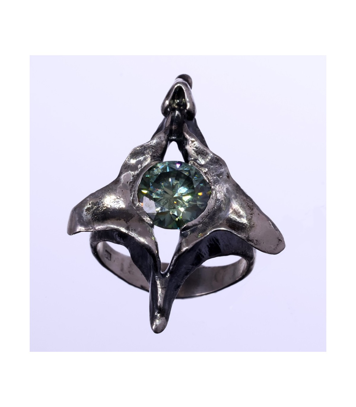 At its core lies a 3 ct green moissanite, glowing with clarity and depth. Its brilliance creates a gentle dialogue with the darker textures of the silver, balancing light and shadow, presence and restraint.