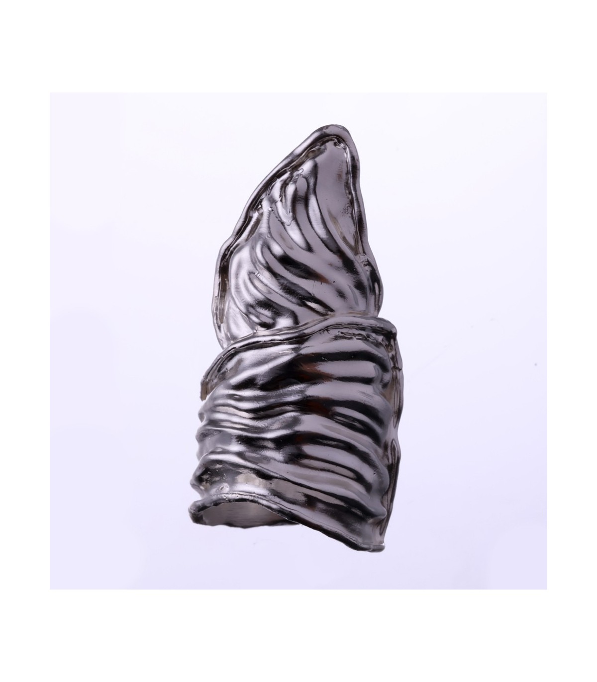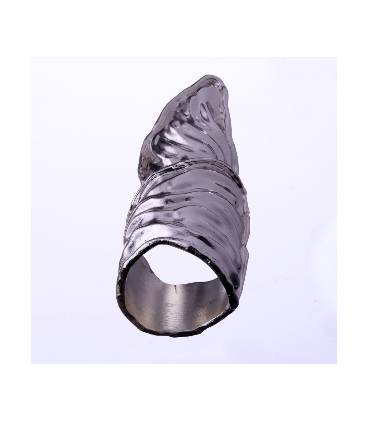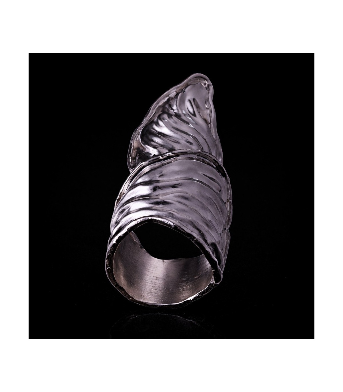The surface is deeply contoured, marked by flowing ridges and layered textures that interact with light and shadow. These sculpted lines emphasize movement and depth, revealing the trace of the human hand and the honesty of process. The extended form enhances the ring’s architectural character, giving it a sense of reach and intention while remaining organic and intuitive.