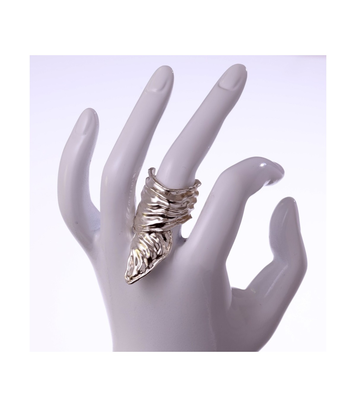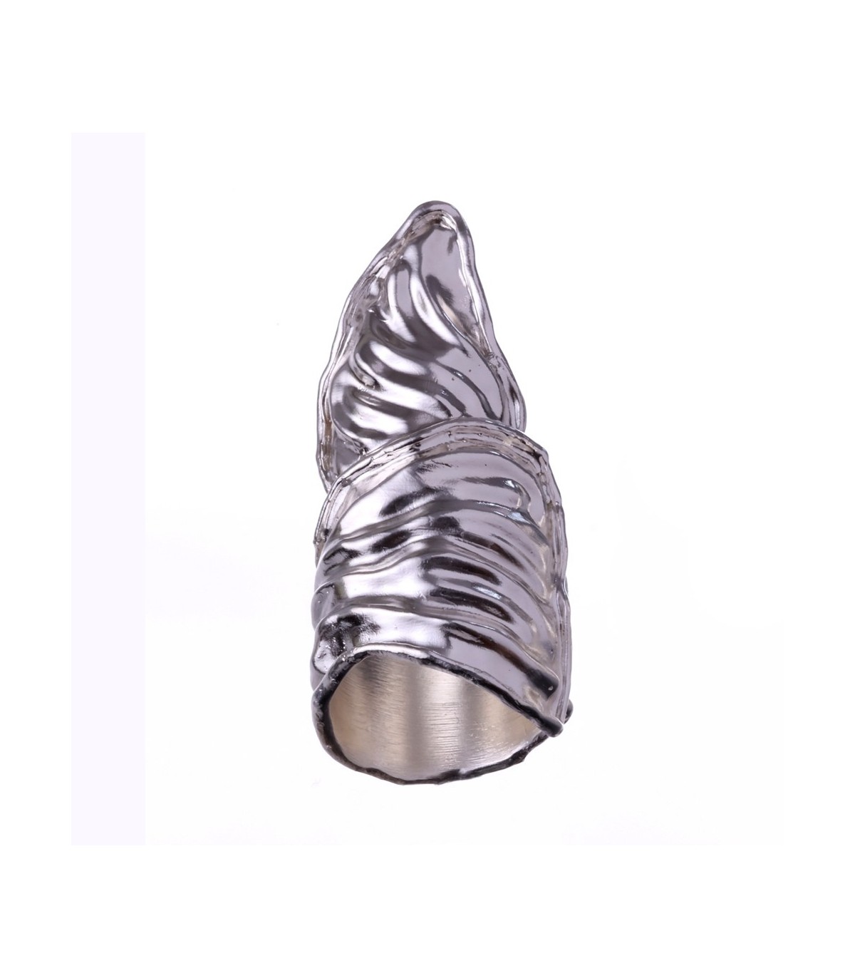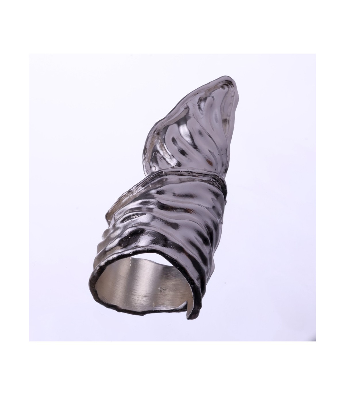 The surface is deeply contoured, marked by flowing ridges and layered textures that interact with light and shadow. These sculpted lines emphasize movement and depth, revealing the trace of the human hand and the honesty of process. The extended form enhances the ring’s architectural character, giving it a sense of reach and intention while remaining organic and intuitive.