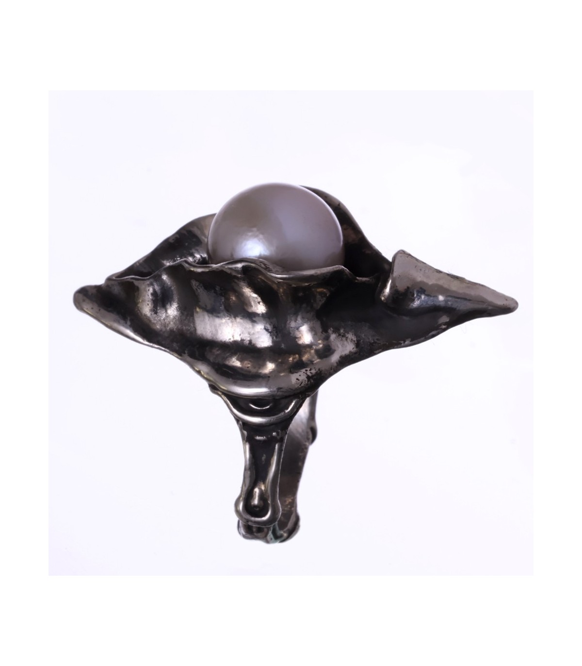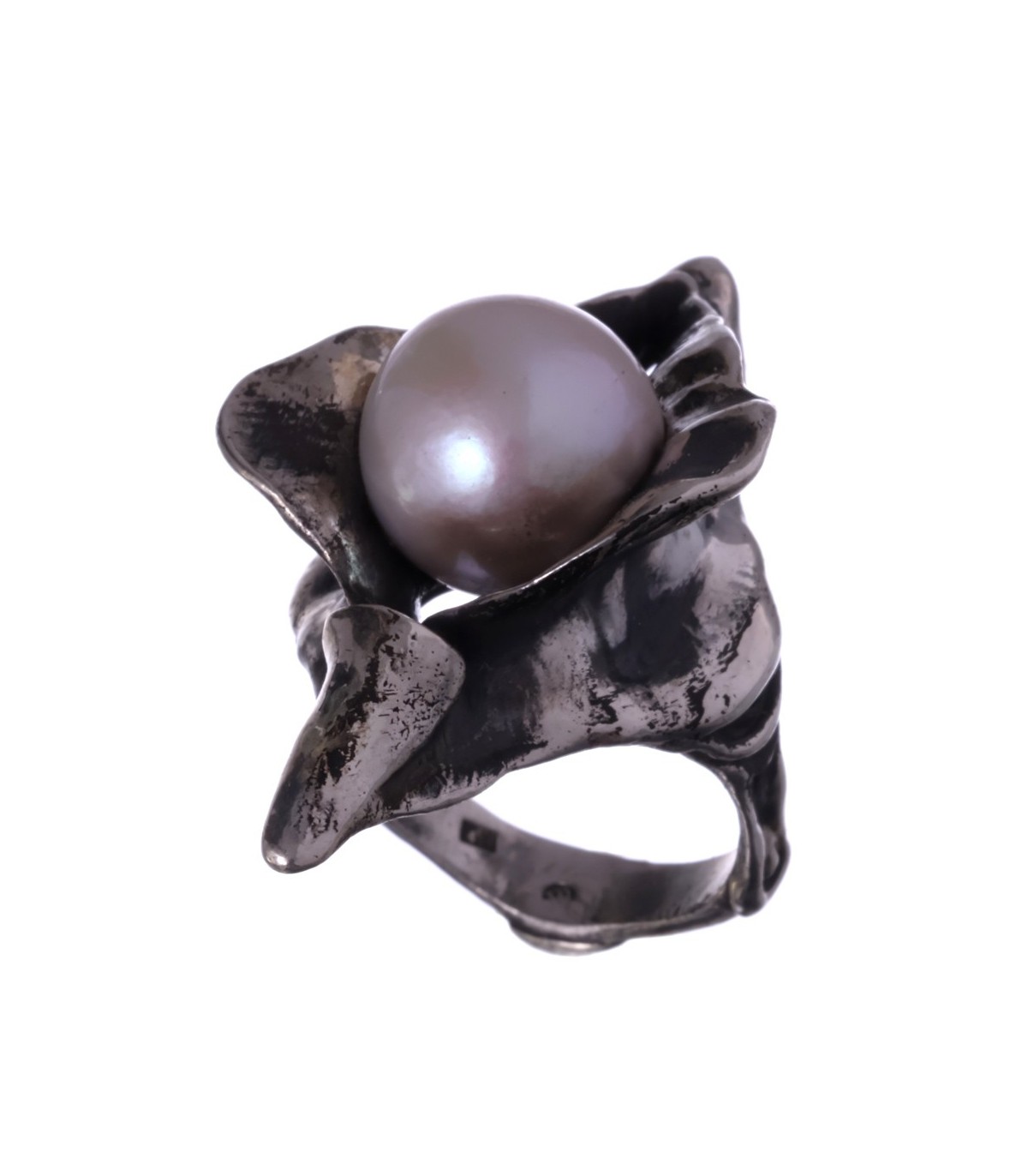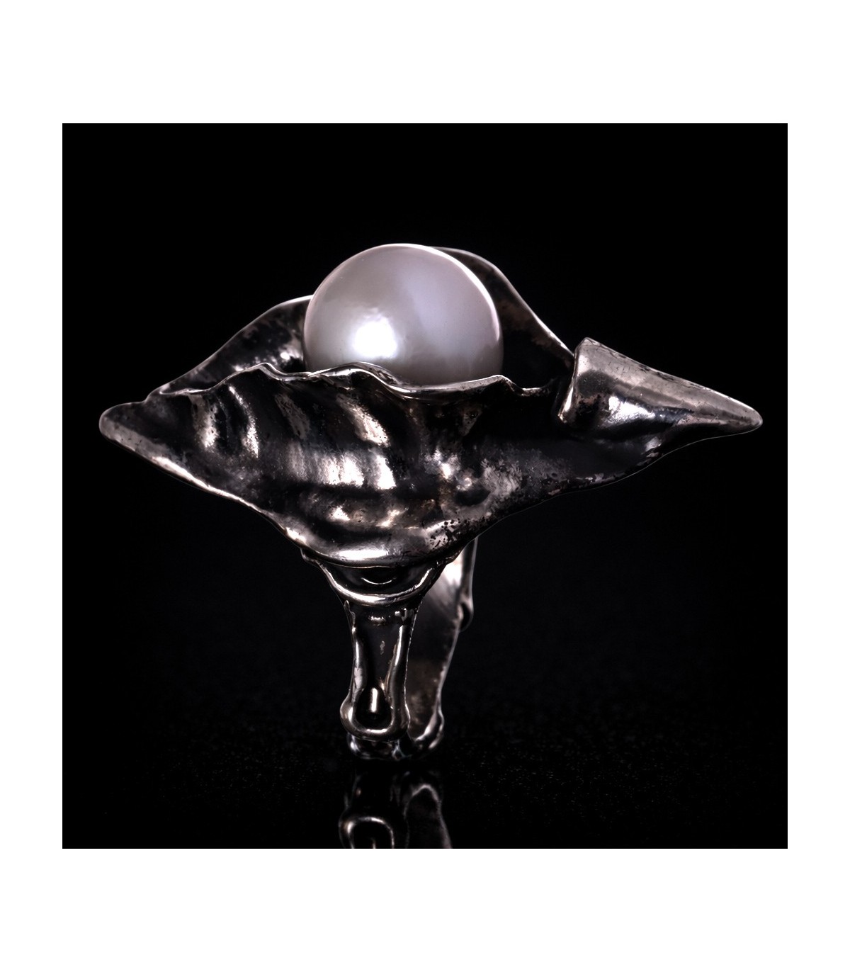 At its center rests a 12 mm AAA-grade pearl, luminous and commanding. Its soft, natural glow contrasts with the raw sculptural silver, creating a powerful dialogue between tenderness and resilience. The pearl does not decorate the form—it anchors it.