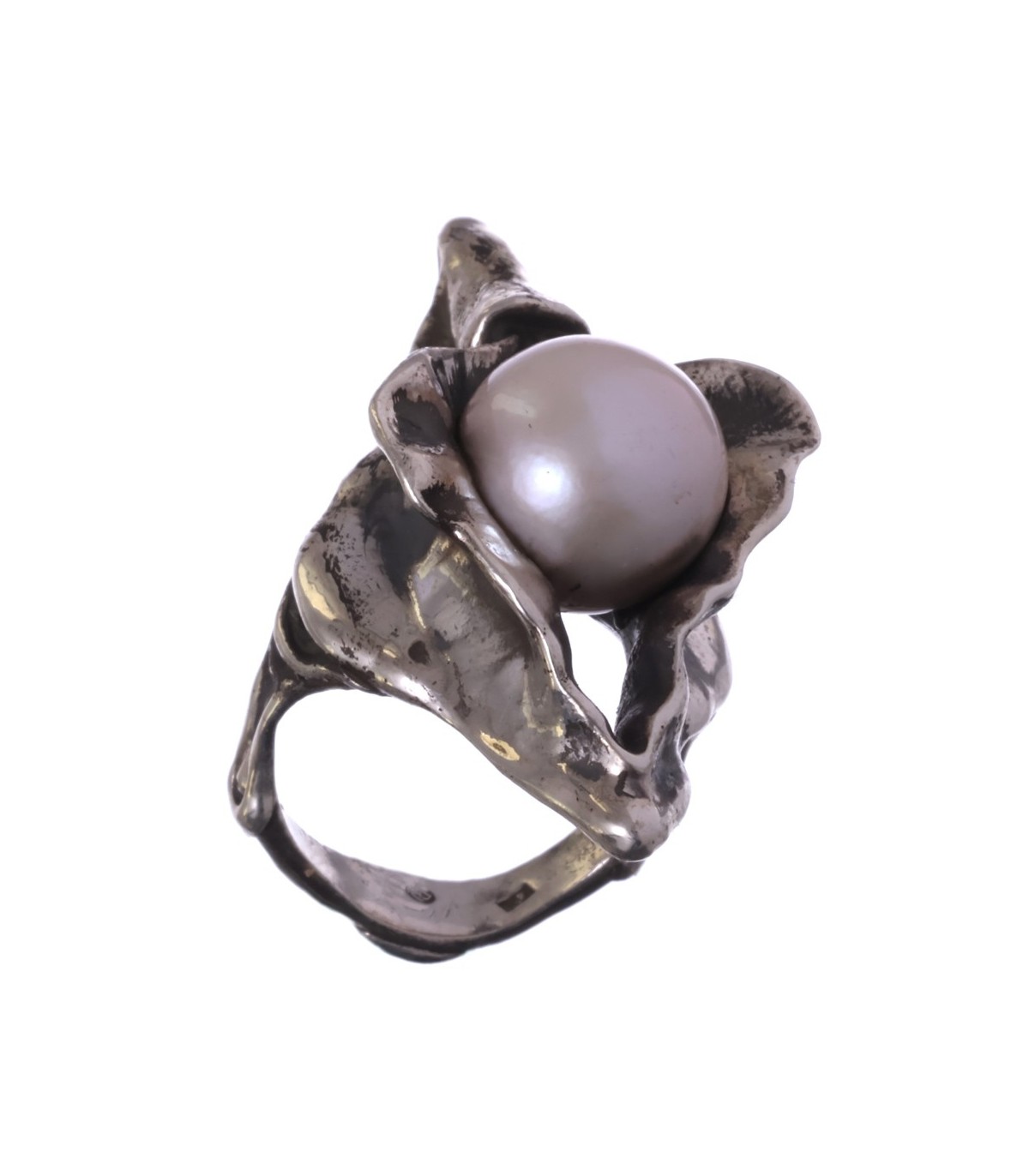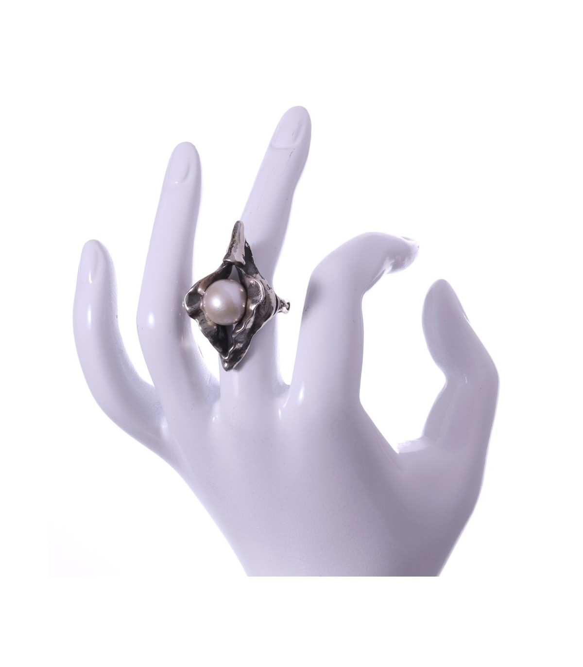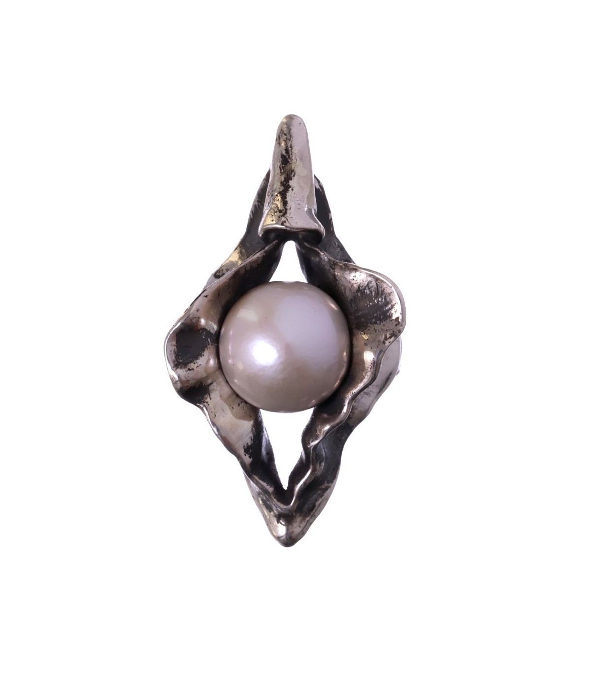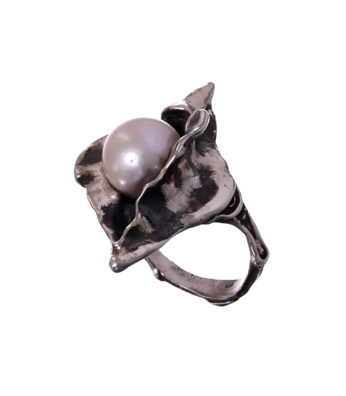 At its center rests a 12 mm AAA-grade pearl, luminous and commanding. Its soft, natural glow contrasts with the raw sculptural silver, creating a powerful dialogue between tenderness and resilience. The pearl does not decorate the form—it anchors it.