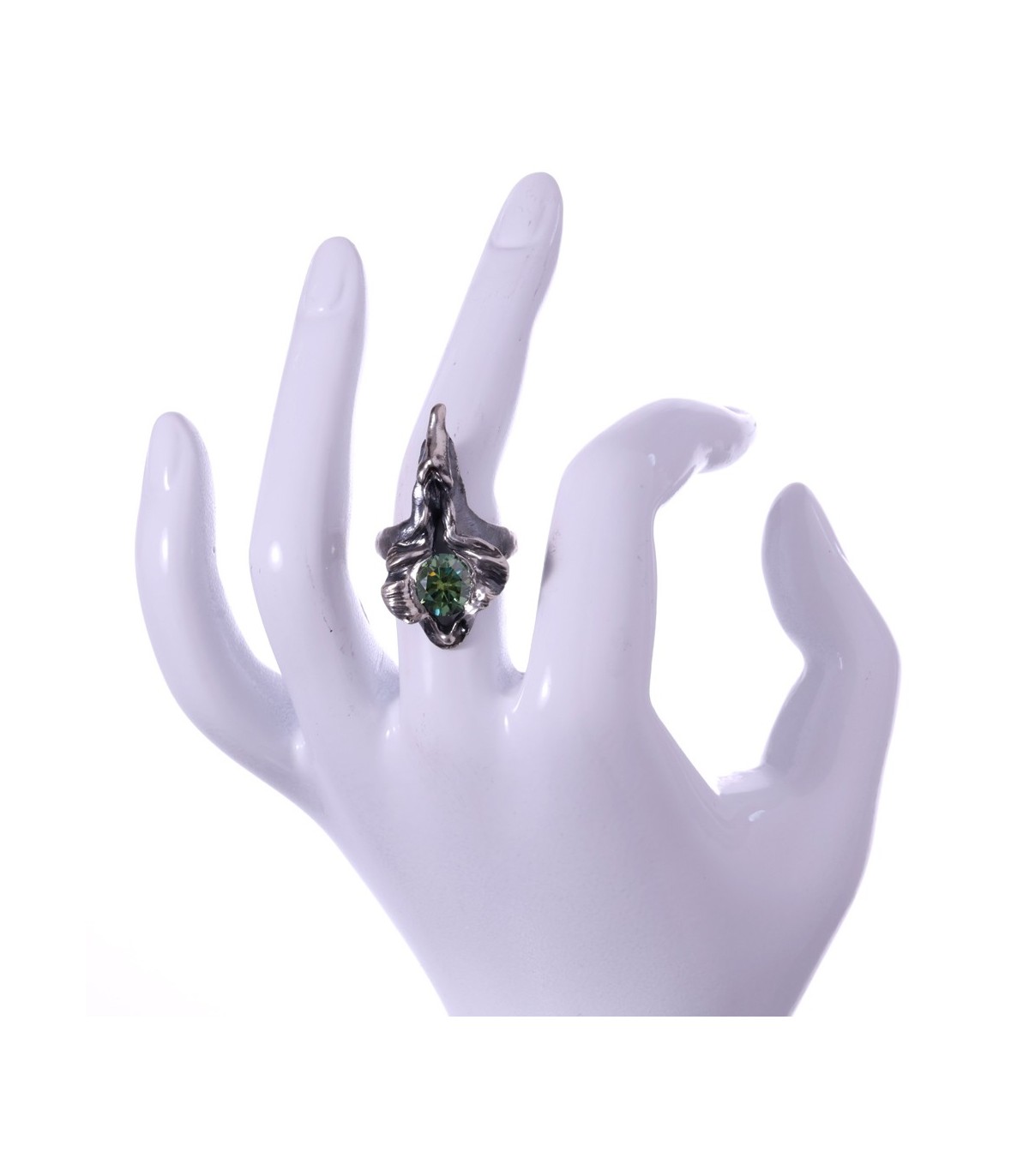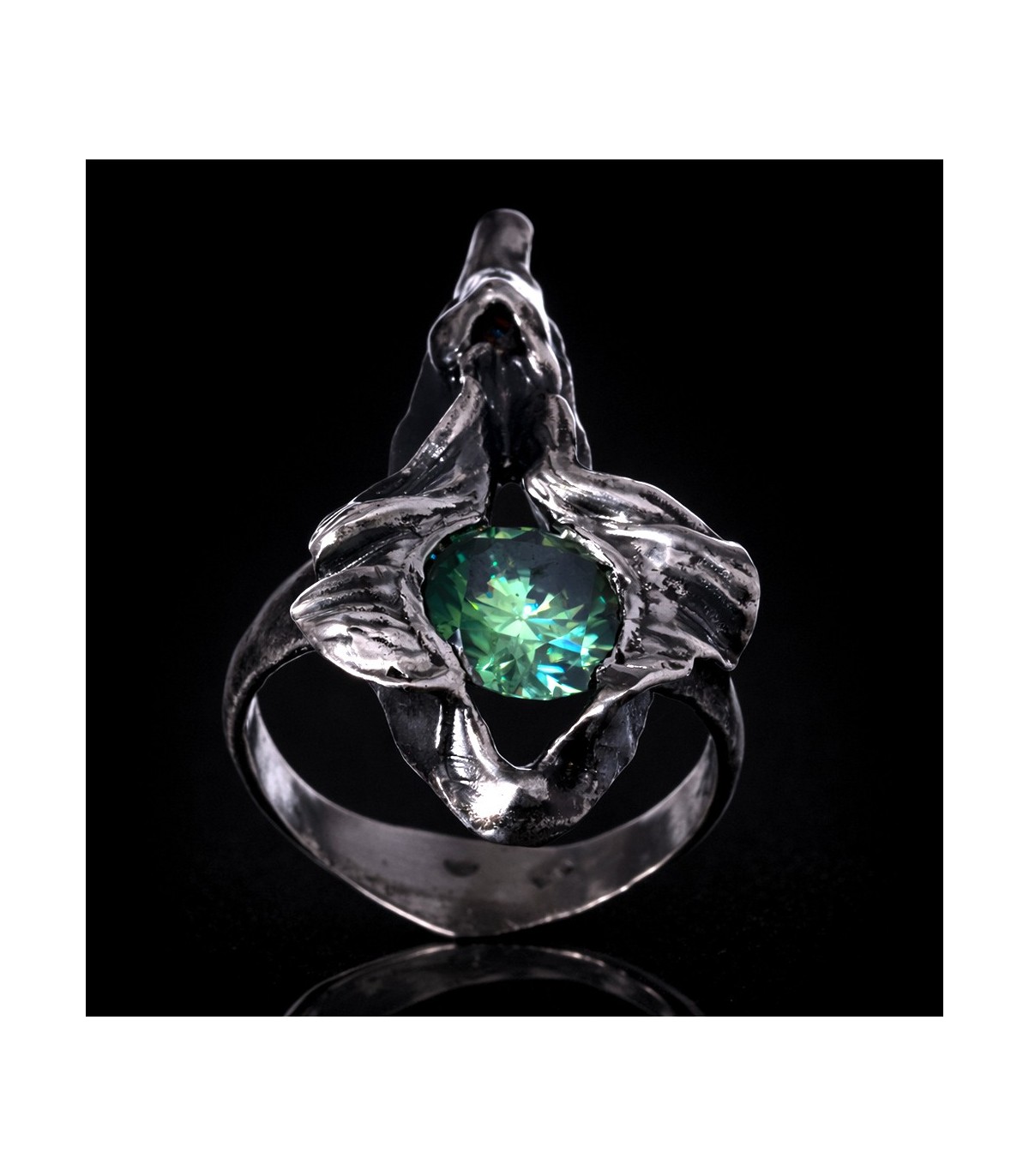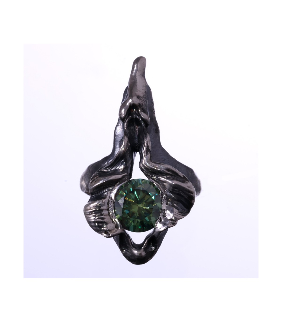 The central 3 ct green moissanite captures and refracts light with a living quality, suggesting resilience and quiet endurance rather than brilliance alone. The silver surface bears visible traces of process and touch, reinforcing the sense of something earned rather than polished.