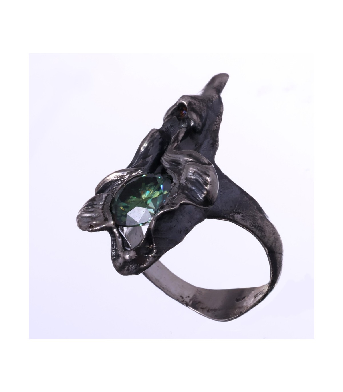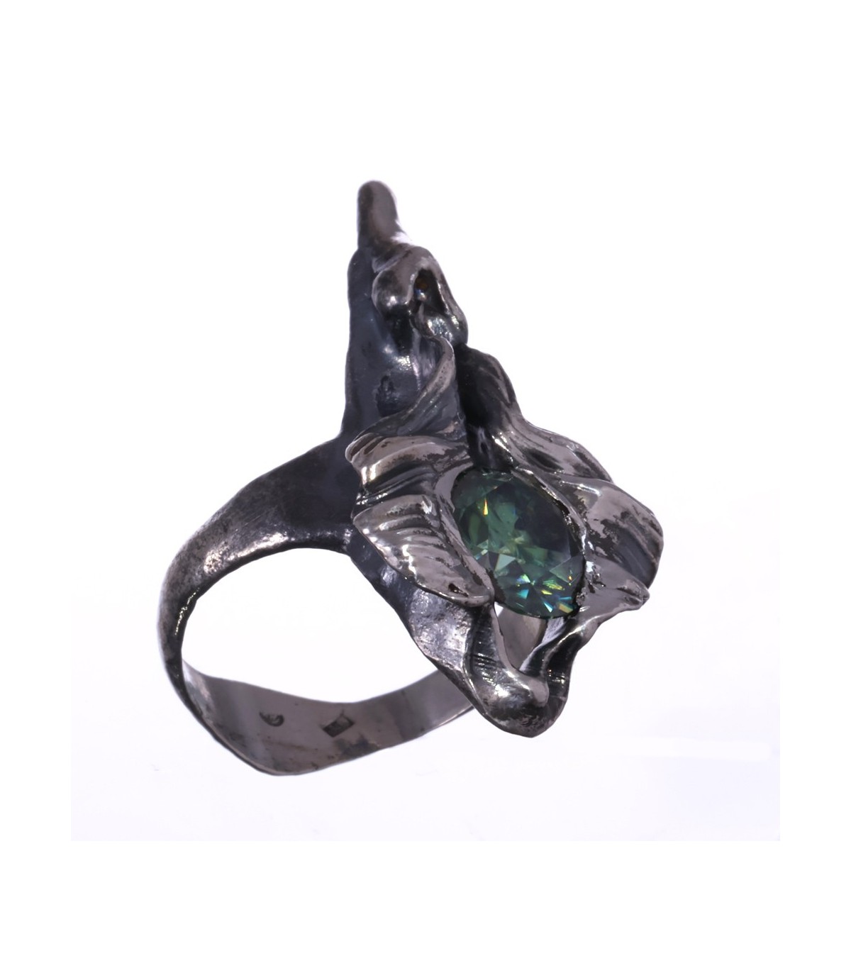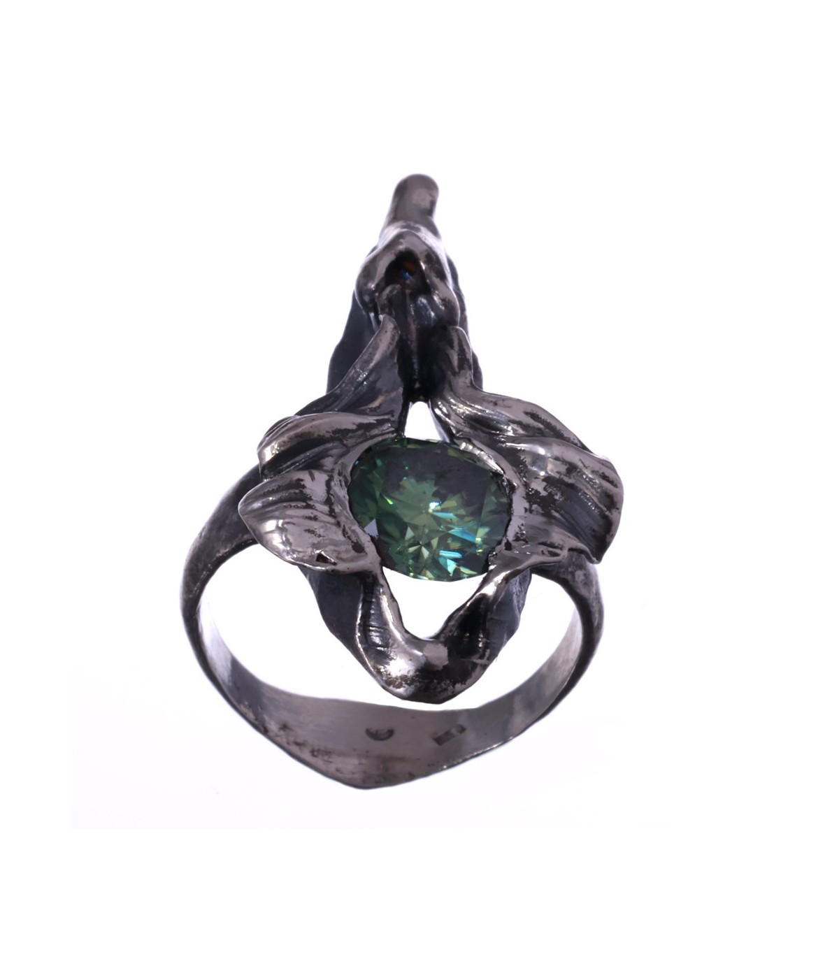The central 3 ct green moissanite captures and refracts light with a living quality, suggesting resilience and quiet endurance rather than brilliance alone. The silver surface bears visible traces of process and touch, reinforcing the sense of something earned rather than polished.