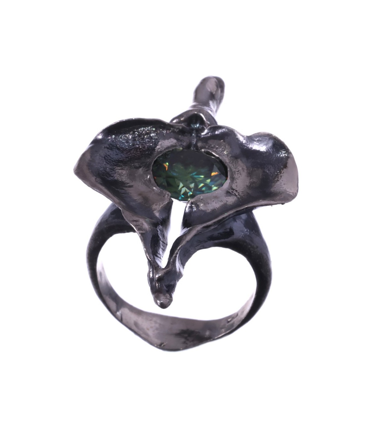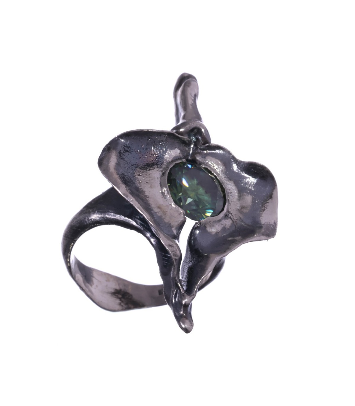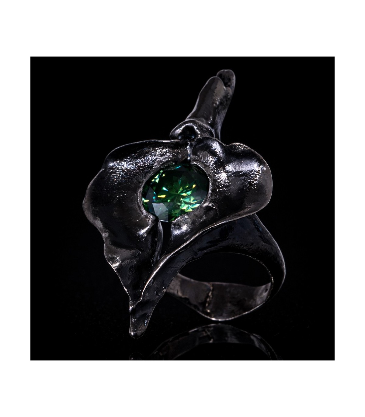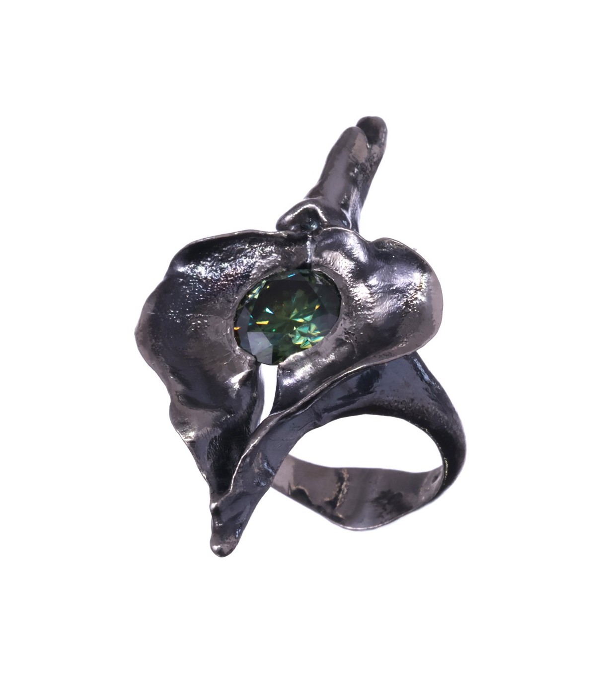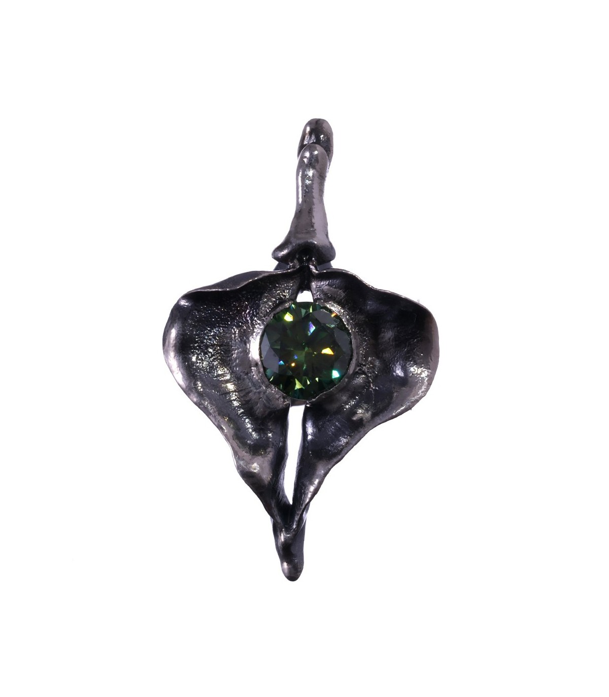 The 3 ct green moissanite set within the form acts as a visual heartbeat—focused, luminous, and restrained. It draws attention inward, toward contemplation rather than display.