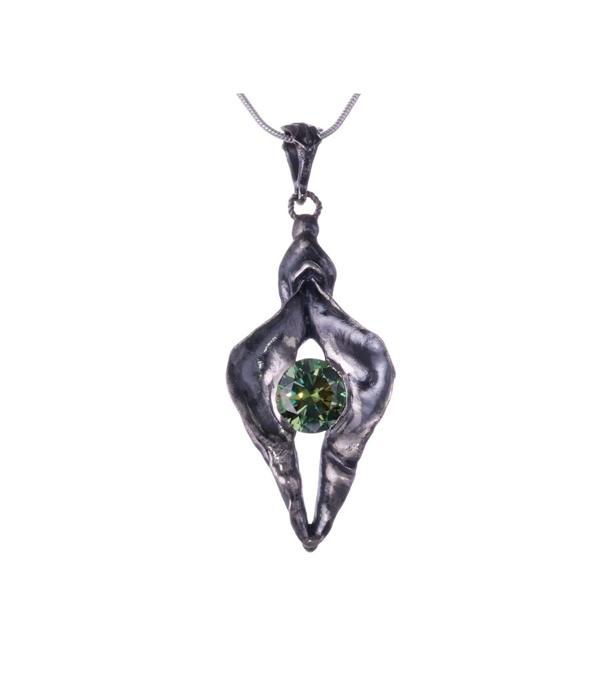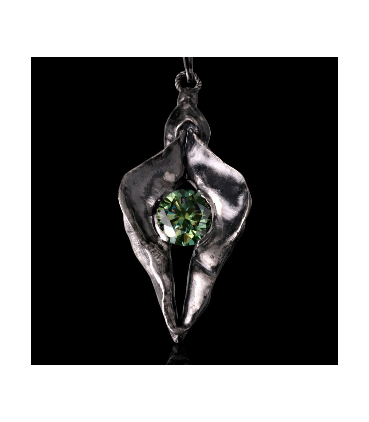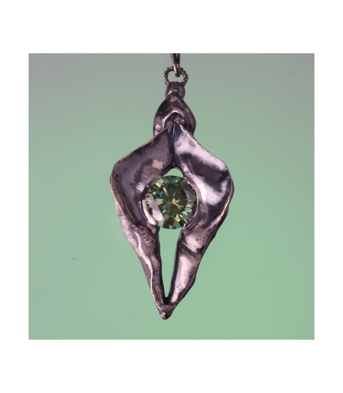 This silver pendant honors the vagina as a source of resilience and continuity. Its sculptural form is open and grounded, consciously shaped to celebrate the feminine body as the place where strength is born and sustained. At its center burns a 3-carat moissanite, a stone known for its exceptional brilliance and durability.