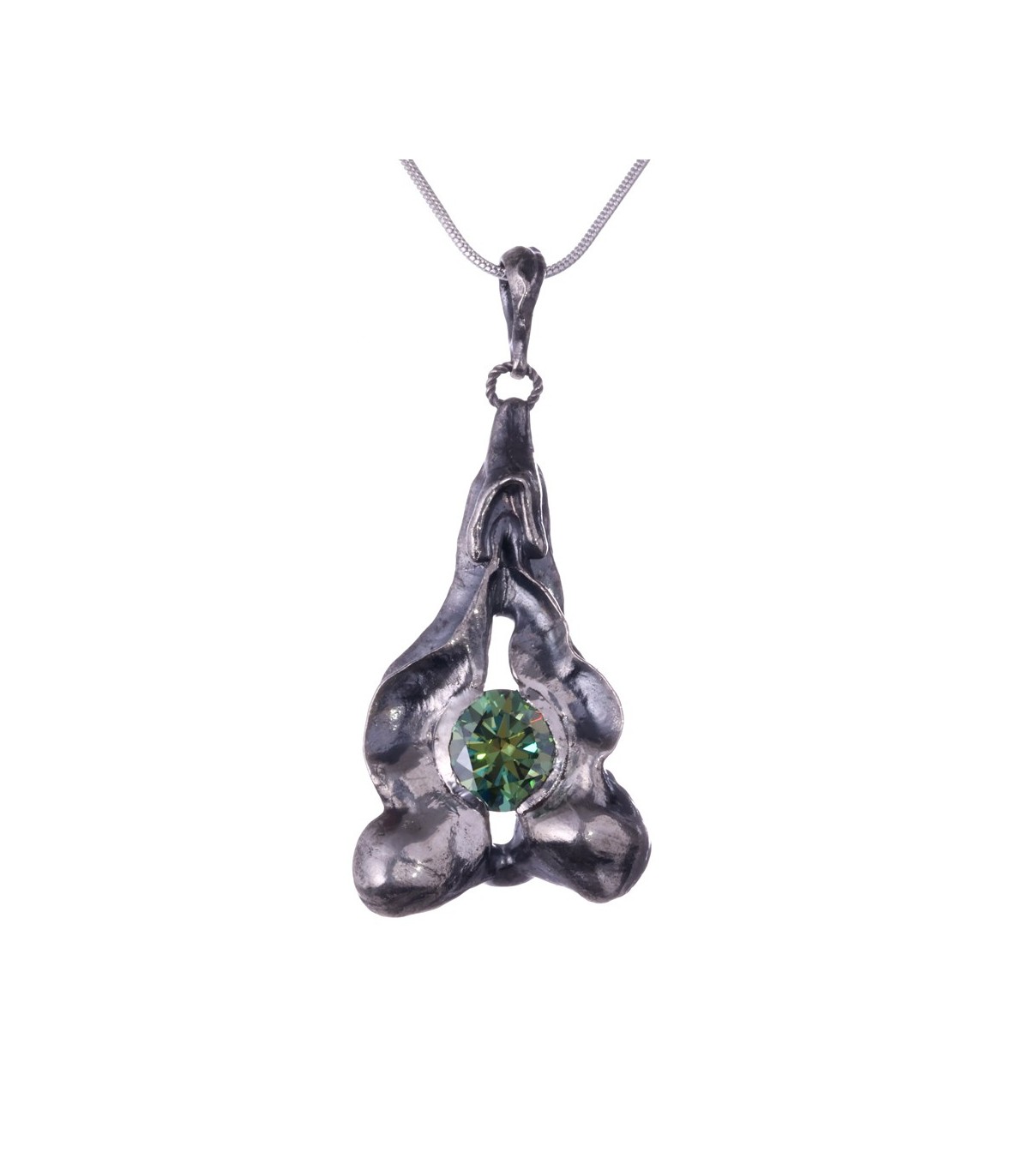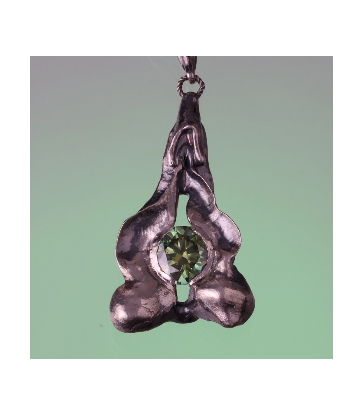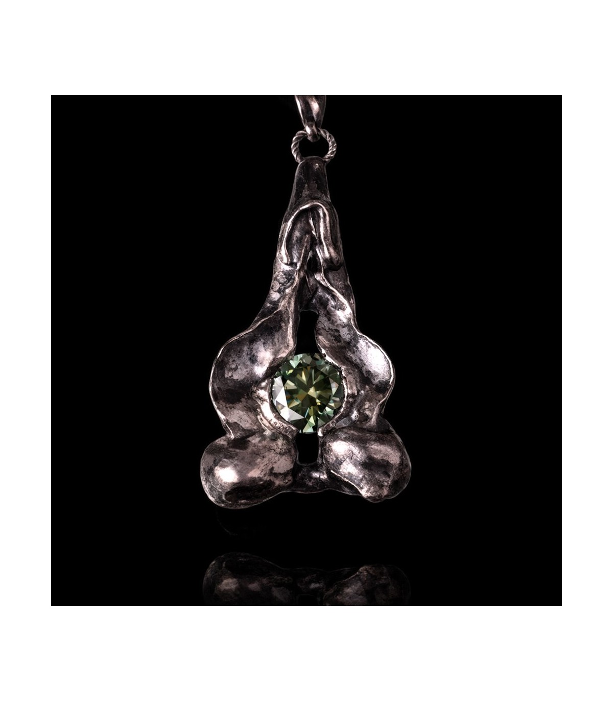 This pendant presents the vagina as a symbol of autonomy and reclaimed power. Its organic silver form is unapologetic, framing a 3-carat moissanite that radiates focused, unwavering light. The stone becomes a statement of presence rather than decoration.