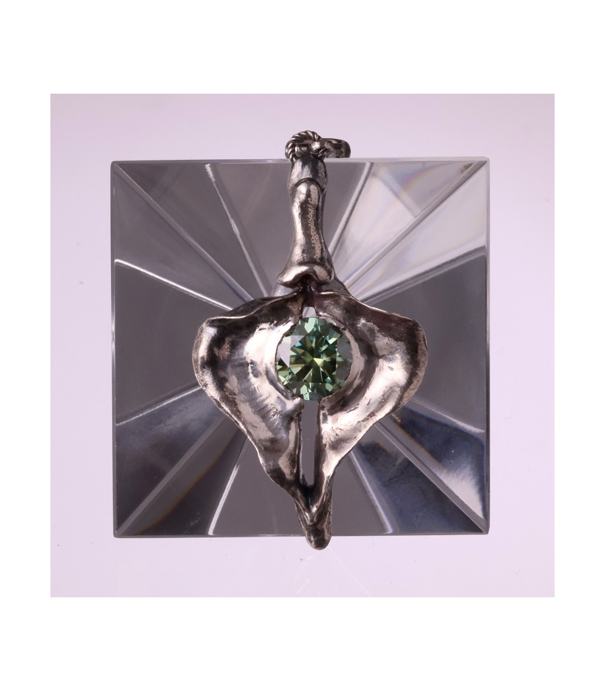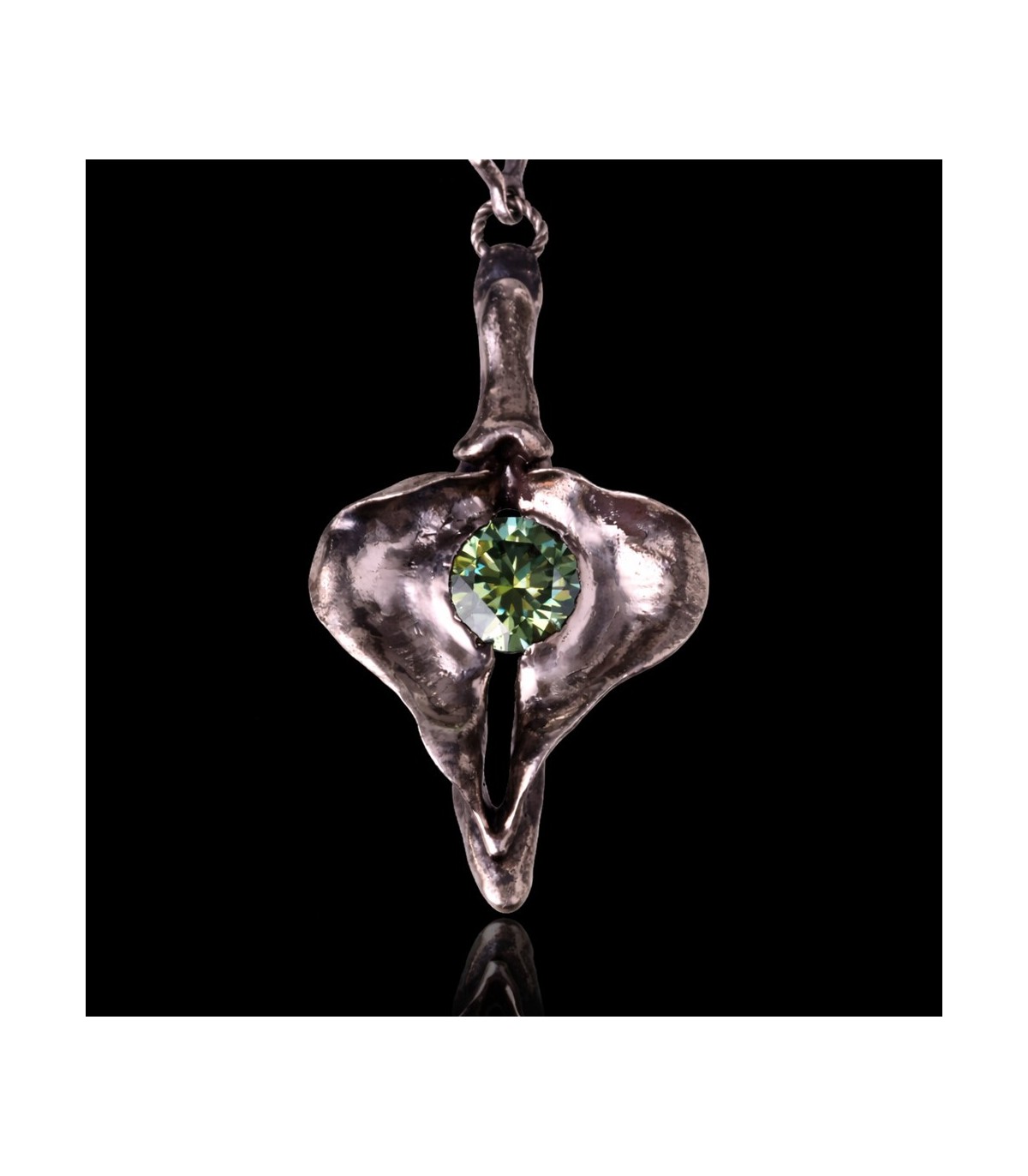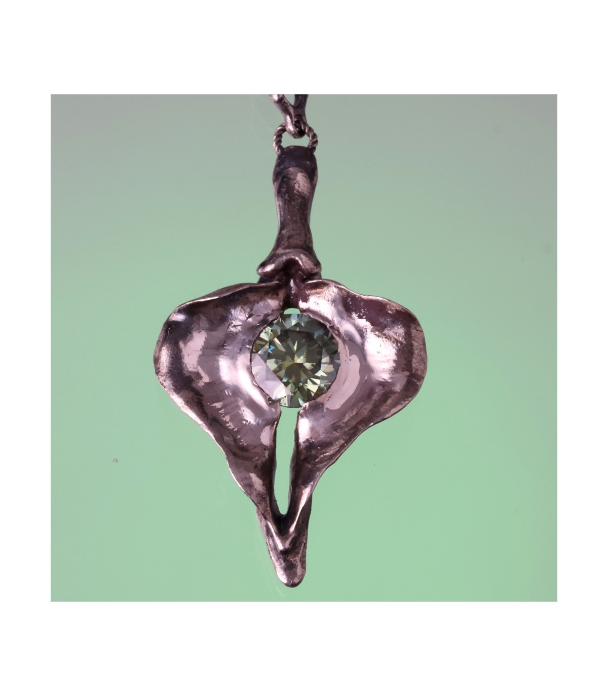 This silver pendant celebrates the vagina as a symbol of constancy and self-possession. Its sculptural shape frames a 3-carat moissanite, whose enduring brilliance mirrors Penelope’s unwavering presence through time and absence.