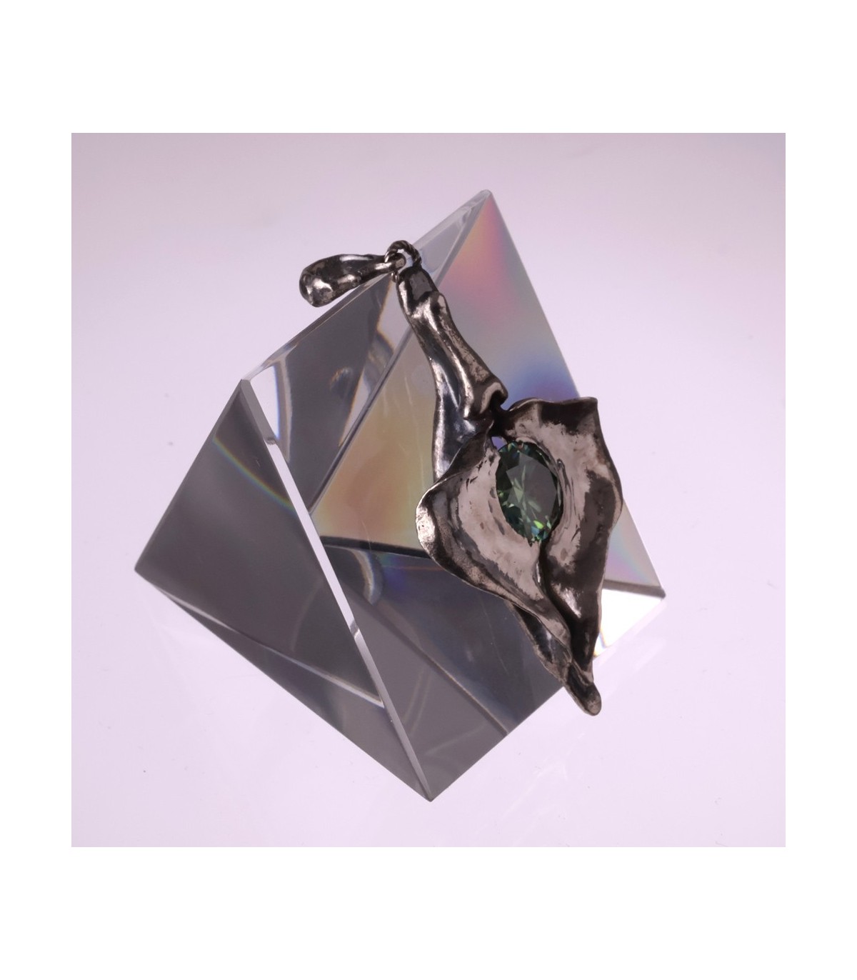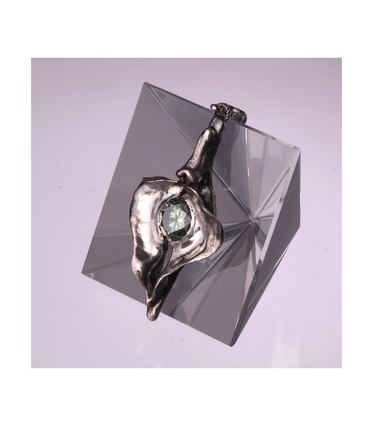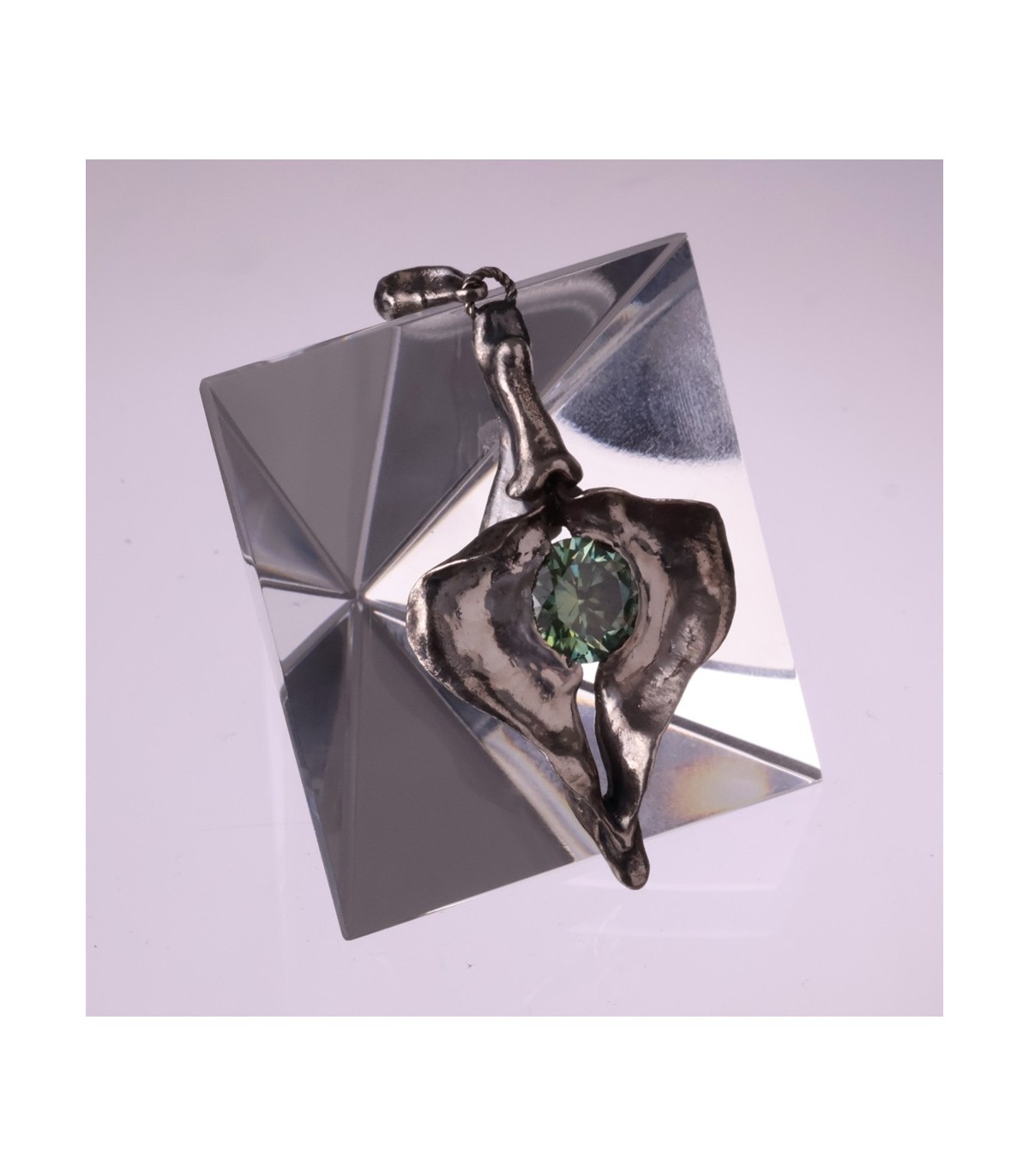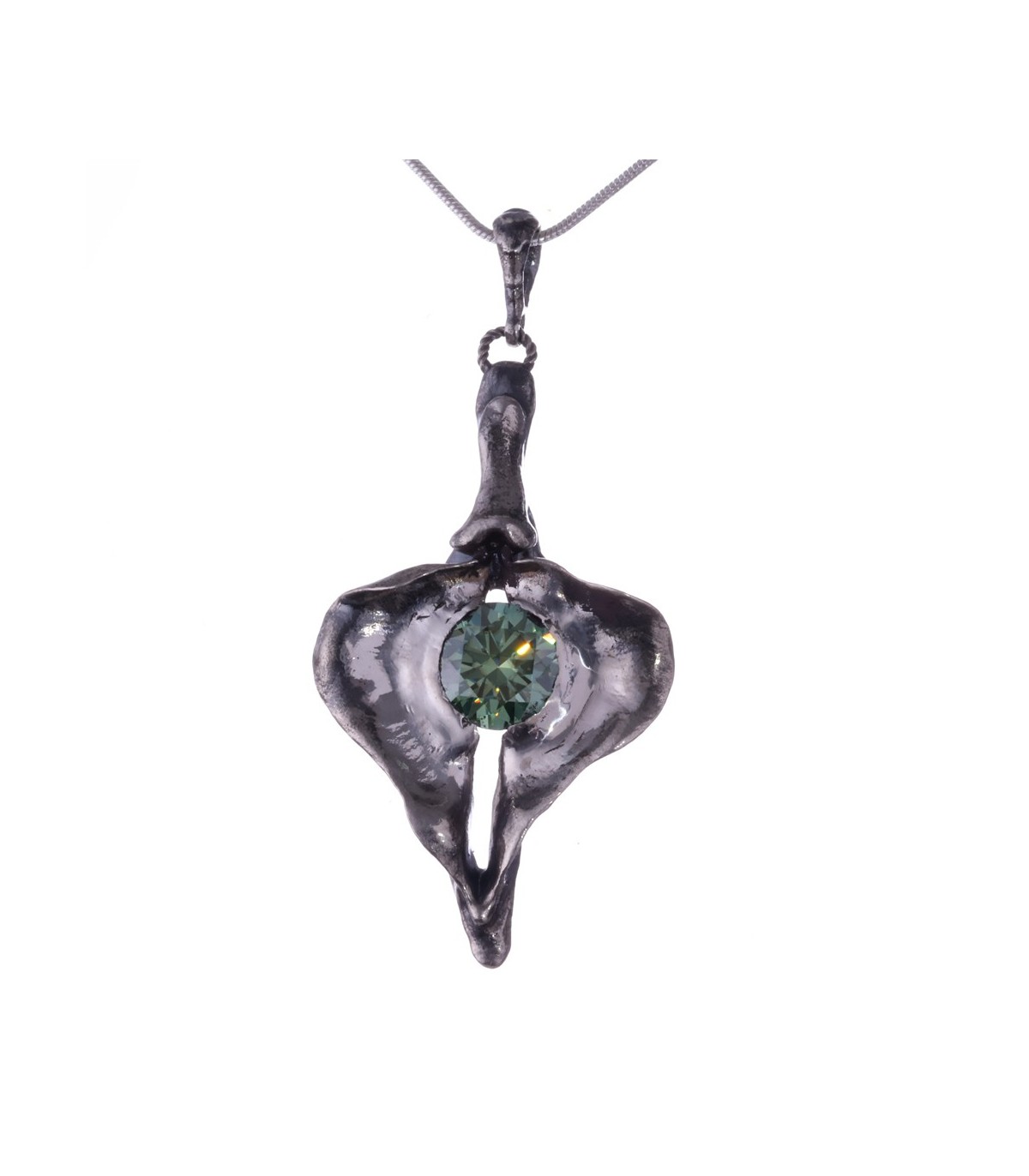 This silver pendant celebrates the vagina as a symbol of constancy and self-possession. Its sculptural shape frames a 3-carat moissanite, whose enduring brilliance mirrors Penelope’s unwavering presence through time and absence.