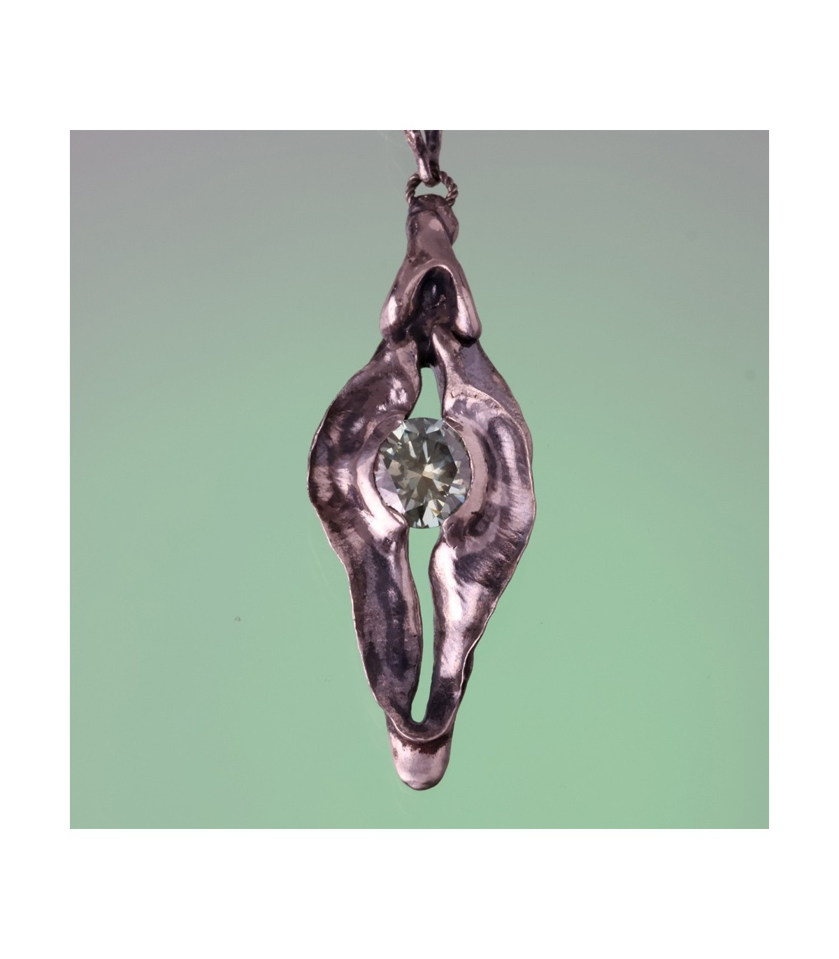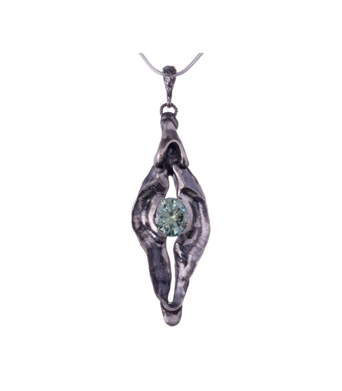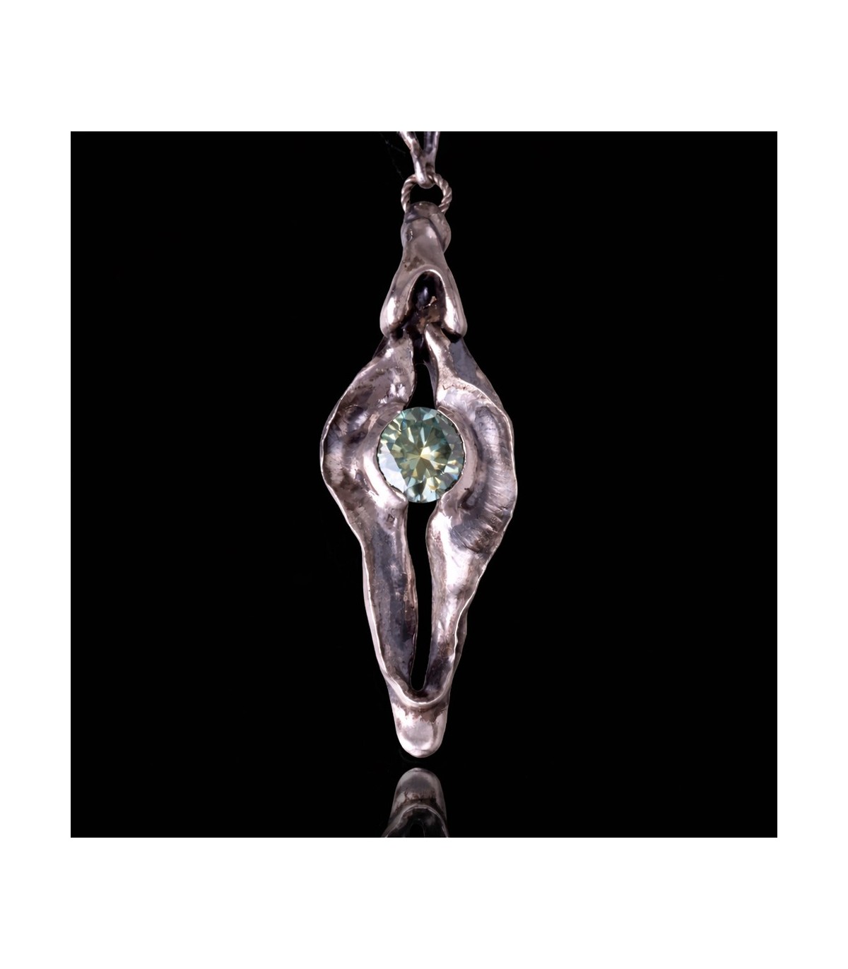 This pendant presents the vagina as the origin of life and potential. The silver form feels fluid and elemental, holding a 3-carat moissanite like a star formed in depth. The stone’s brilliance reflects the idea of life emerging from the feminine source.