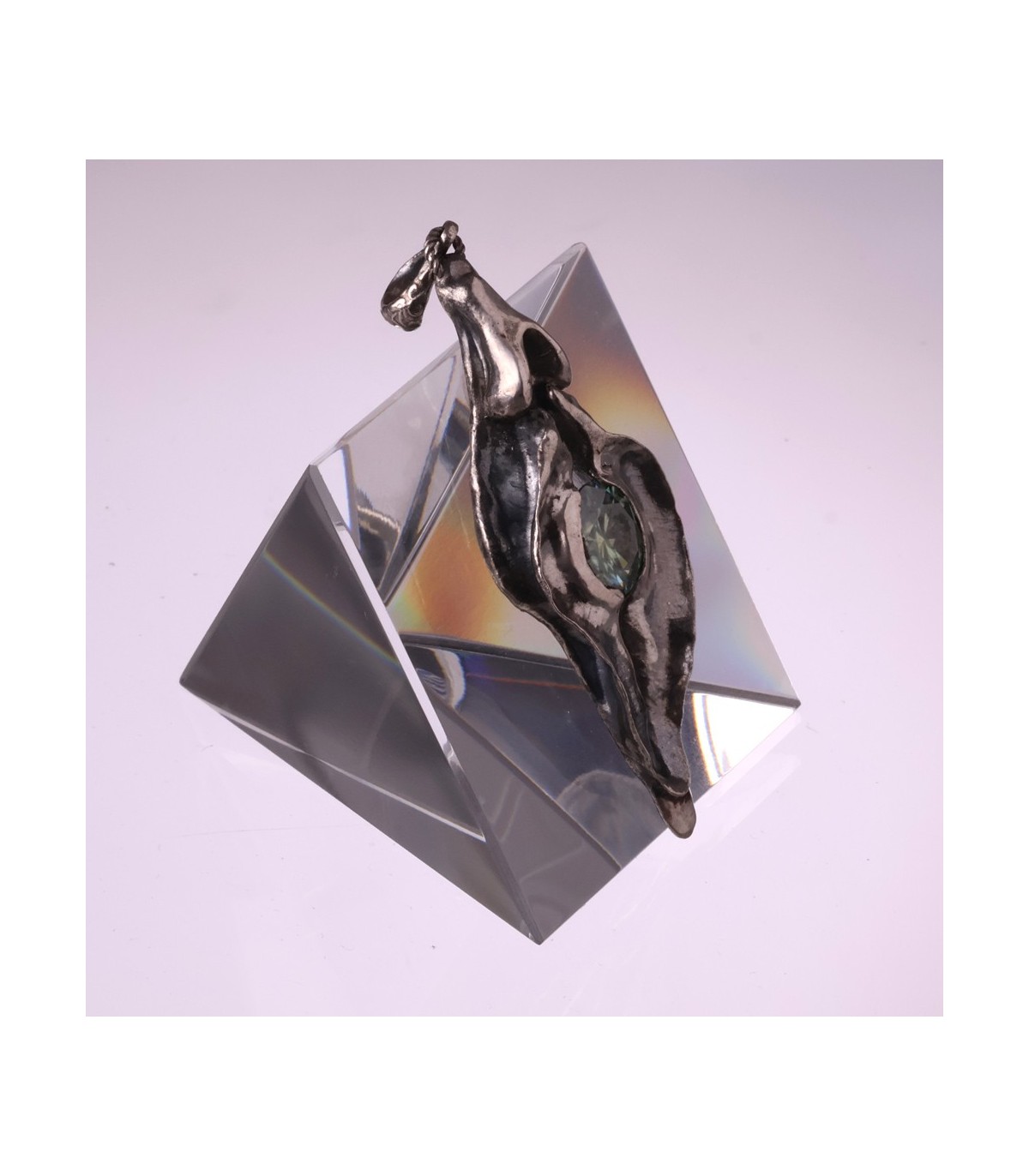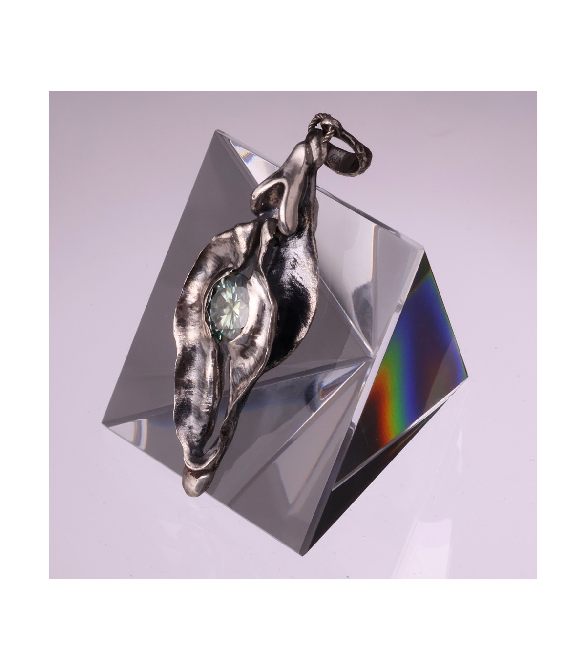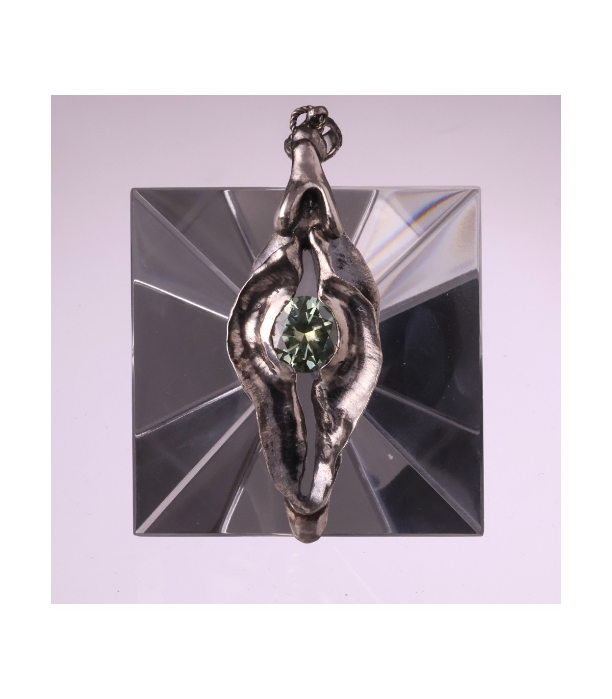 This pendant presents the vagina as the origin of life and potential. The silver form feels fluid and elemental, holding a 3-carat moissanite like a star formed in depth. The stone’s brilliance reflects the idea of life emerging from the feminine source.