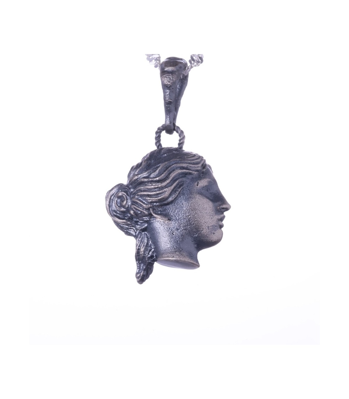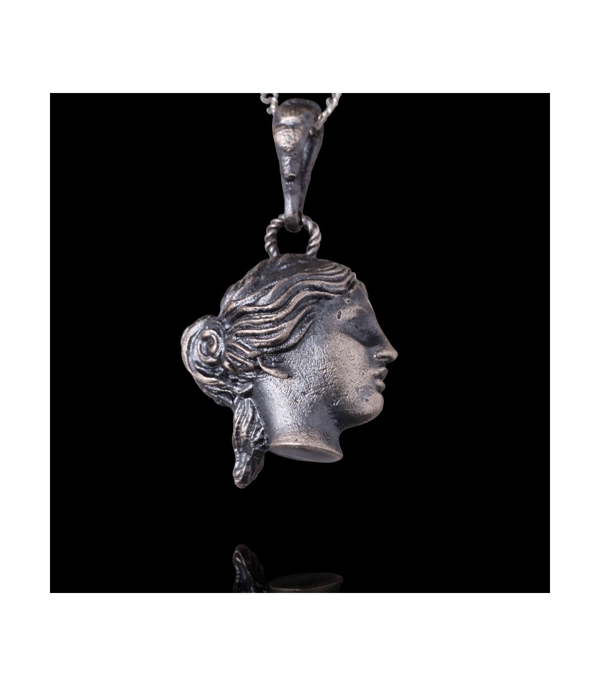 This artfully sculpted silver pendant portrays Artemis, the ancient Greek goddess of the hunt, wilderness, and personal freedom. Artemis embodied independence, strength, and a deep connection to nature, standing apart from societal expectations. The finely carved silver head captures her focused gaze and inner resolve. This pendant is a powerful symbol for those who value autonomy, instinct, and untamed spirit.