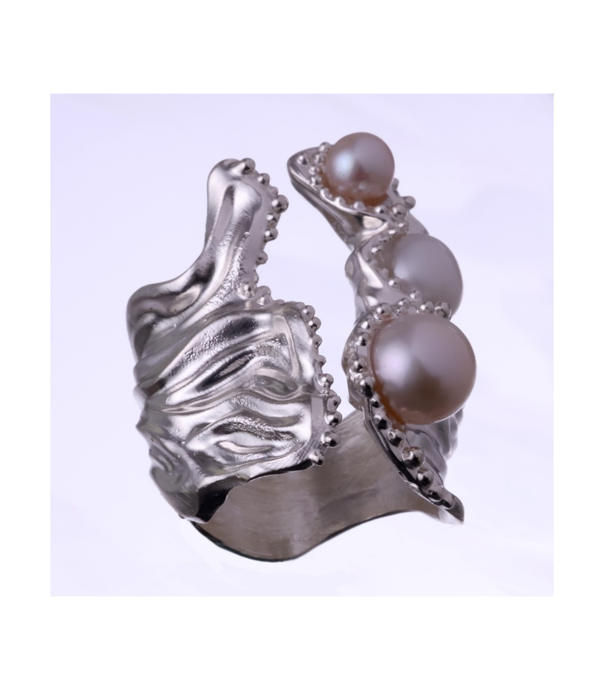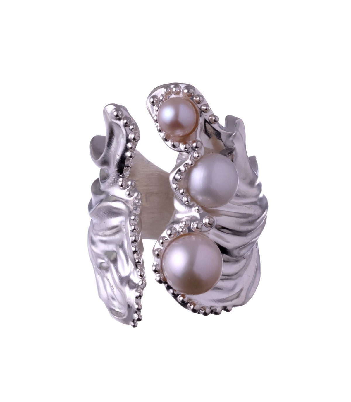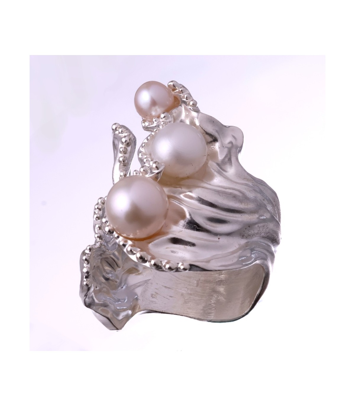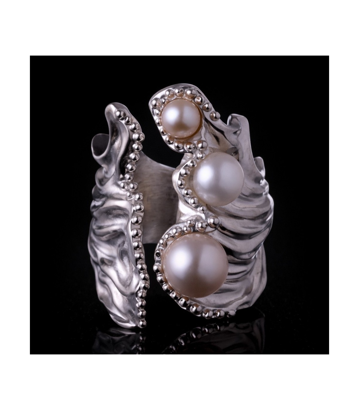 Argentum Marinum is a handcrafted silver ring shaped like a fragment of the sea captured in motion. Flowing, wave-like forms of sterling silver rise and fold around the finger, holding three natural pearls in different sizes. Their subtle variation creates a natural rhythm, as if the pearls were gathered by the tide rather than placed by design. Light moves softly across the silver surface, while the pearls add depth, warmth, and quiet elegance.