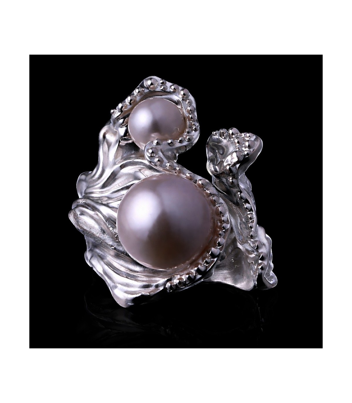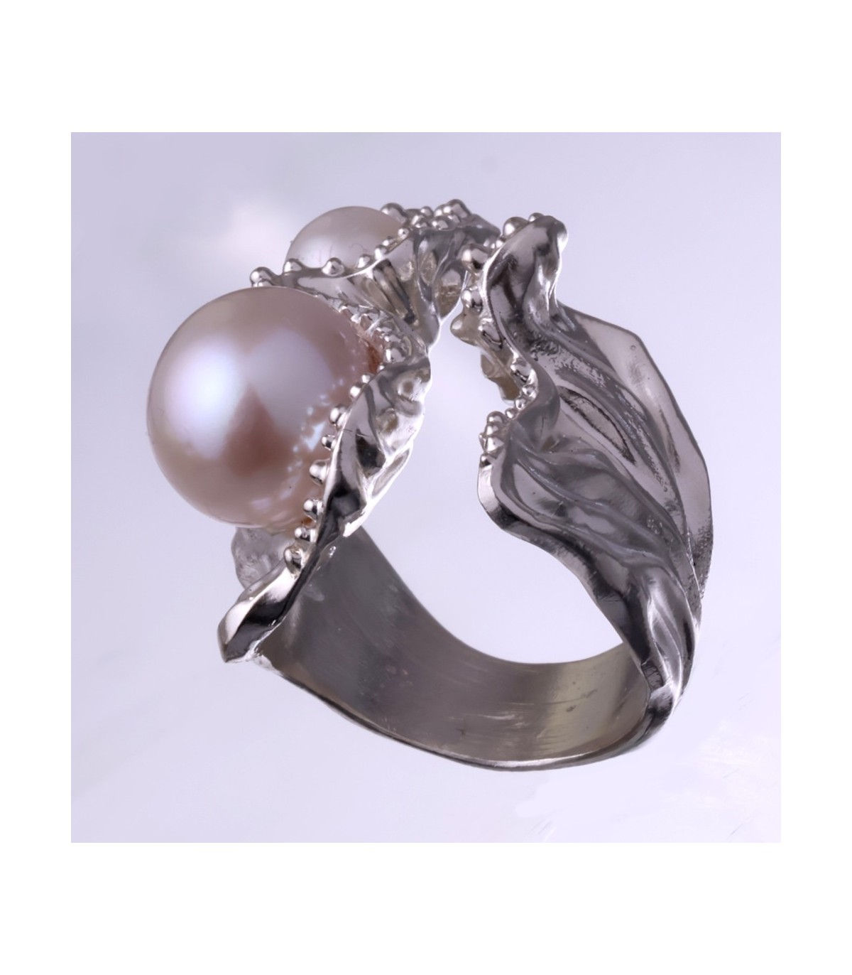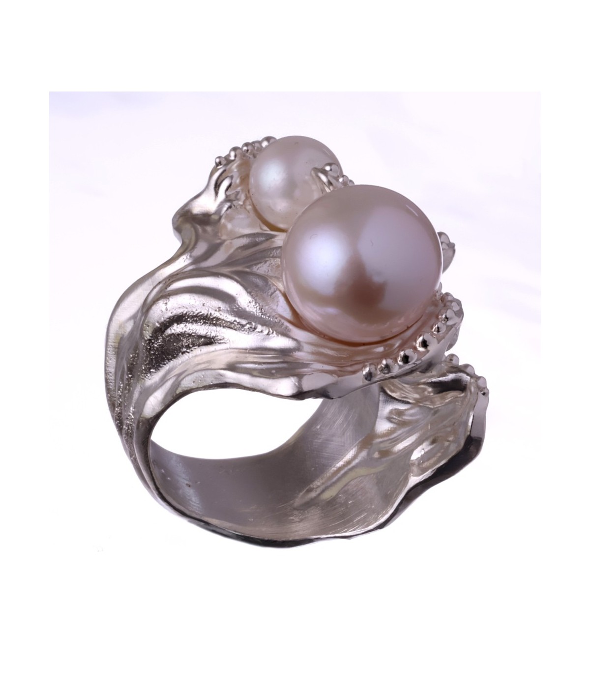 Maris Argentaria is a handcrafted silver ring shaped by the quiet movement of water and light. Flowing, wave-like forms of sterling silver rise from the band and cradle two natural pearls of different sizes. The larger pearl draws the eye with its soft glow, while the smaller one adds balance and rhythm, creating a composition that feels organic rather than symmetrical. The silver surface moves gently, as if shaped by currents, giving the ring a sense of motion even at rest.