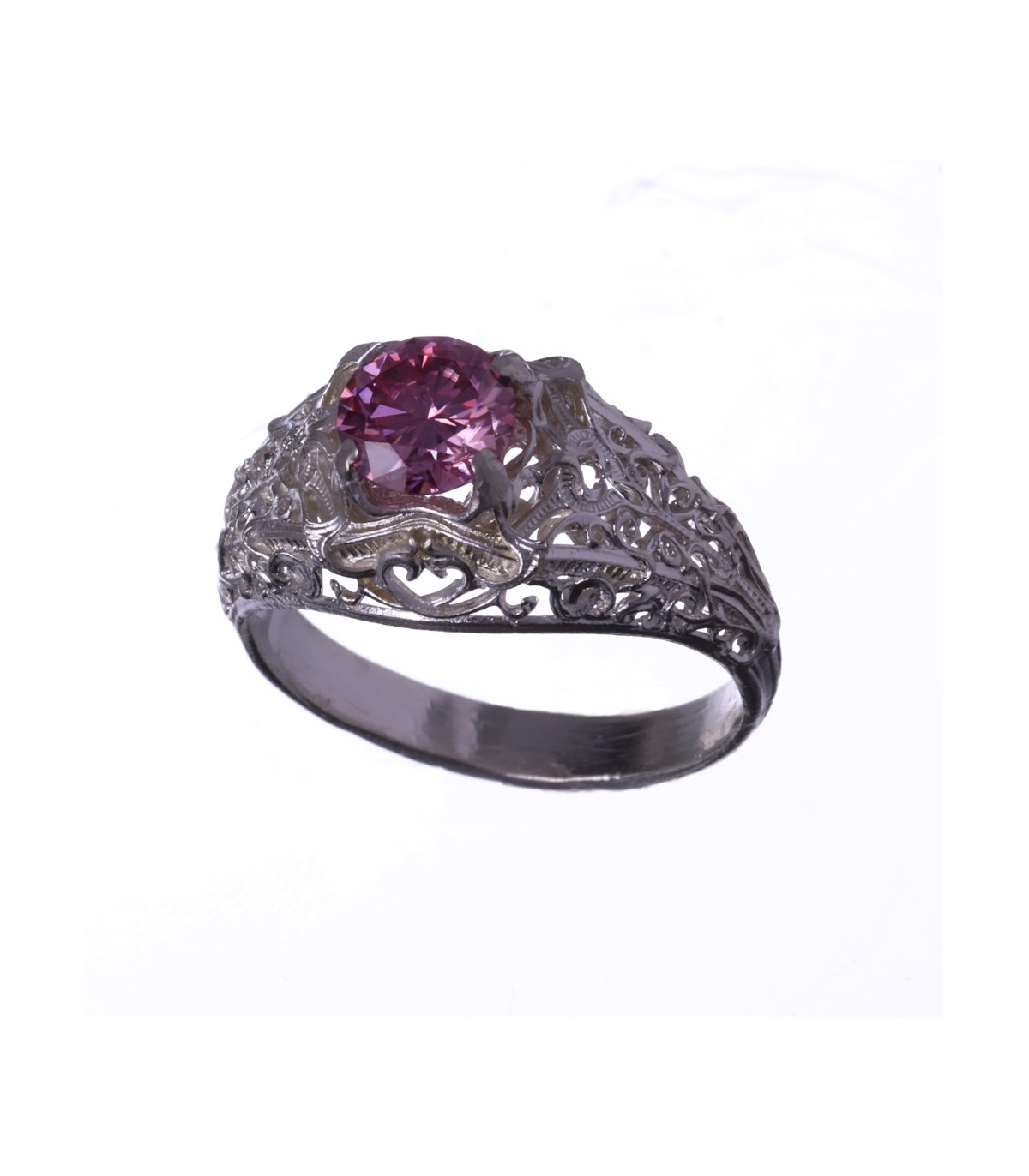 The Ariadne Ring draws directly from this legacy. Handcrafted in 925 sterling silver, the ring is richly sculpted with ornate, flowing engravings that wrap around the band like an unfolding path. The dense ornamentation gives the piece a sense of depth and narrative, as if the silver itself were tracing a story in motion. At its center rests a 1-carat moissanite, set as a point of focus and light.