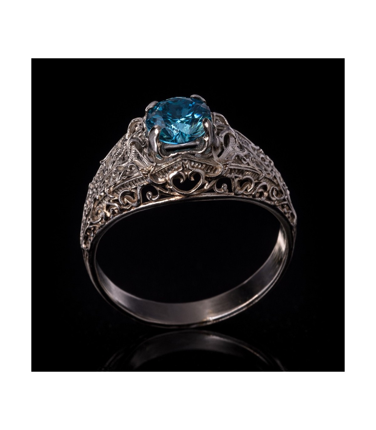 The sculpted silver can be finished in high polish to emphasize elegance and luminosity, or oxidized to deepen shadows and highlight every carved detail. In its darker finish, the ornamentation gains dramatic presence, reinforcing the ring’s mythic and architectural character.