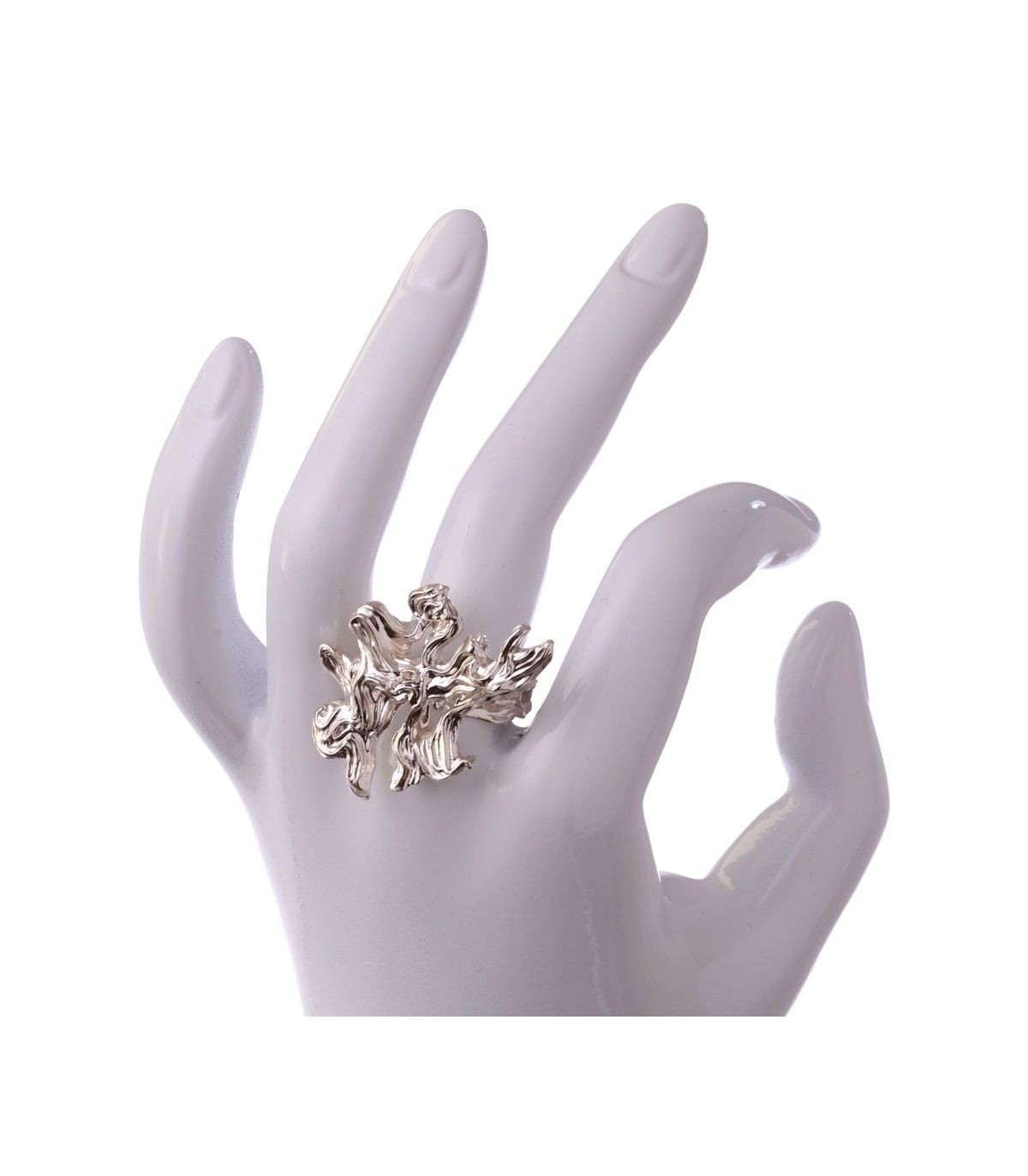 Its carved form feels like a sleeping landscape under snow — present, but quiet. The silver surface flows gently, without sharp aggression, reflecting light softly and peacefully.