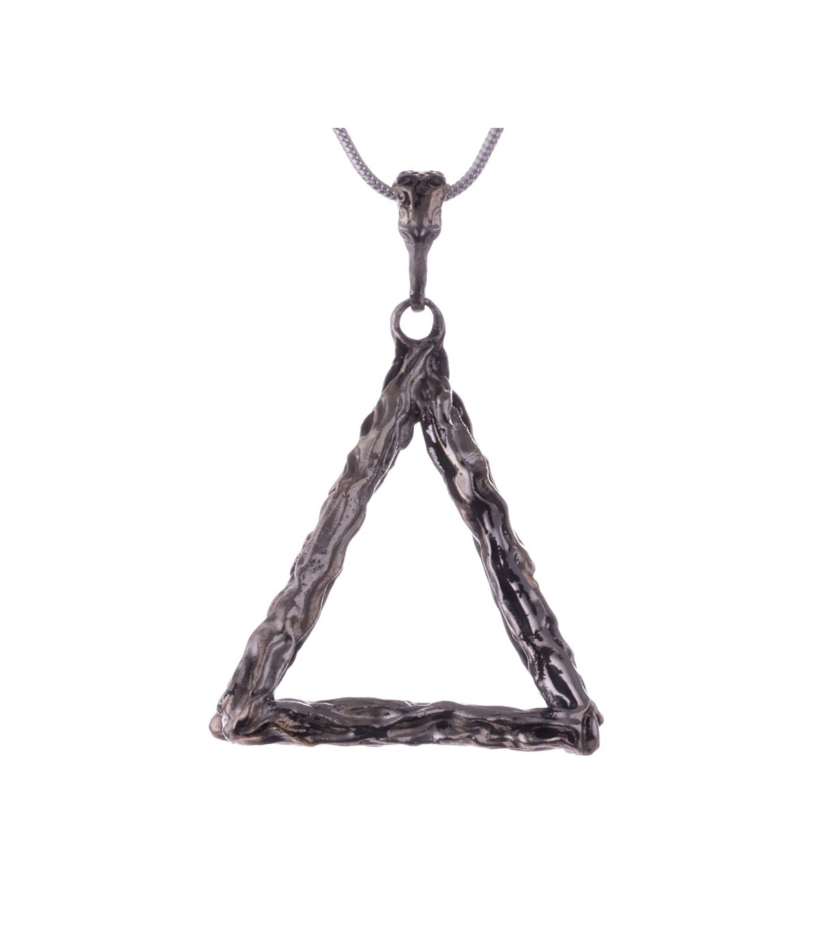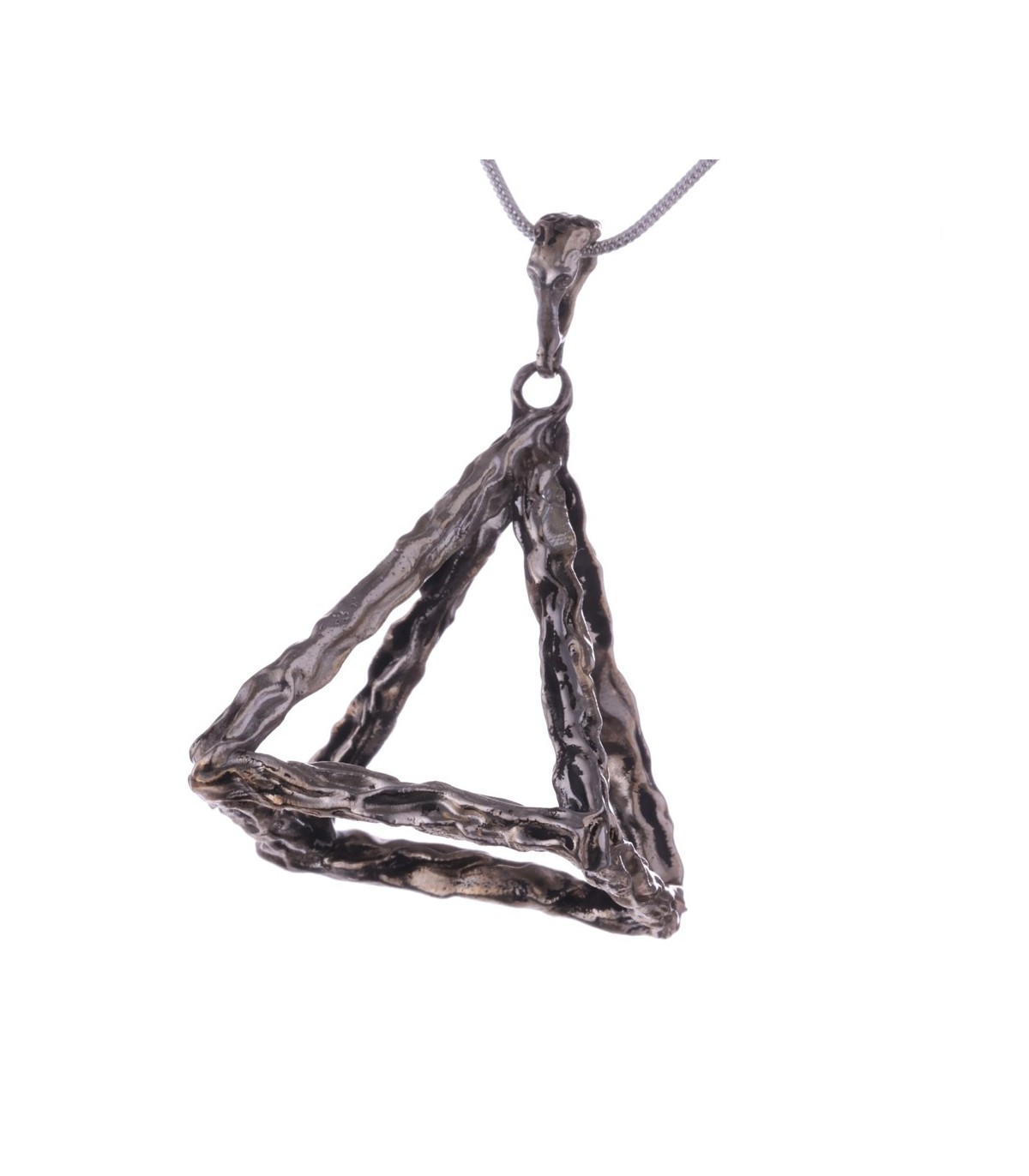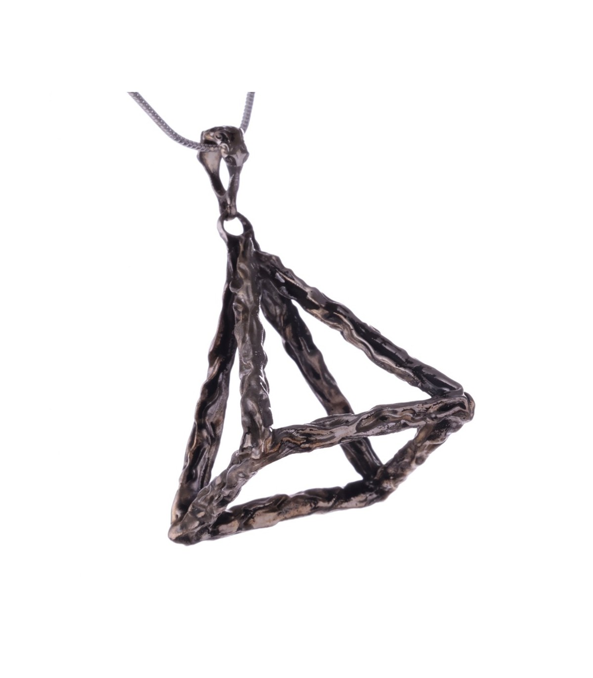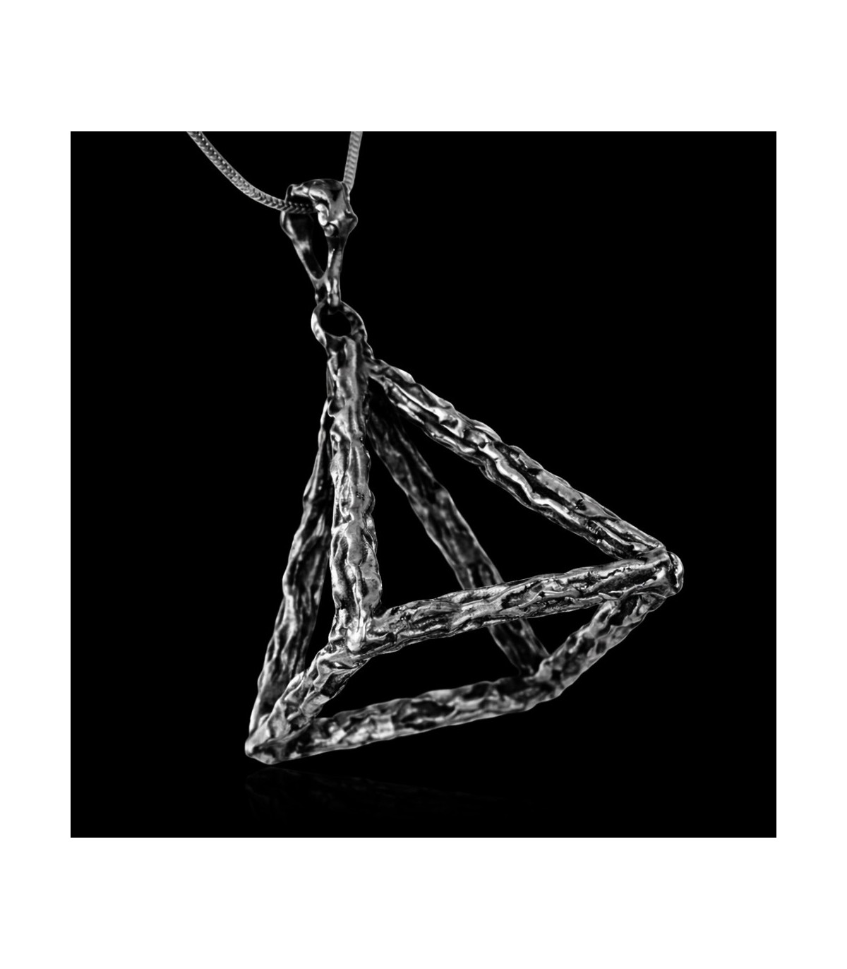 Each line of the pyramid is shaped by hand, resulting in subtle variations that give the pendant depth and individuality. Polished or oxidized finishes highlight different aspects of the sculptural form, from clean reflections to dramatic contrasts.
