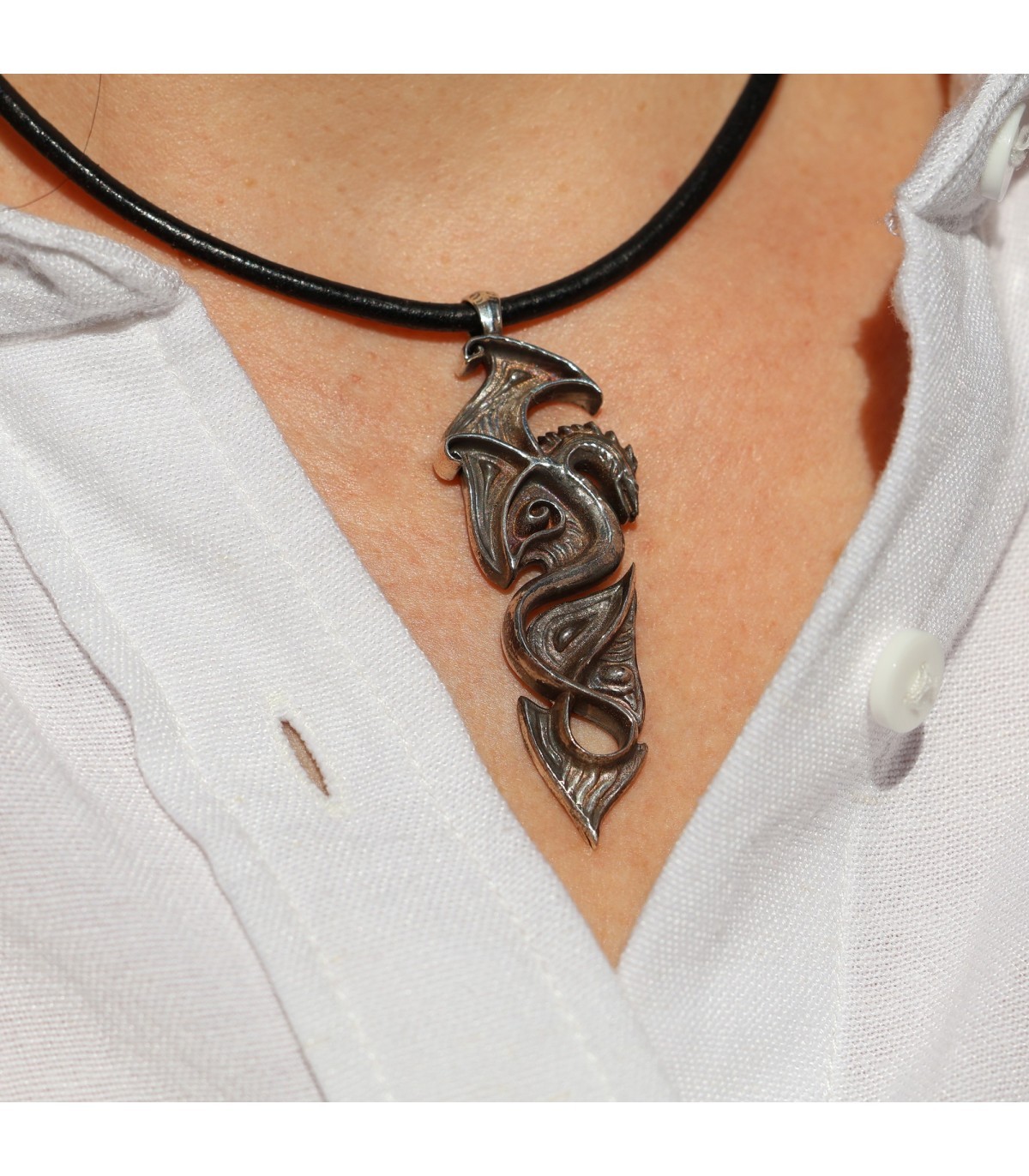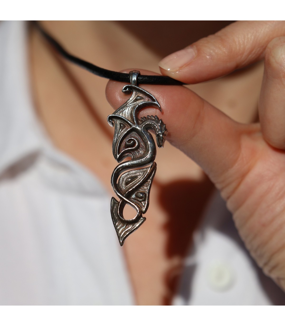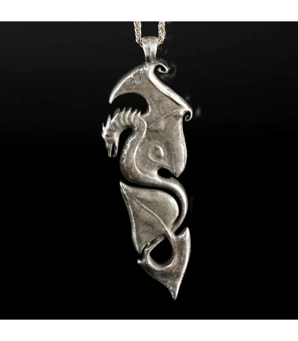 Each detail of this intricate design is meticulously sculpted, giving the pendant elegance and character. The stylized dragon, with wings reminiscent of ancient symbols, radiates a magical energy symbolizing protection and spiritual strength. This is jewelry crafted for those who value strength, freedom, and wish to possess an amulet that highlights their unique style and individuality.